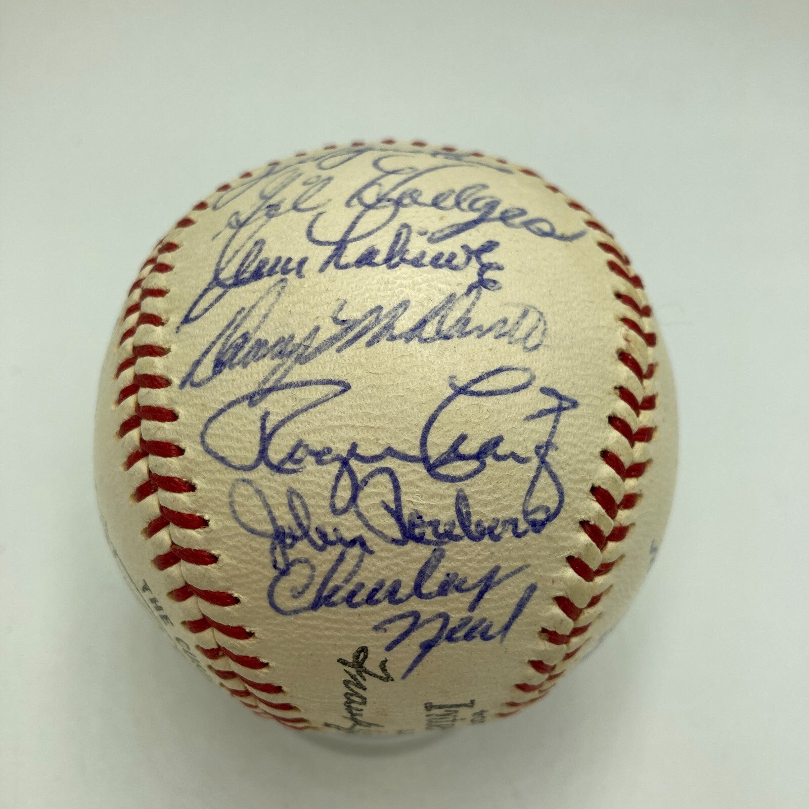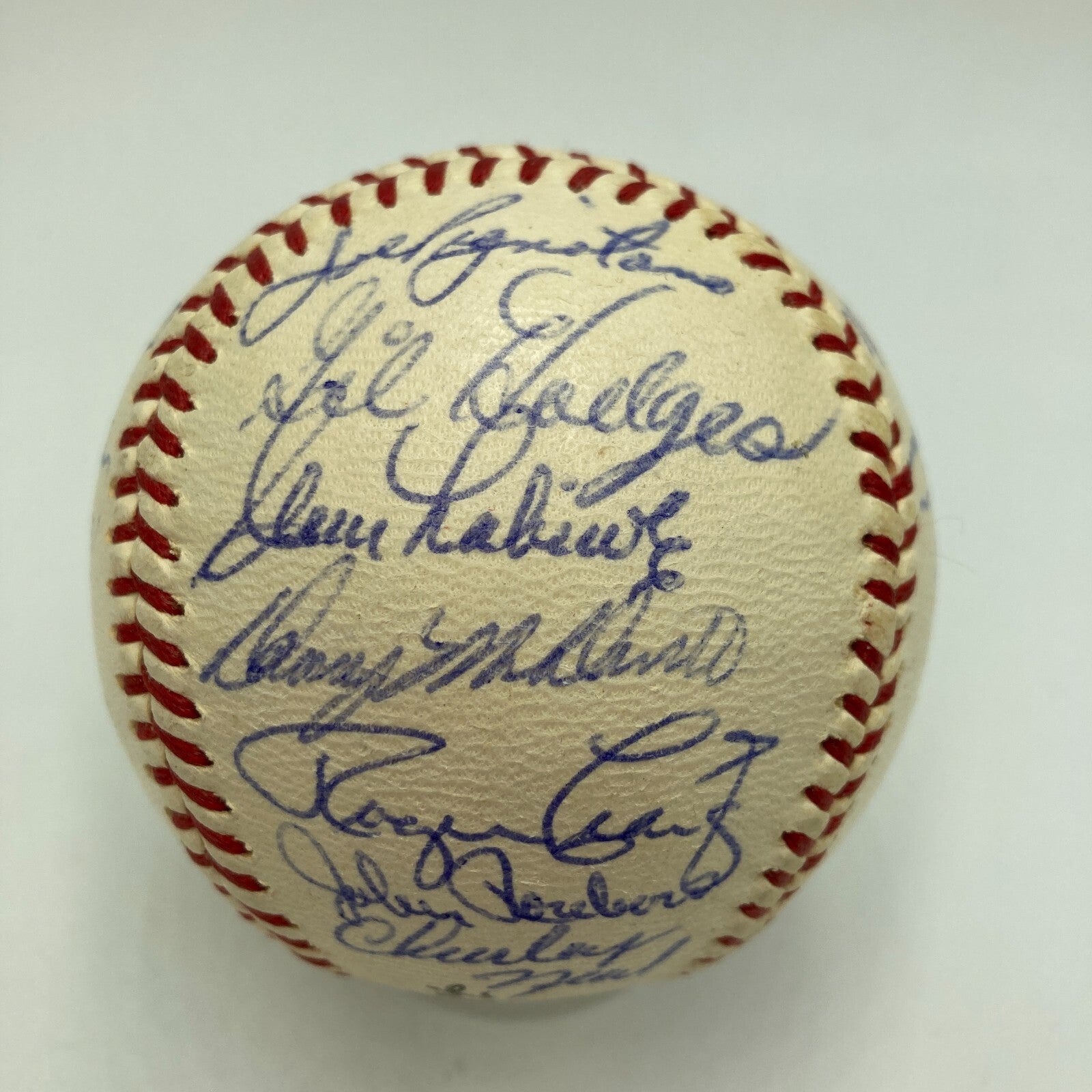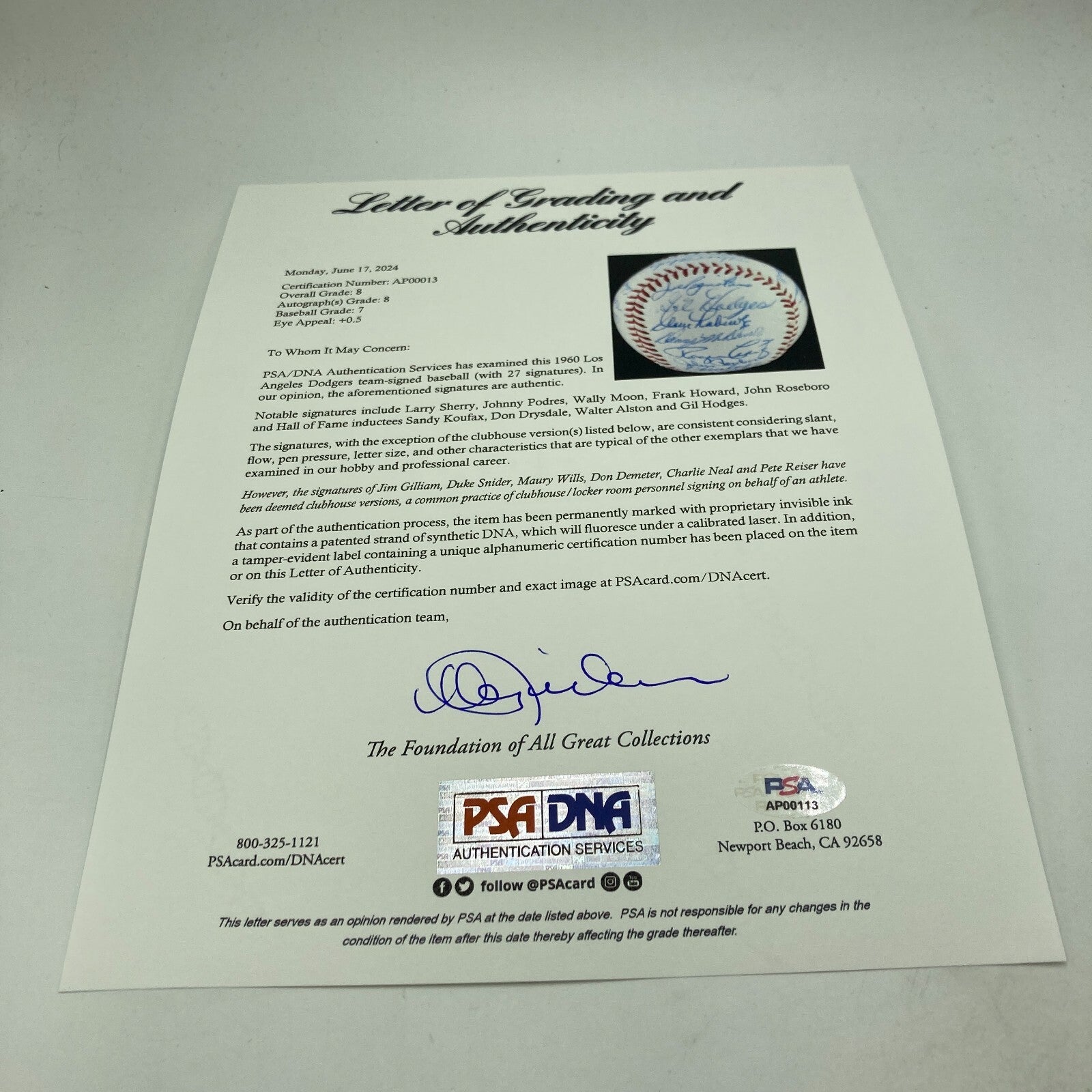 In 1958, the Dodgers moved from Brooklyn to Los Angeles, making 1960 their third season in their new city. Walt Alston was the manager and the 1960 Los Angeles Dodgers finished 4th in the National League. Offered here is a PSA 8 NM-MT baseball that's been signed by many of the 1960 Los Angeles Dodgers including Koufax, Drysdale, Alston, Hodges, Sherry, Podres, Moon, Howard, Roseboro, Pignatano, Craig, McDevitt, Labine, Aspromonte, Sherry, Lillis, Rakow, Williams, Roebuck, Larker and Essegian. Six of the 27 signatures have been deemed Clubhouse including Gilliam, Snider, Wills, Reiser, Demeter and Neal. Baseball comes with a full LOA from PSA with an overall PSA 8 NM-MT grade.