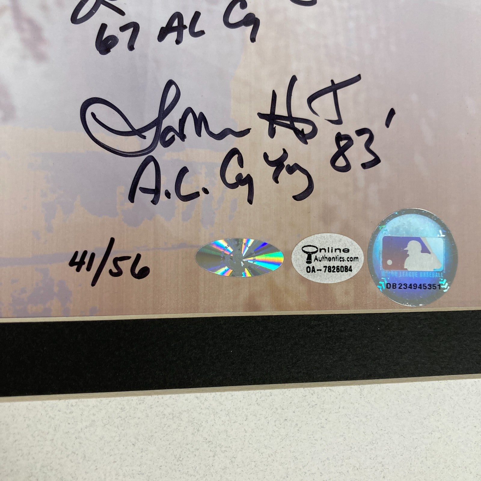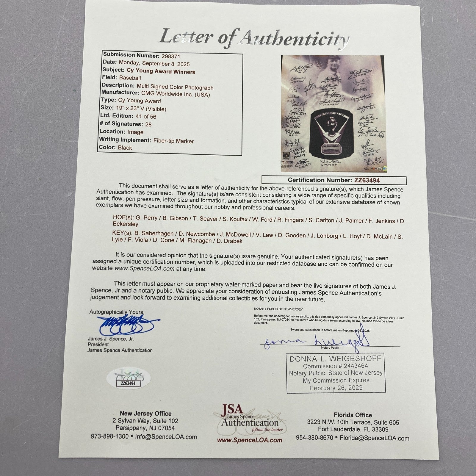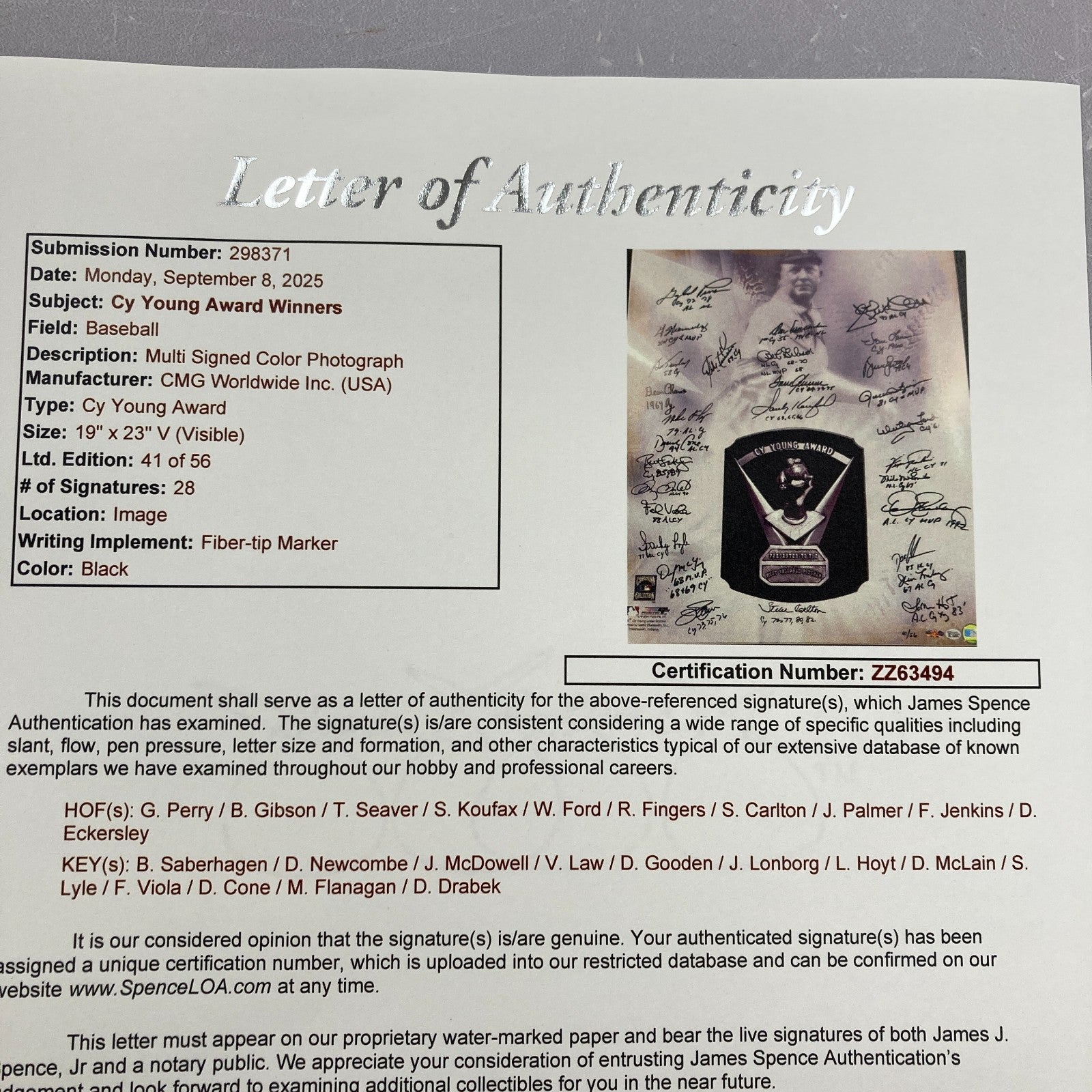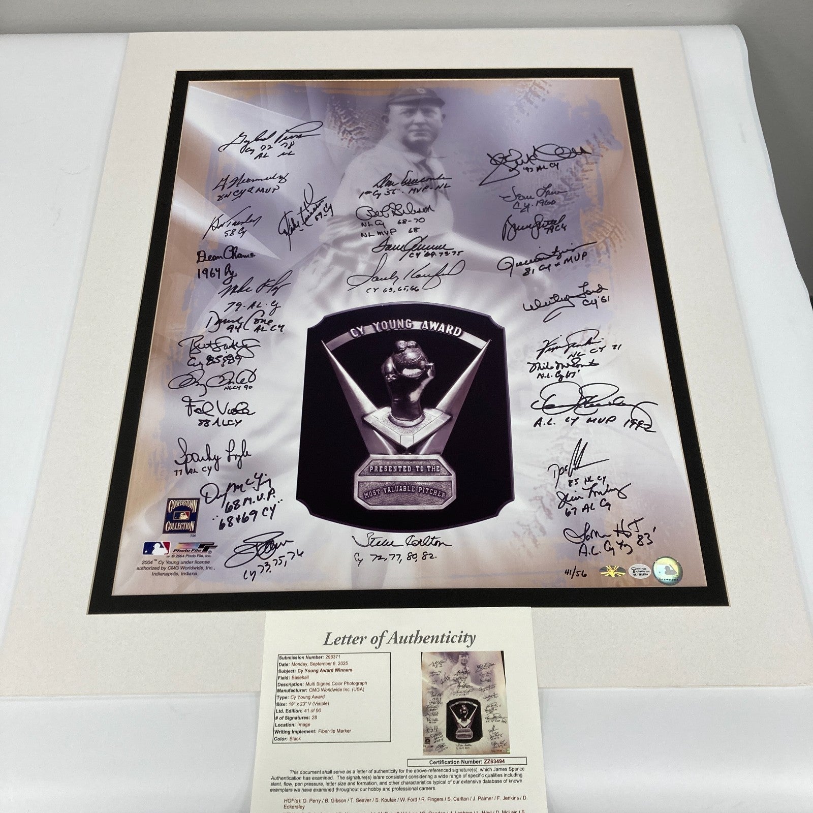 Presented here is an impressive oversized print signed by a nice array of Cy Young Award winners. Matted at 25x29", it includes Mint black sharpie signatures from: Gaylord Perry, Chance, David Cone, Brett Saberhagen, Frank Viola, Denny McLain, Jim Palmer, Steve Carlton, Don Newcombe, Bob Gibson, Tom Seaver, Sandy Koufax, Vern Law, Rollie Fingers, Whitey Ford, Fergie Jenkins, Dennis Eckersley, Doc Gooden and others. Hand numbered at 41/56.