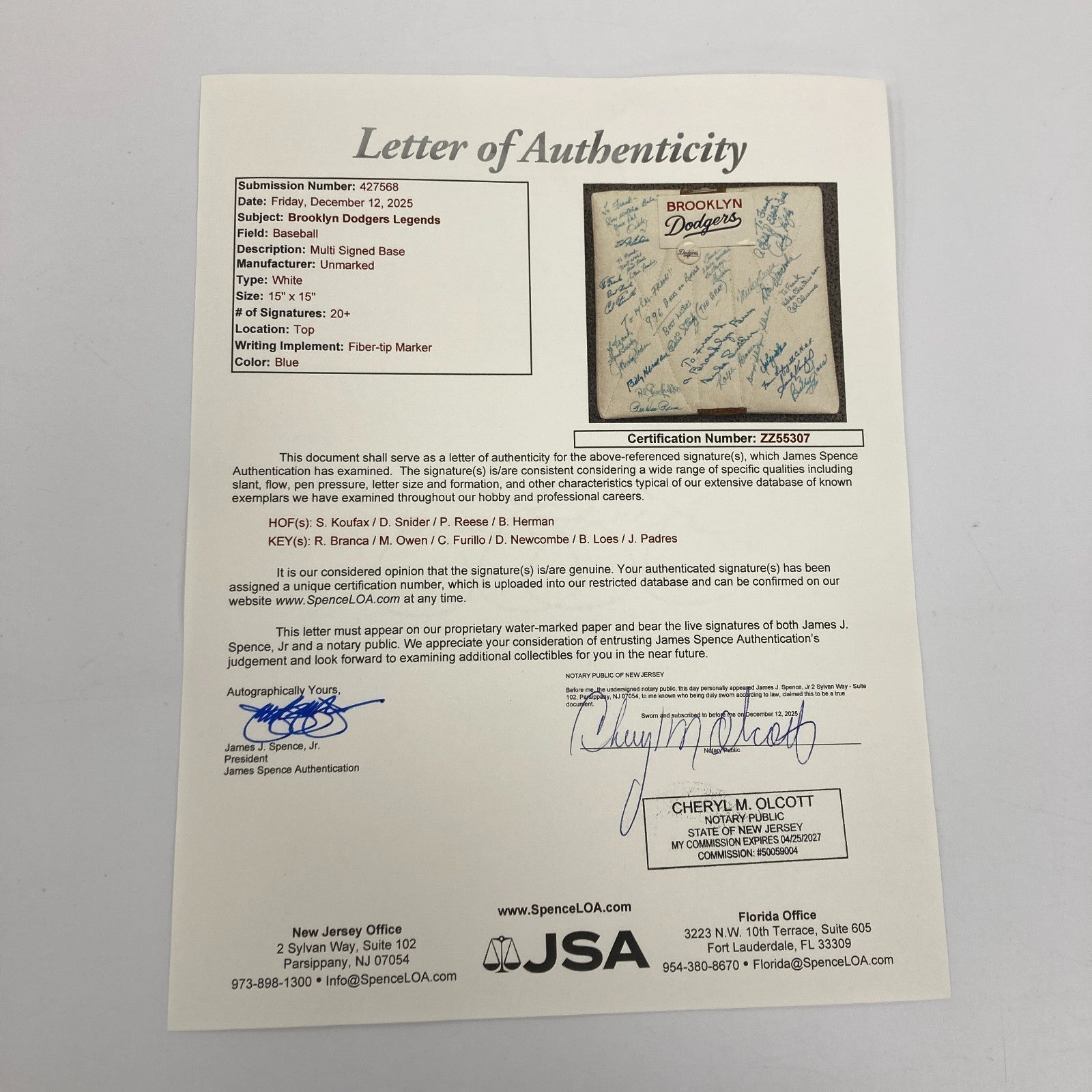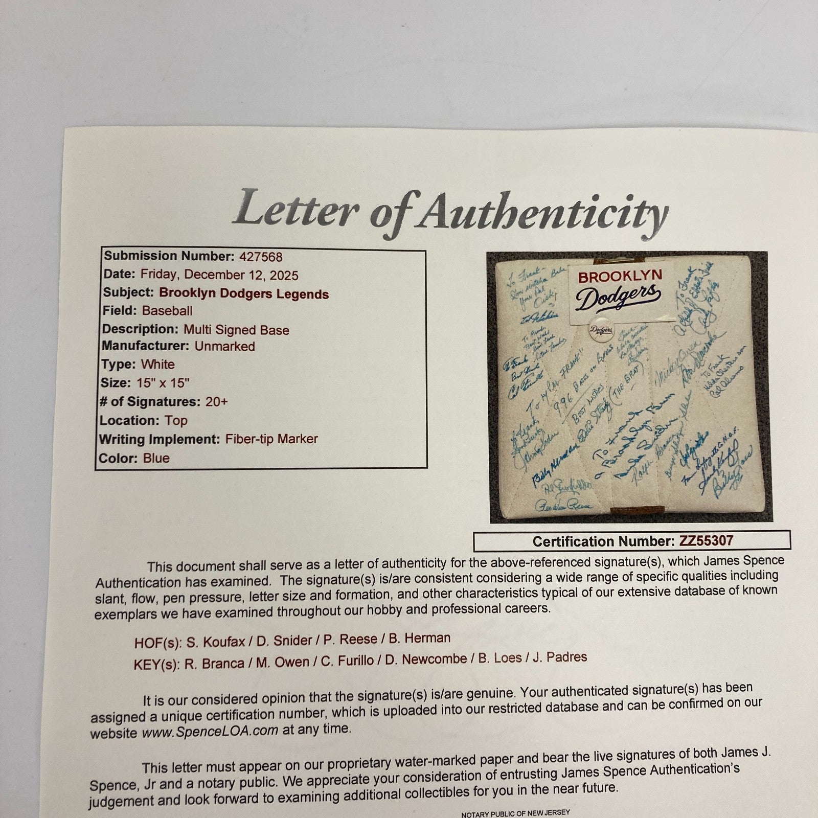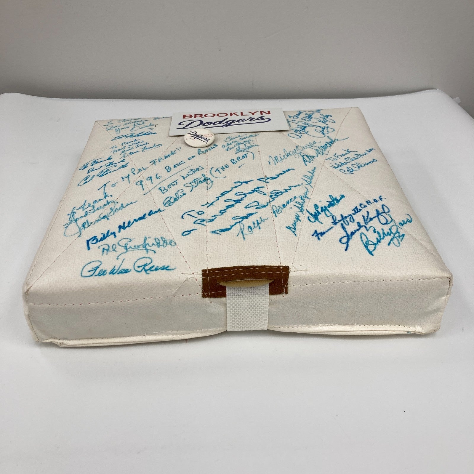 Brooklyn Dodgers legends signed base. This base has been signed by 20 Brooklyn Dodgers legends, including Sandy Koufax, Pee Wee Reese, Carl Furillo, Duke Snider, Ralph Branca, Johnny Podres, Billy Herman, Al Gionfriddo, Clem Labine, Joe Pignatano, Billy Loes, George Shuba, Cal Abrams, Mickey Owen, Don Newcombe, Andy Pafko, Eddy Stanky, Carl Erskine, and Steve Lembowith. The signatures are in blue ink.Sandy Koufax included a one-of-a-kind inscription with his signature that reads, "From Lafayette to the H.O.F." Koufax attended Lafayette High School before he became a Big League superstar. A thin metal plate that includes the Dodgers logo is affixed to the base. The plate measures 3.5x6". The base is 15x15" and is in very good condition.