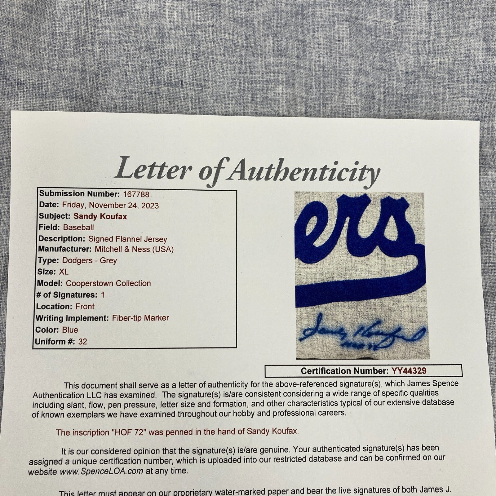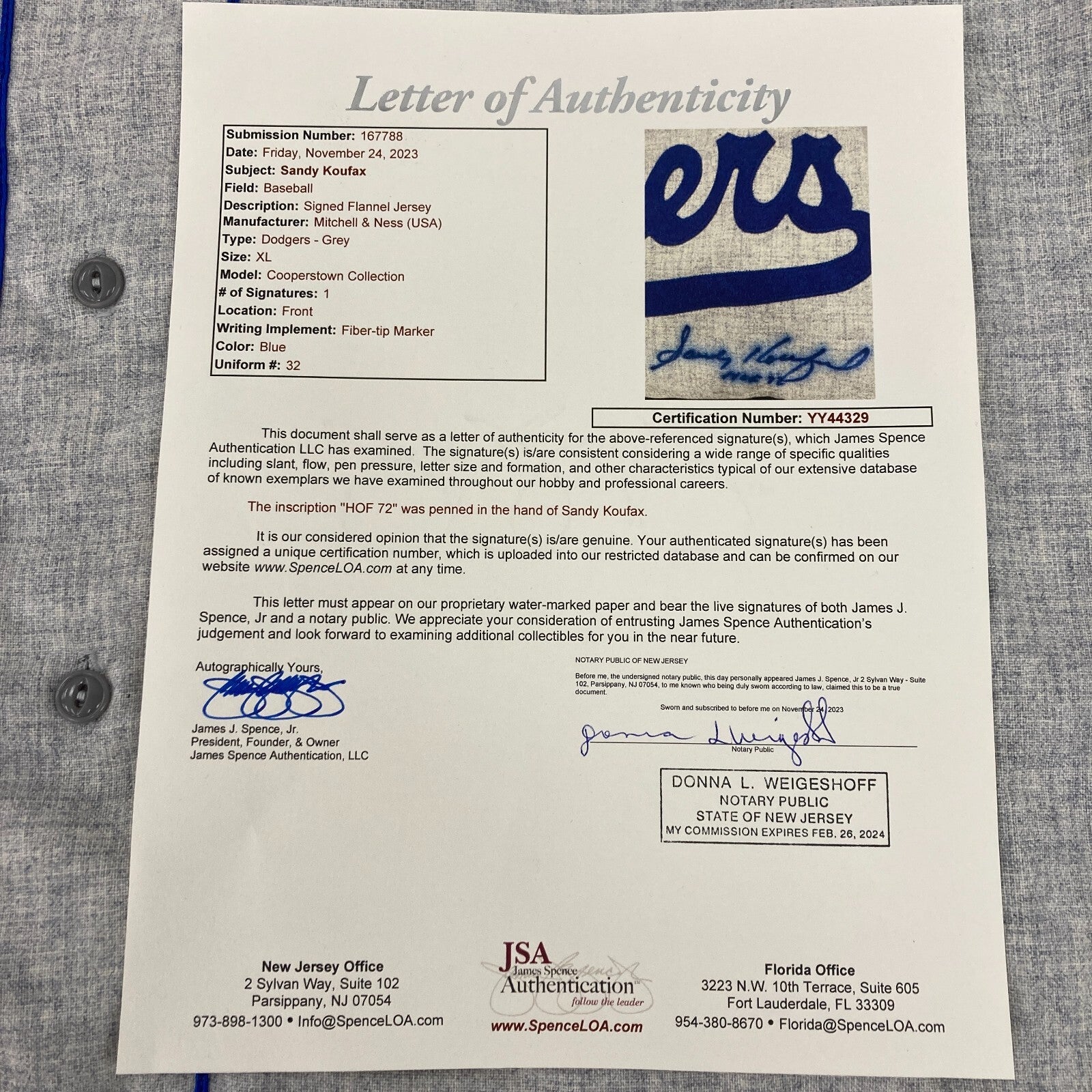Click or scroll to zoom Tap or pinch to zoom Click or scroll to zoom Tap or pinch to zoom Click or scroll to zoom Tap or pinch to zoom Click or scroll to zoom Tap or pinch to zoom Click or scroll to zoom Tap or pinch to zoom Click or scroll to zoom Tap or pinch to zoom Click or scroll to zoom Tap or pinch to zoom Click or scroll to zoom Tap or pinch to zoom Sandy Koufax Hall Of Fame 1972 Signed Authentic Brooklyn Dodgers Jersey JSA COA $2,499.00 1 2 3 4 5 6 7 8 9 10+ Quantity Quantity Add to cart This item is a recurring or deferred purchase. By continuing, I agree to the cancellation policy and authorize you to charge my payment method at the prices, frequency and dates listed on this page until my order is fulfilled or I cancel, if permitted. Sandy Koufax Hall Of Fame 1972 Signed Inscribed Authentic Mitchell & Ness Brooklyn Dodgers Jersey. Comes with full letter COA from JSA. T#10
