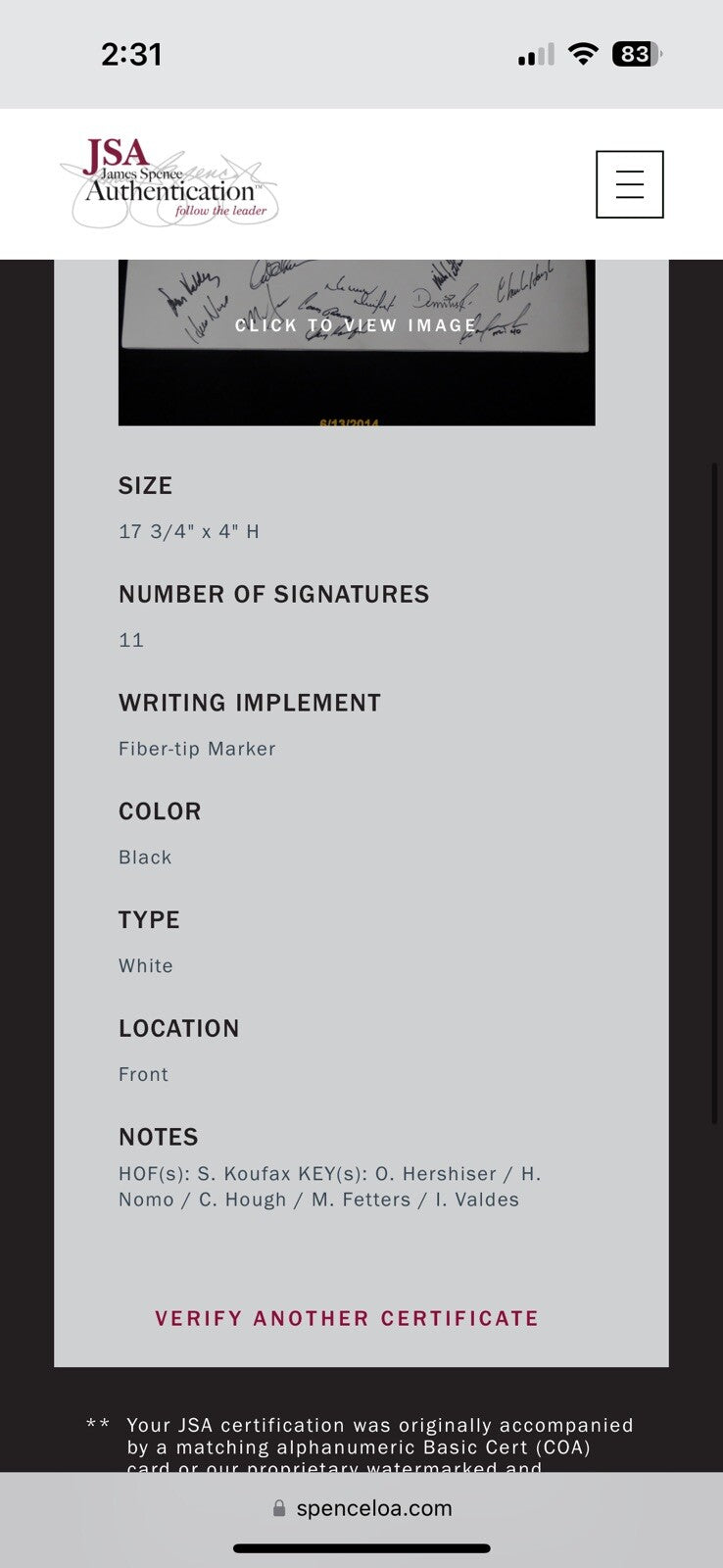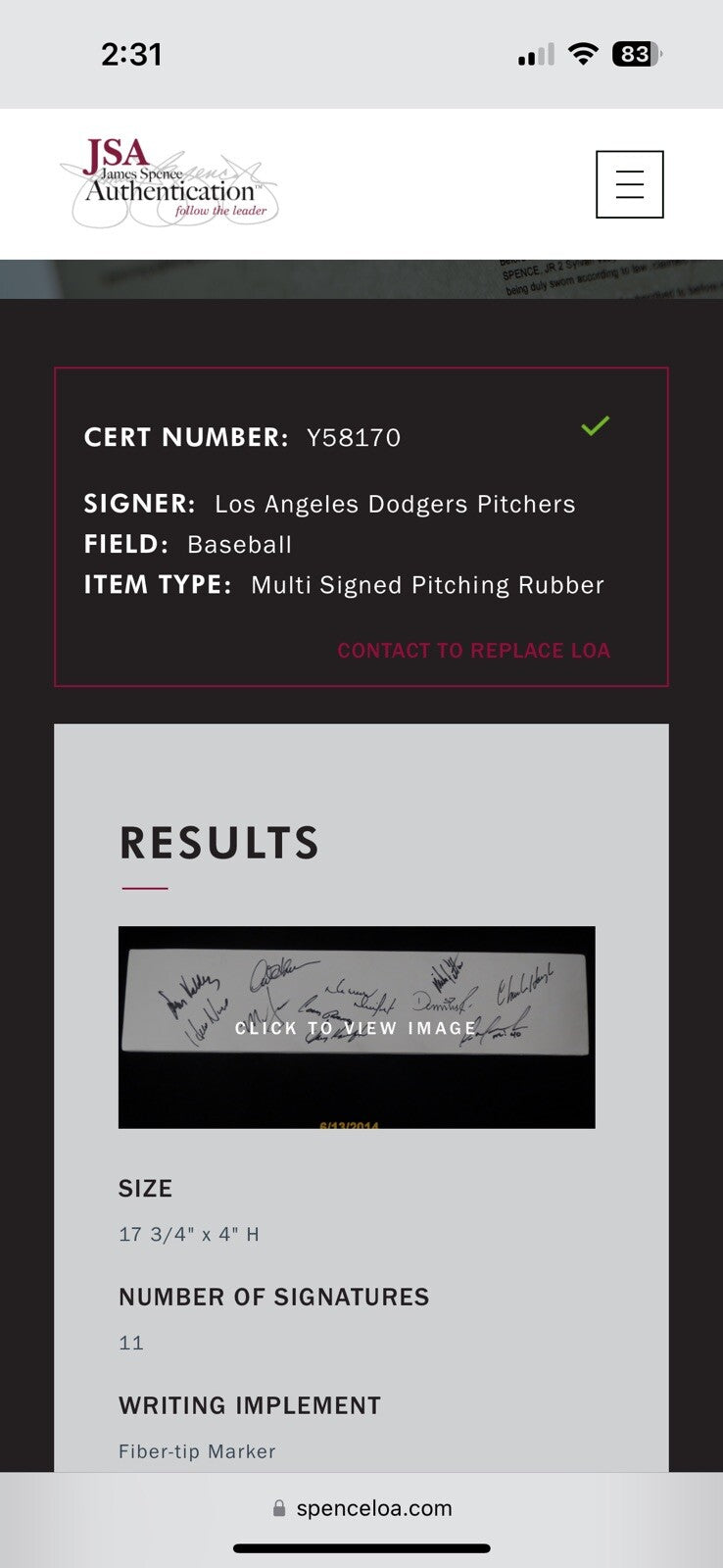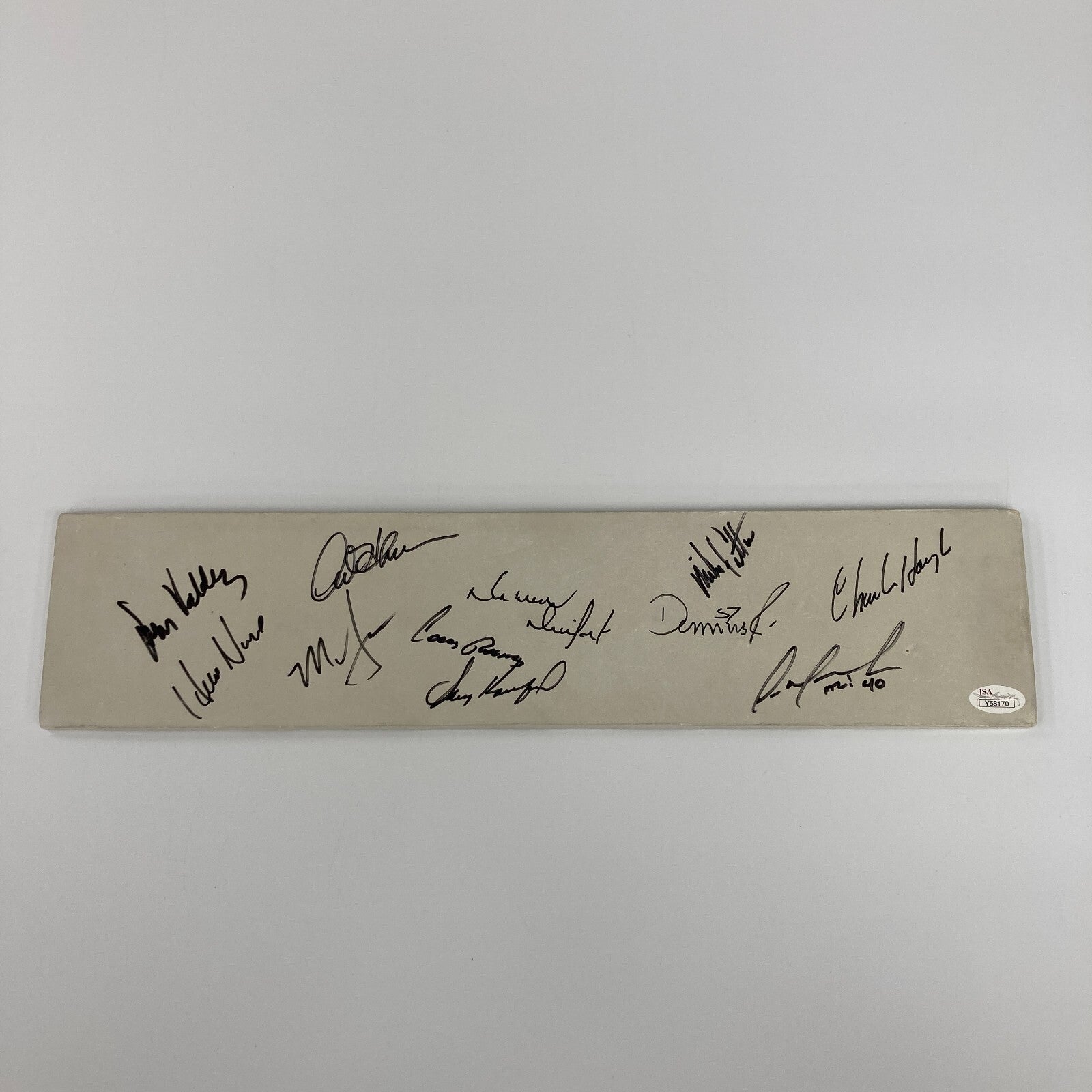This autographed pitching rubber is a must-have for any Los Angeles Dodgers or baseball fan. Featuring the signatures of legendary Dodgers players Sandy Koufax, Orel Hershiser, Hideo Nomo, Darren Dreifort, Charlie Hough, Dennys Reyes, Ismael Valdez, Mike Judd, Onan Masaoka, and Mike Fetters, this original and authentic item will surely be a prized possession in any memorabilia collection. Perfect for displaying in a man cave, sports room, or office, this item is a true one-of-a-kind treasure. Comes with sticker from JSA #Y58170. Does not have JSA letter.