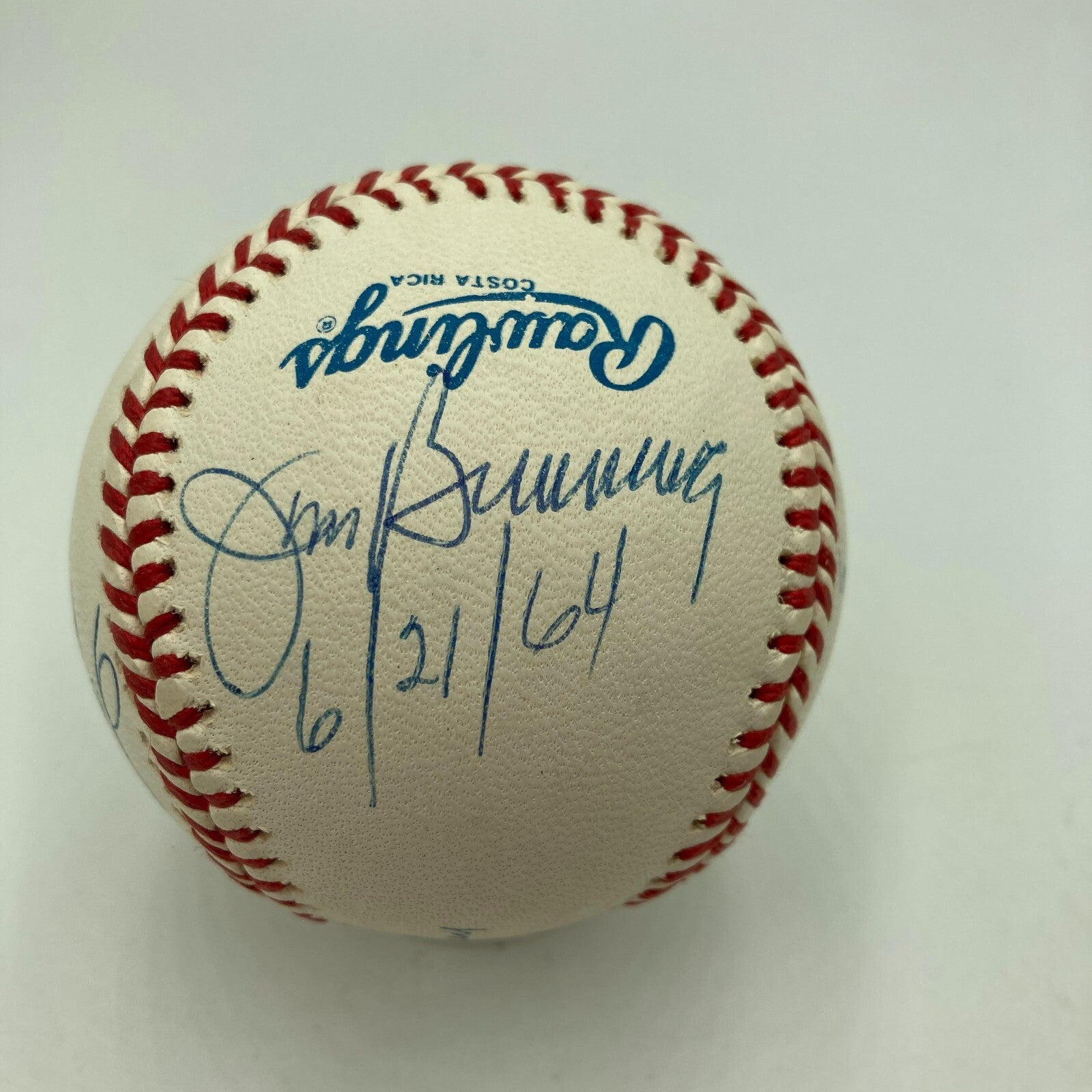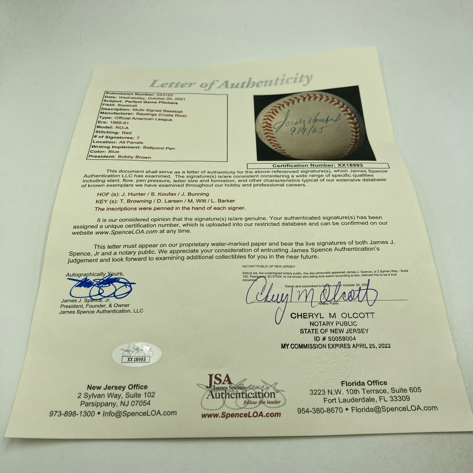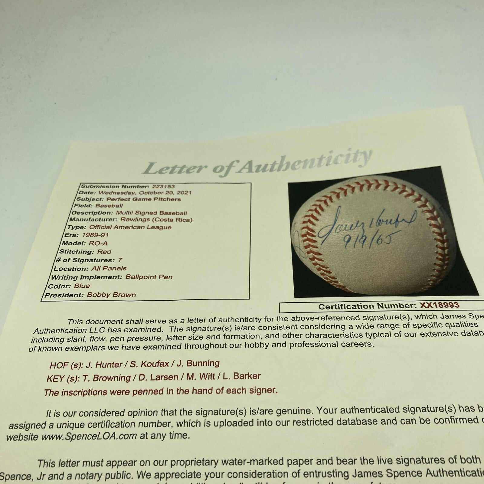 MLB Perfect Game Pitchers multi signed Official American League Rawlings baseball. Signed by the first 7 modern era pitchers to throw perfect games, starting with Don Larsen (October 1956) and ending with Tom Browning (September 1988) other 5 signers include Sandy Koufax (Sept 9th 1965), Catfish Hunter (May 8th 1968), Jim Bunning (June 21st, 1964), Len Barker (May 15th 1984), Mike Witt ( September 30th 1984)