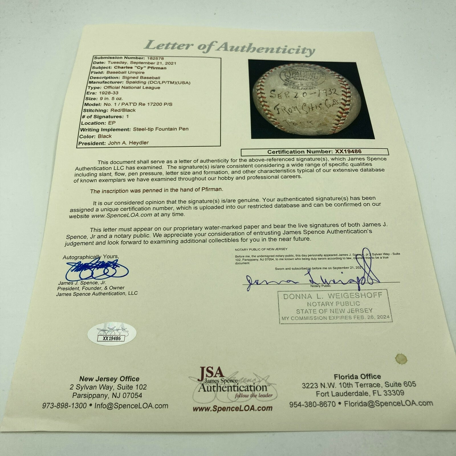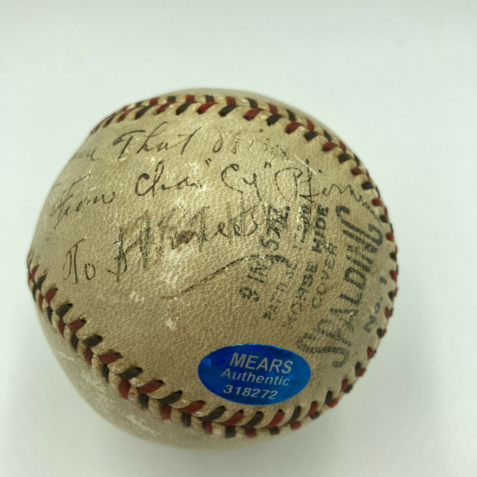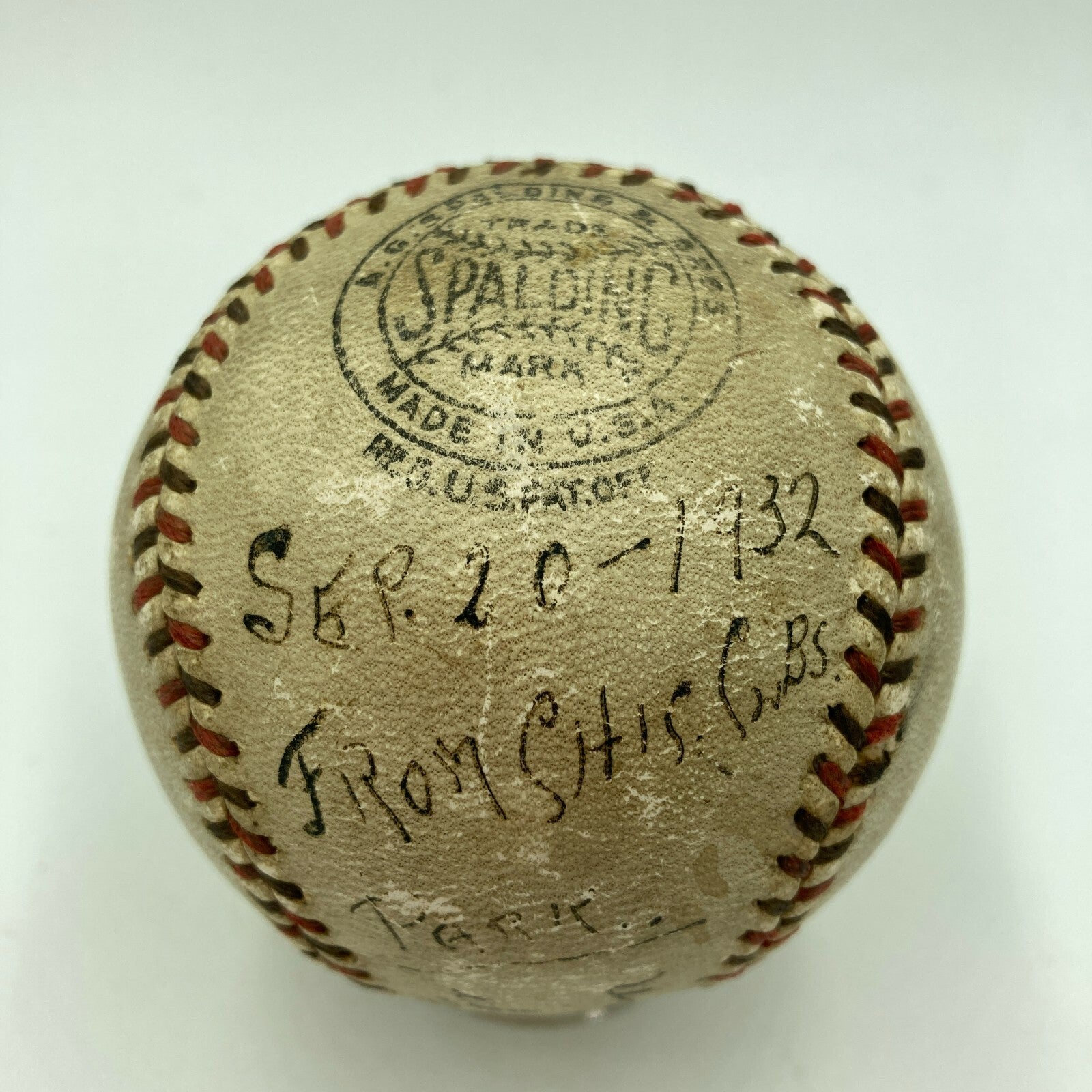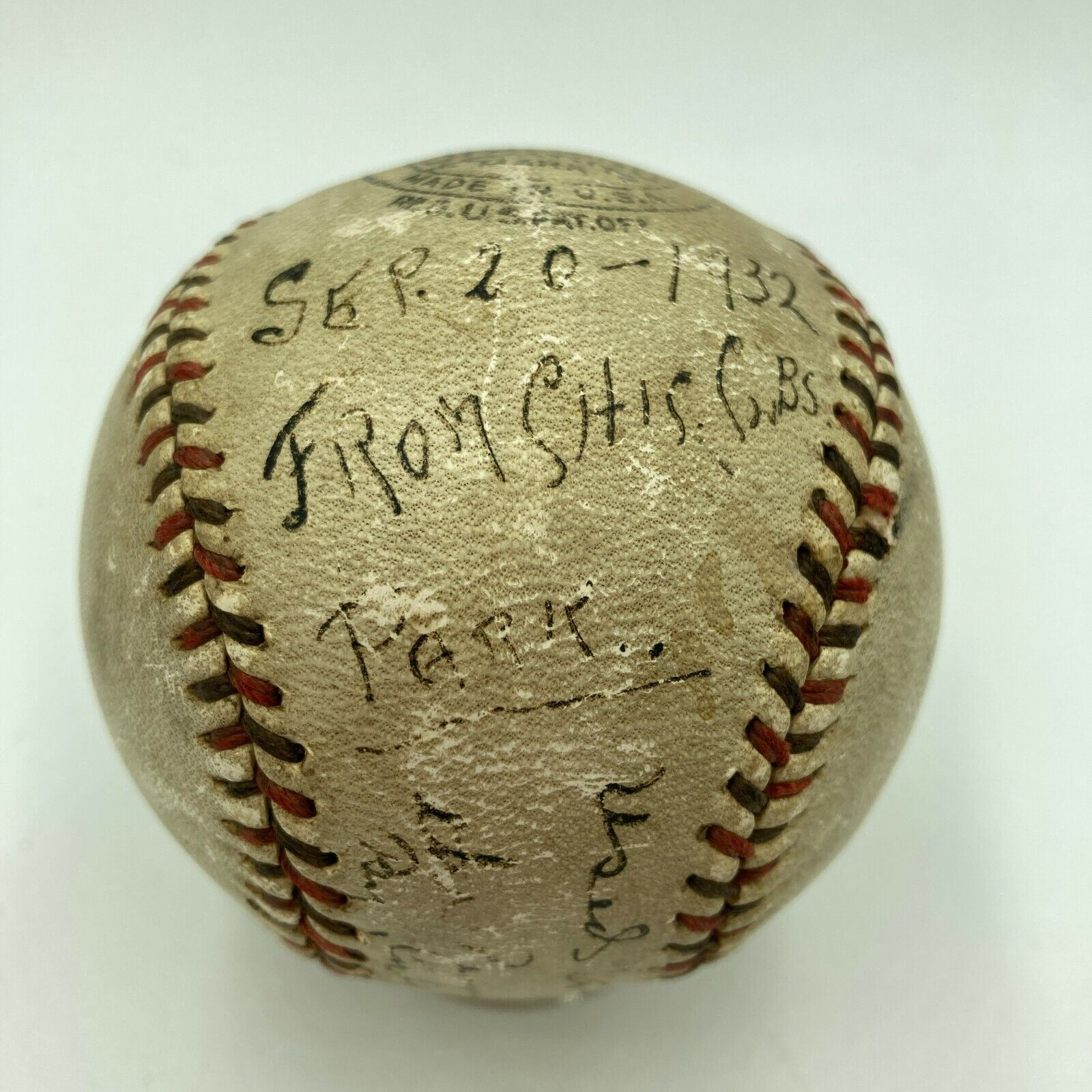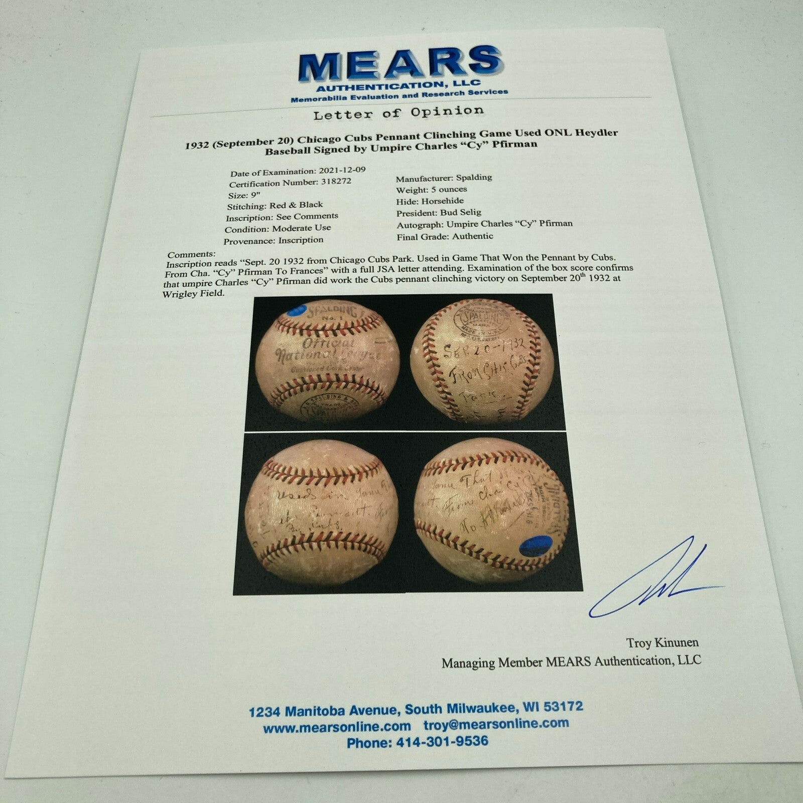 Historic game used baseball from the Chicago Cubs Pennant Clinching game on September 30, 1932. Official National League Baseball signed and heavily inscribed by legendary Umpire Charles "Cy" Pfirman. He inscribed the ball "September 20, 1932 From Chicago Cubs Park, Used in game that wins the pennant, From Chas Cy Pfirman.