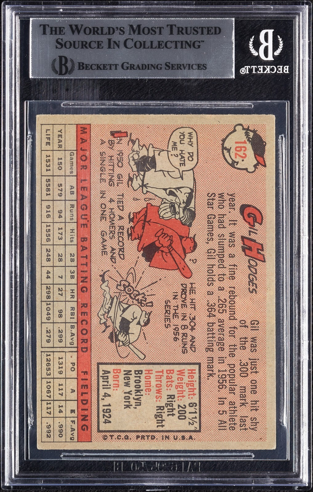 This 1958 Topps card features Gil Hodges and is signed in blue ballpoint pen. It's card No. 162 in the set and arrives slabbed and authenticated by BAS.