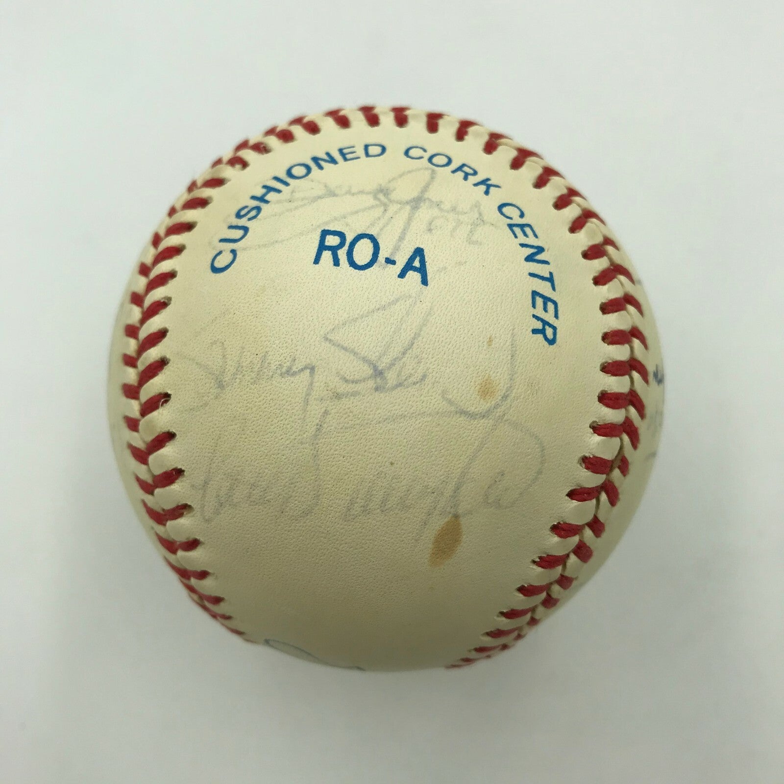 A Gold Glove Winners Multi Signed Autograph Baseball. Signatures include Cal Ripken Jr., Ozzie Smith, Johnny Bench "10x", Bob Gibson "9x Gold Gl...