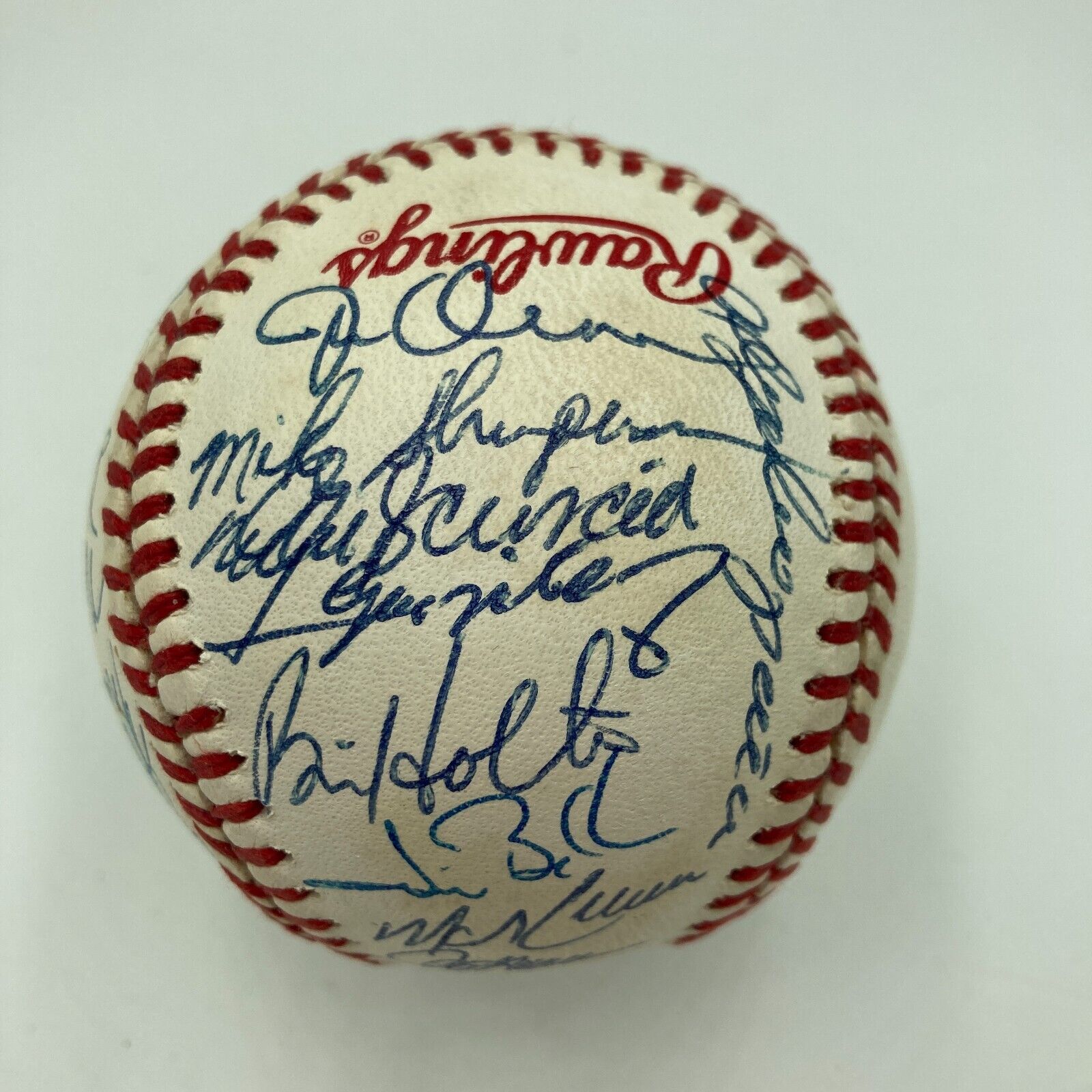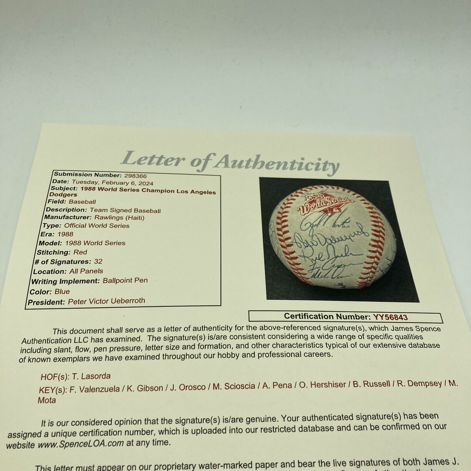 1988 Los Angeles Dodgers team signed World Series baseball. Rawlings official 1988 World Series ball signed by (32) members of the champion Dodgers including Orel Hershiser, Kirk Gibson, Mike Scioscia, Fernando Valenzuela, Tommy Lasorda, Tim Leary, Tim Belcher, John Shelby, Brian Holton, Rick Dempsey, Alejandro Pena, Dave Anderson, Franklin Stubbs, Jeff Hamilton, Mike Davis, Alfredo Griffin, and others.