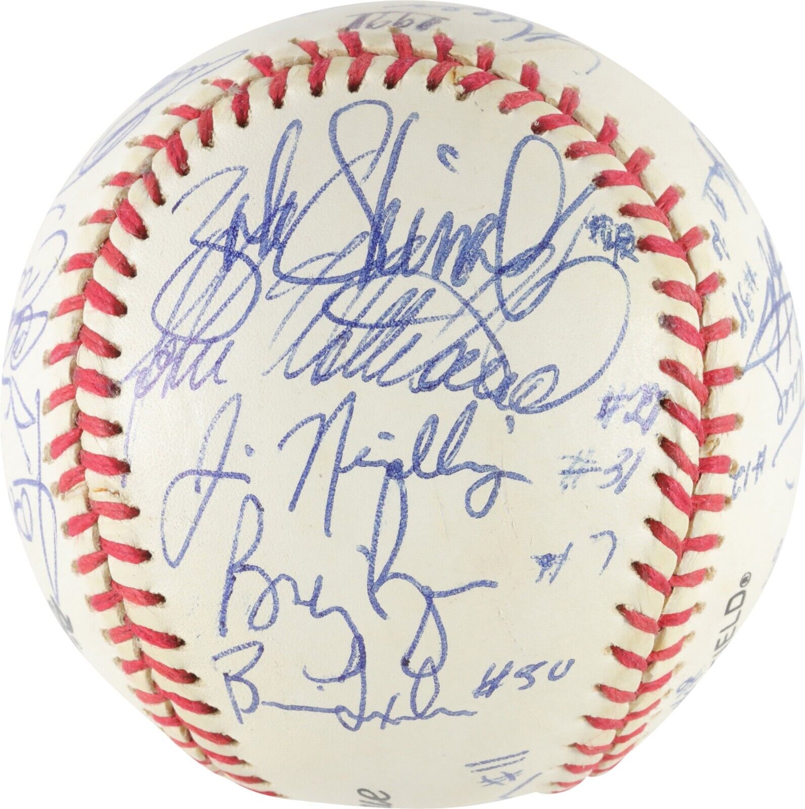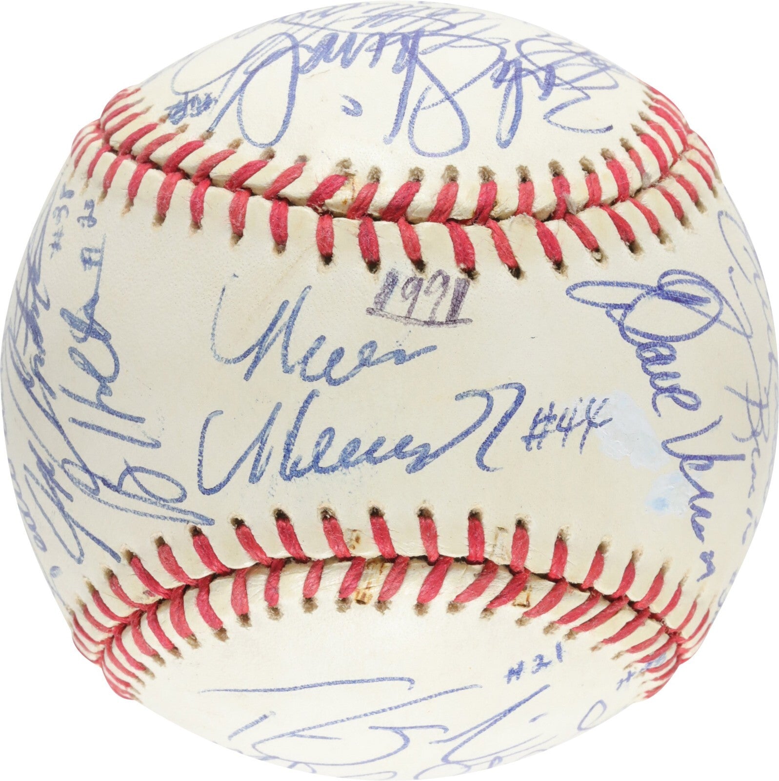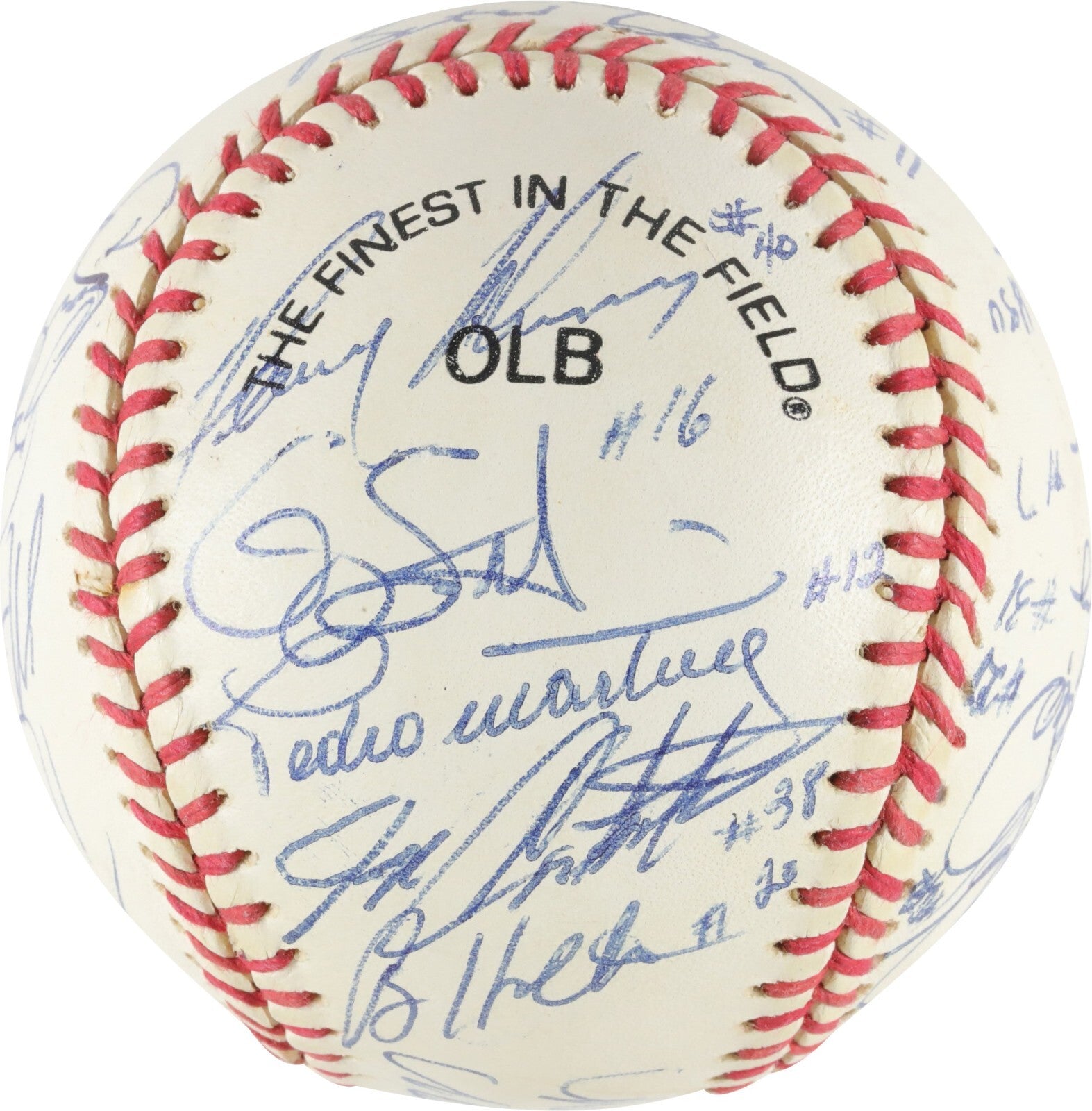 Offered is a rare 1991 Pedro Martinez pre-rookie era team-signed baseball. This Rawlings Official League baseball is in near-mint condition and is signed by 23 members of the 1991 Albuquerque Dukes team, a AAA affiliate of the Los Angeles Dodgers. Martinez signed the ball, along with John Wetteland, Dave Veres, Rafael Bournigal, Tom Goodwin, Butch Davis, and others. Martinez only appeared in six games for the Dukes, which makes team-signed balls with his signature nearly impossible to find. Martinez made his MLB debut for the L.A. Dodgers in 1992. He eventually became the premier pitcher in the game and was inducted into the National Baseball Hall of Fame in 2015. Full LOA from PSA.
