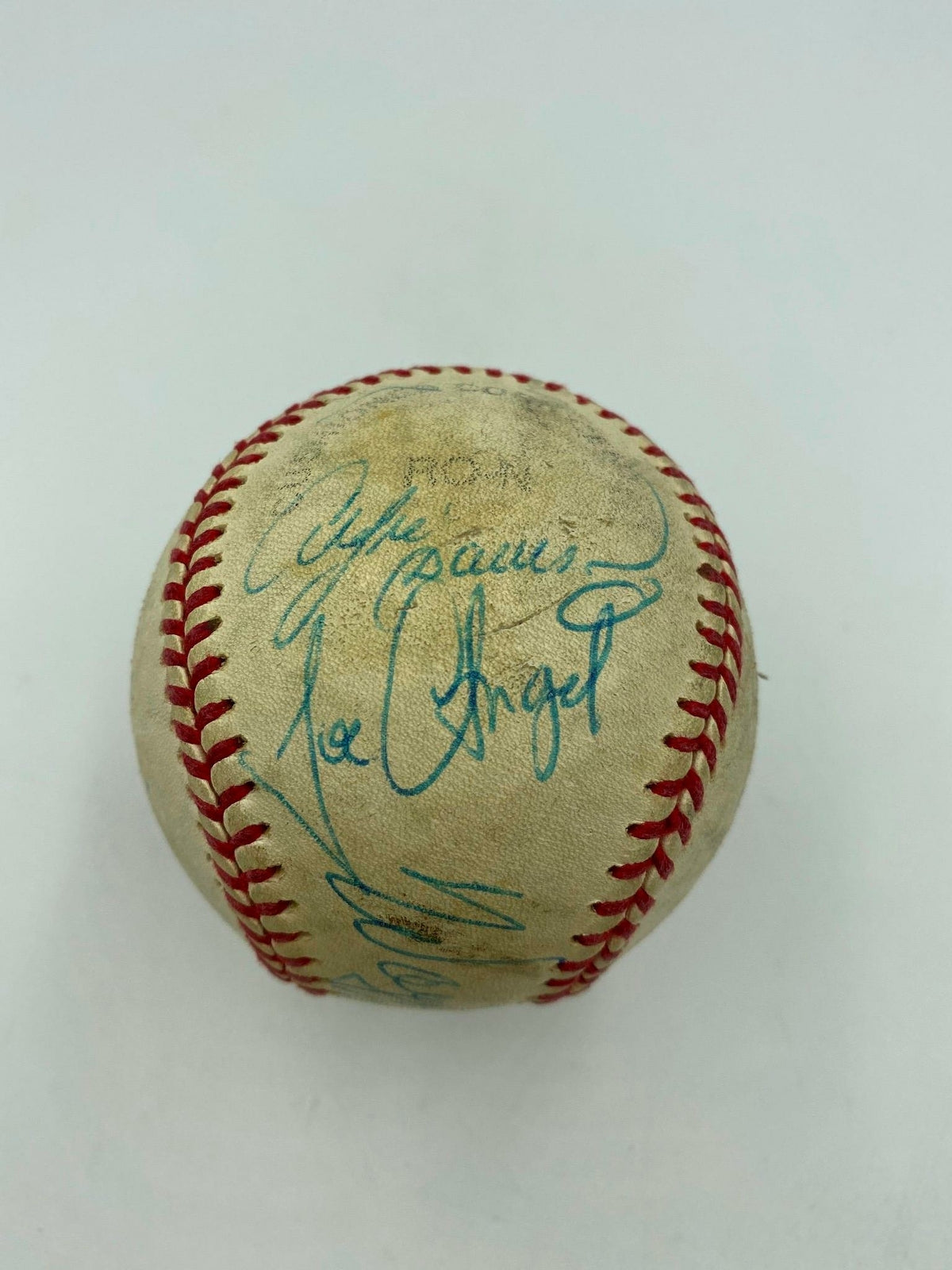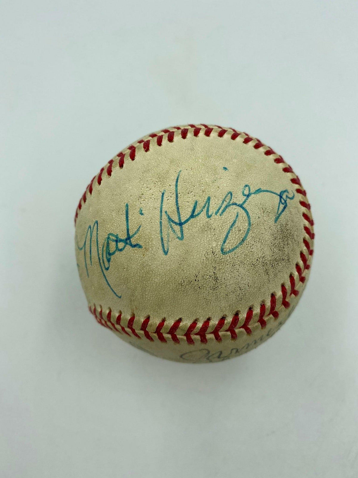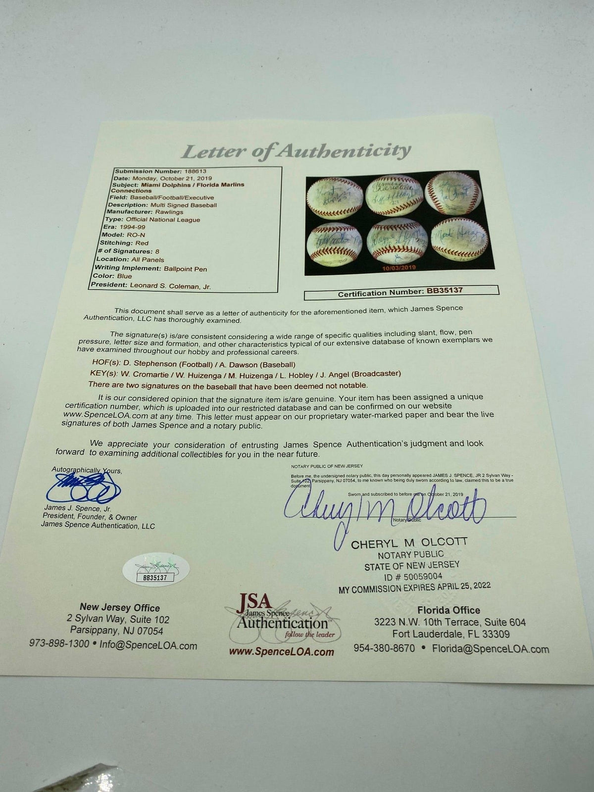 Very rare game used Official National League baseball signed at Game 7 of the 1997 World Series. Signed and dated on the sweet spot by Marlins Owner Wayne Huizenga "Oct. 26, 1997". Also signed by his son and D. Stephenson, Andre Dawson, W. Cromartie, L. Hobley, J. Angel and others. Full letter COA from JSA.