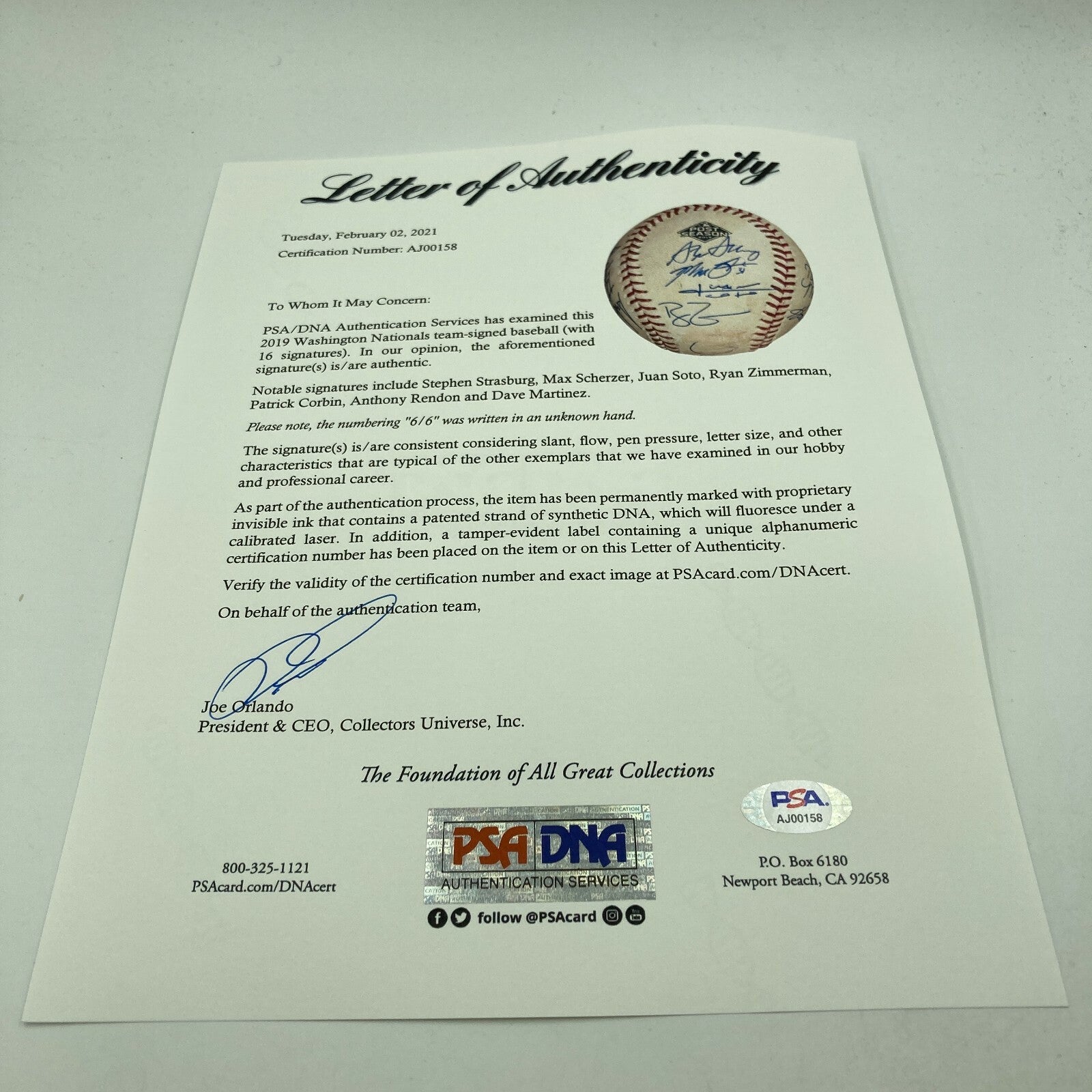 2019 Washington Nationals National League Championship Series Game Three Used & Team Signed Baseball, MLB Authentic. The 2019 Washington Nationals got hot at the right time and rode an amazing wave through the postseason en route to a World Series triumph. Many figured the Nationals would be in a rebuilding phase following the loss of slugger Bryce Harper during free agency. The Nationals had their own plans and dominated behind hurlers Stephen Strasburg and Max Scherzer. This Official Major League (Manfred) 2019 Postseason ball was used in Game 3 of the Nationals and Cardinals NLCS series. According to the MLB hologram (VS065746) the ball was pitched by Strasburg in the top of the third inning against Paul DeJong. The two-seam fastball resulted in a swinging strike. Washington won the game 8-1 and Strasburg picked up the win. Thirteen members of the championship team signed in bold ballpoint: Strasburg, Hudson, Taylor, Kendrick, Eaton, Turner, Sanchez, Martinez, Soto, Corbin, Suzuki, Cabrera, Scherzer, Rendon and Guerra. MLB and Fanatics holograms are affixed, and "6/6" is written on a panel. MLB Authentic VS065746. Fanatics Authentic A686483. Full LOA from PSA/DNA.