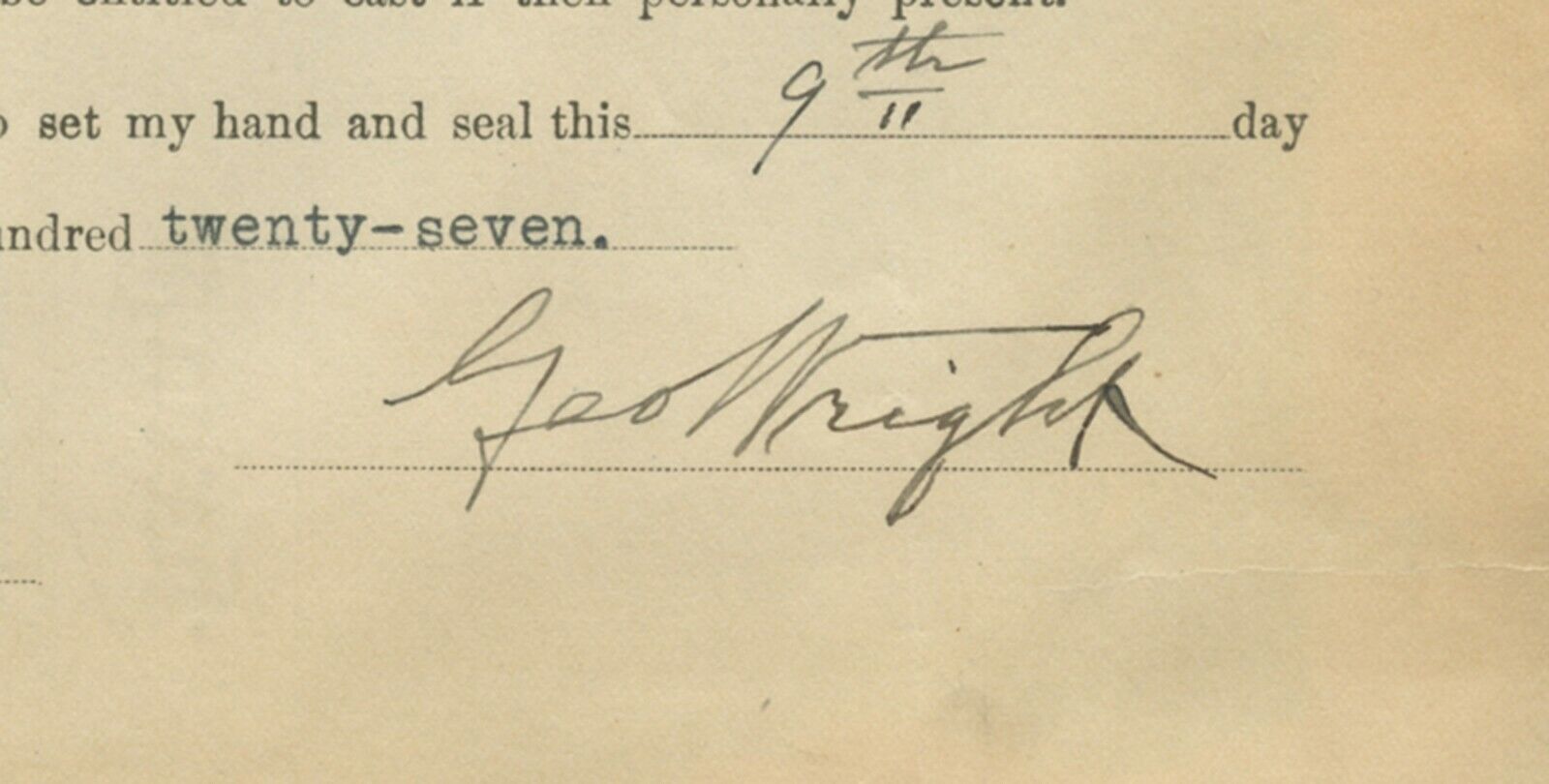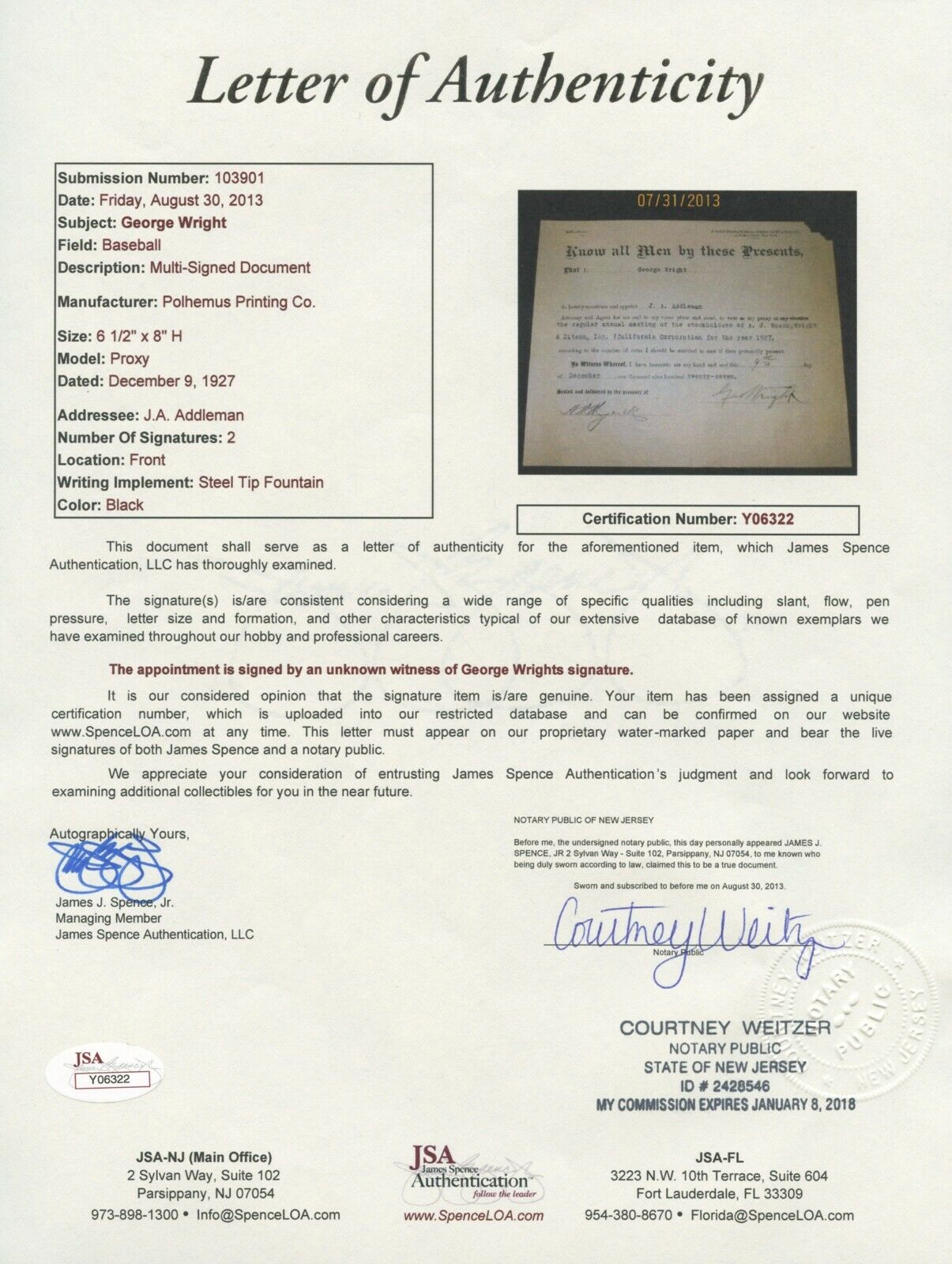 Dated 12/9/27, the offered 8 x 6-1/2" document assigns power of attorney to J.A. Addleman as Wright's proxy, for voting at a stockholders meeting of "A.J. Reach, Wright & Ditson, Inc.". The reverse is printed with the single word "Proxy", and the perimeter bears adhesive/paper residue. Wright's steel tip fountain pen signature at bottom right is a potent ("9") example, as is that of the unknown countersigning witness at bottom left. A major player in the realm of Hall of Fame autographs, Wright (d.1937) stands as an elusive collecting target, and this satisfying example of a legal nature is about as good as it get when it comes to authentic provenance. Full photo LOA from JSA.