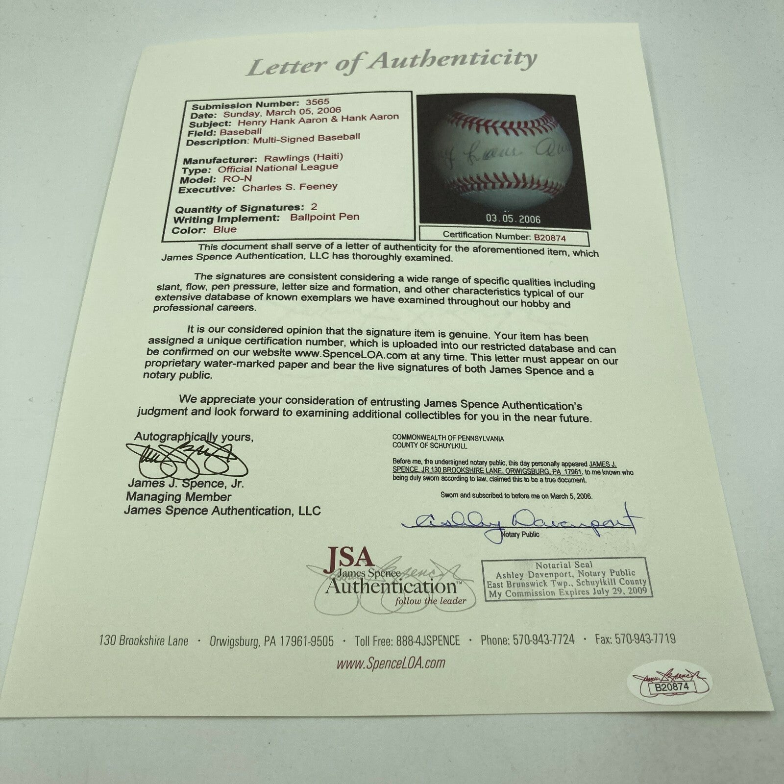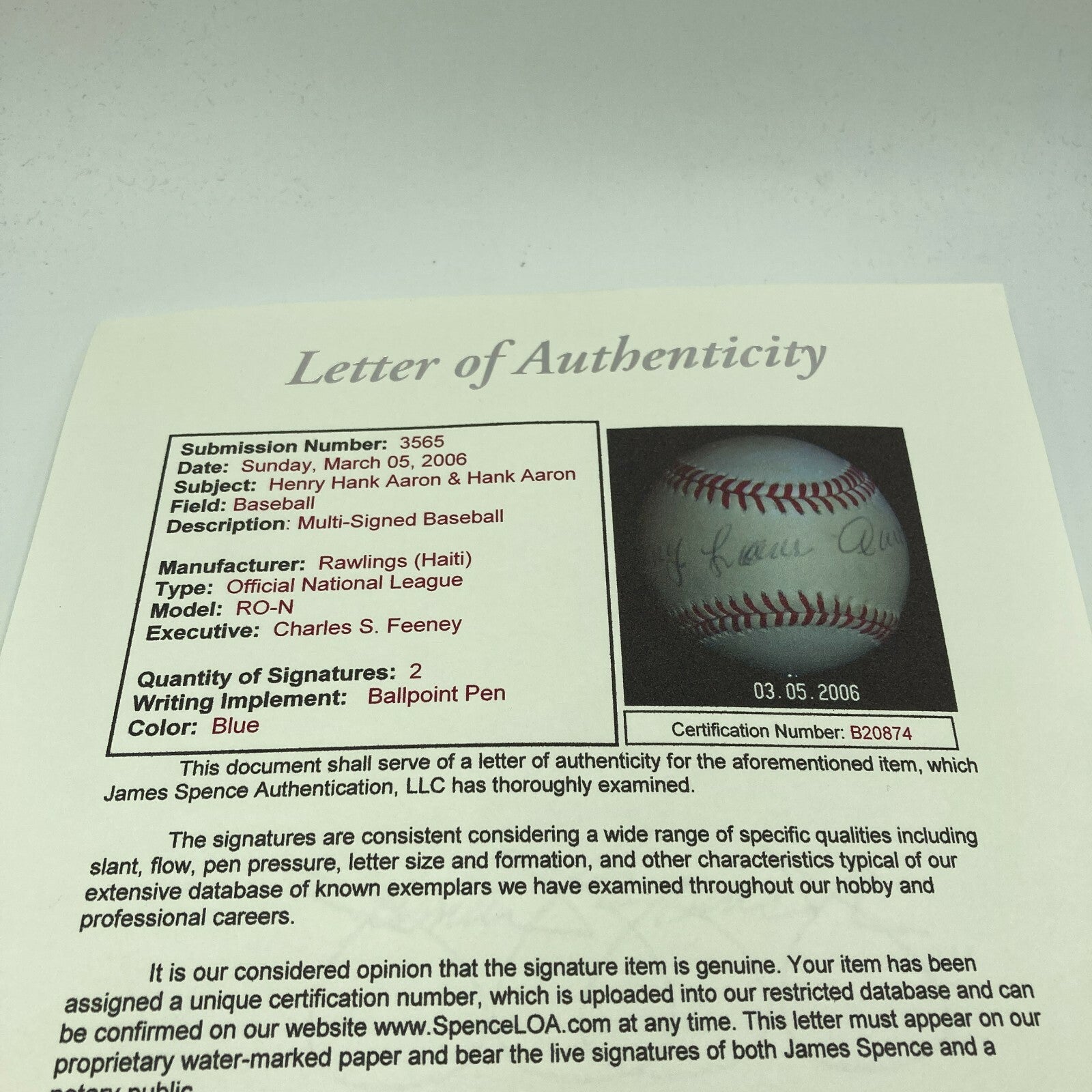 Hank Aaron full name autographed baseball. Rawlings C.Feeney Official National League baseball has been signed "Henry Louis Aaron" across the sweetspot and "Hank Aaron" on the panel below. Ink signatures rate 7-7/8 out of 10. Evenly toned throughout. Includes full LOA from JSA