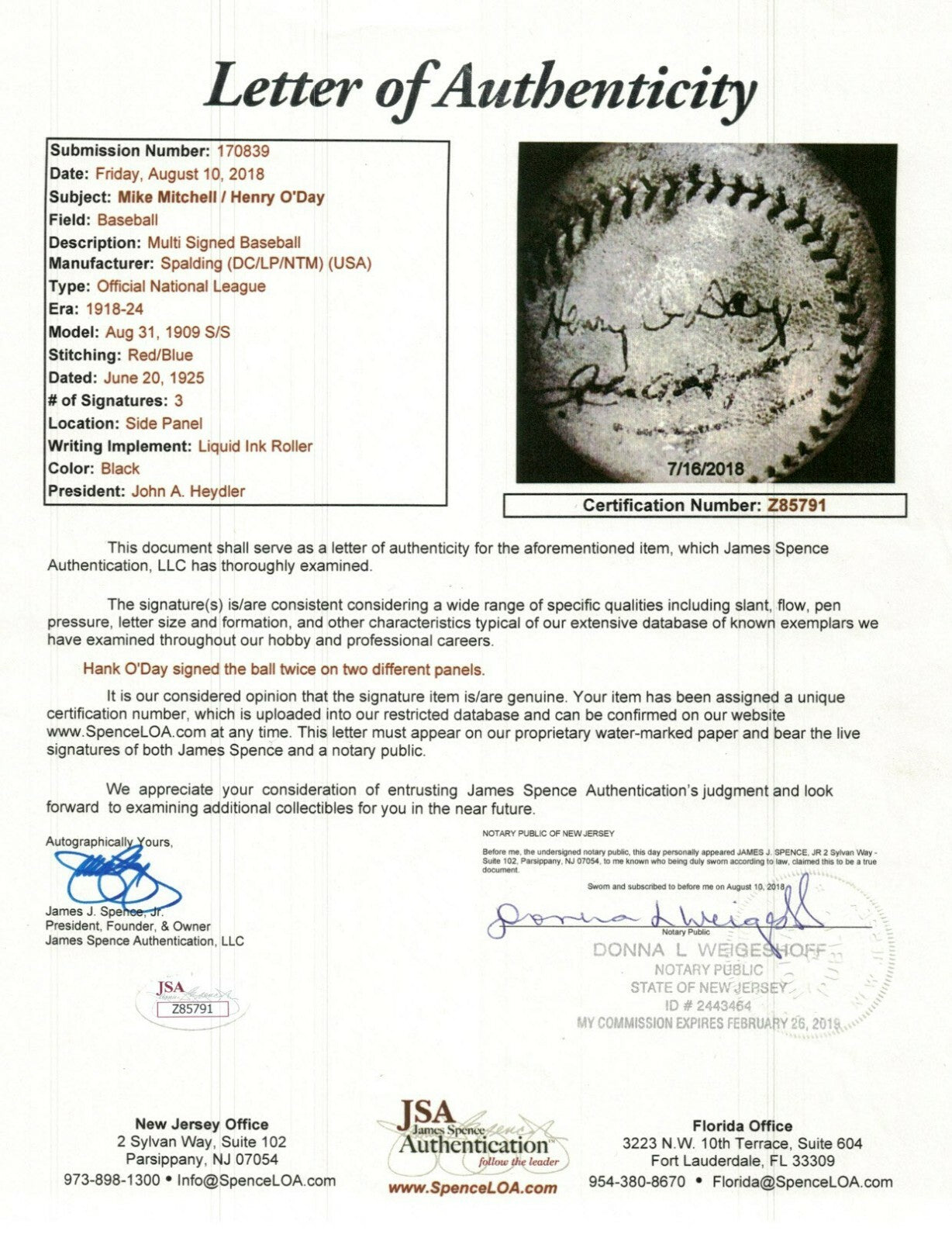 O'Day has twice-signed the offered game used Official National League Heydler baseball, which would be a fair prize on its own in unsigned state. The more prominent O'Day autograph resides on the east panel, directly above the printed John A. Heydler facsimile signature stamp. This prized O'Day signature displays as a single-signed example when viewed at eye level. The other O'Day autograph is located on the ball's east panel. Joining O'Day in the signing of this ball, is "dead ball" era star Mike Mitchell (d.1961). A solid batter for four different MLB squads from 1907-1914, Mitchell has signed on the west panel and sweet spot. Written on the ball's south panel is the box score for a game between the Cincinnati Reds and the New York Giants, with the date "June 25, 1925" below. Full photo LOA from JSA.