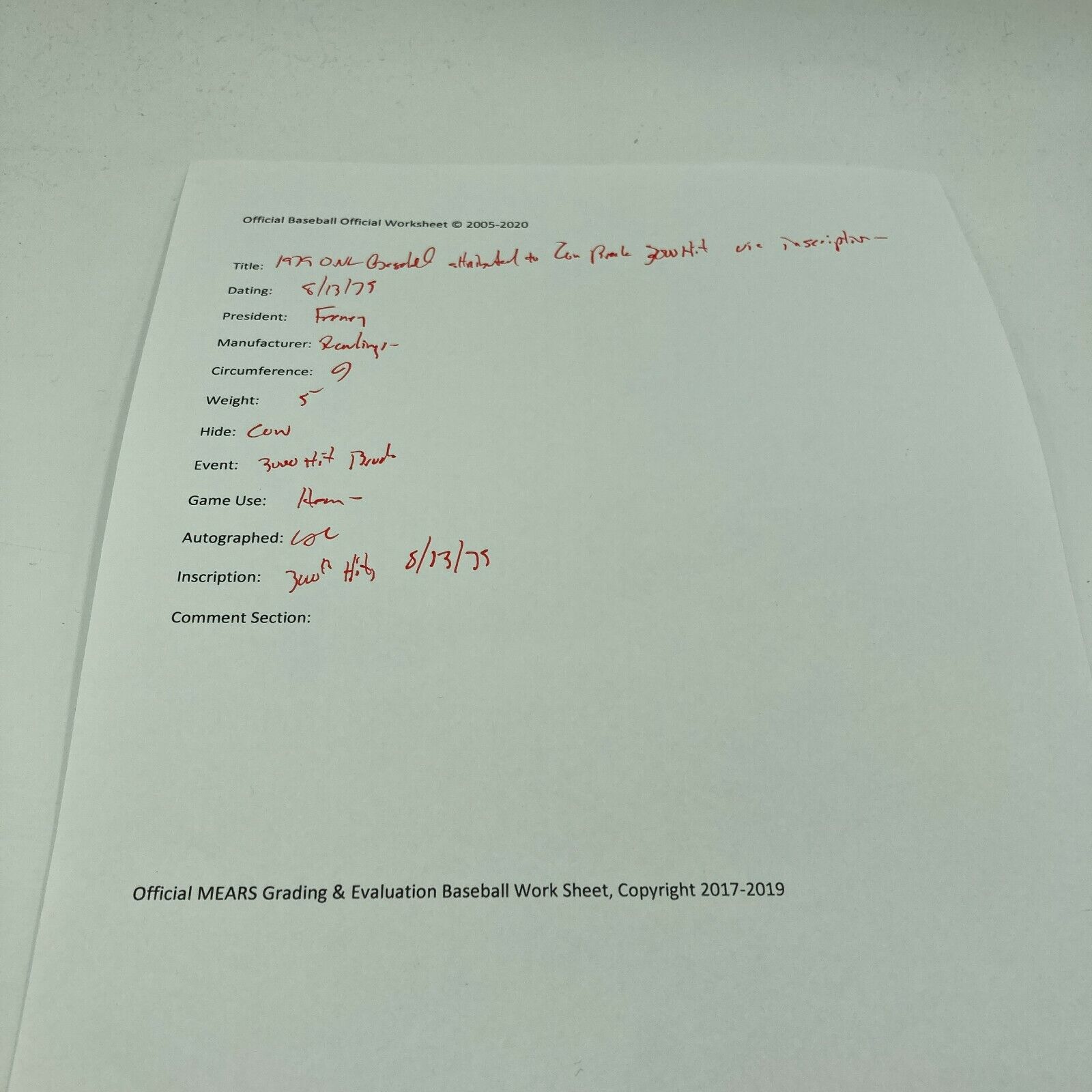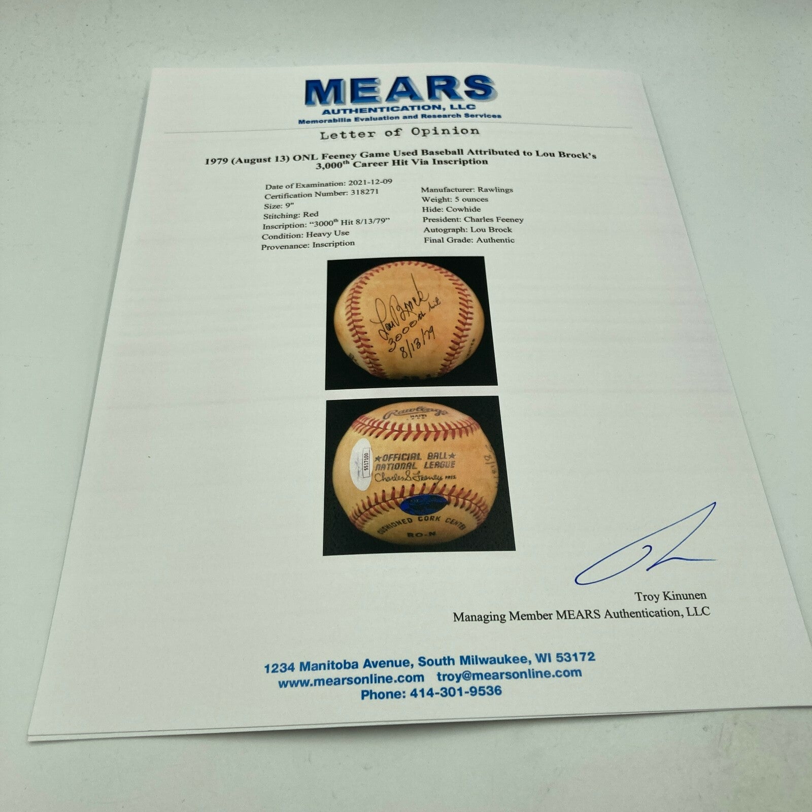 Lou Brock 8-13-1979 3,000th Hit Signed Game Used Baseball. This ball was actually used in the Historic game that Lou Brock hit his 3,000th Hit. Comes with full letter COA from MEARS.