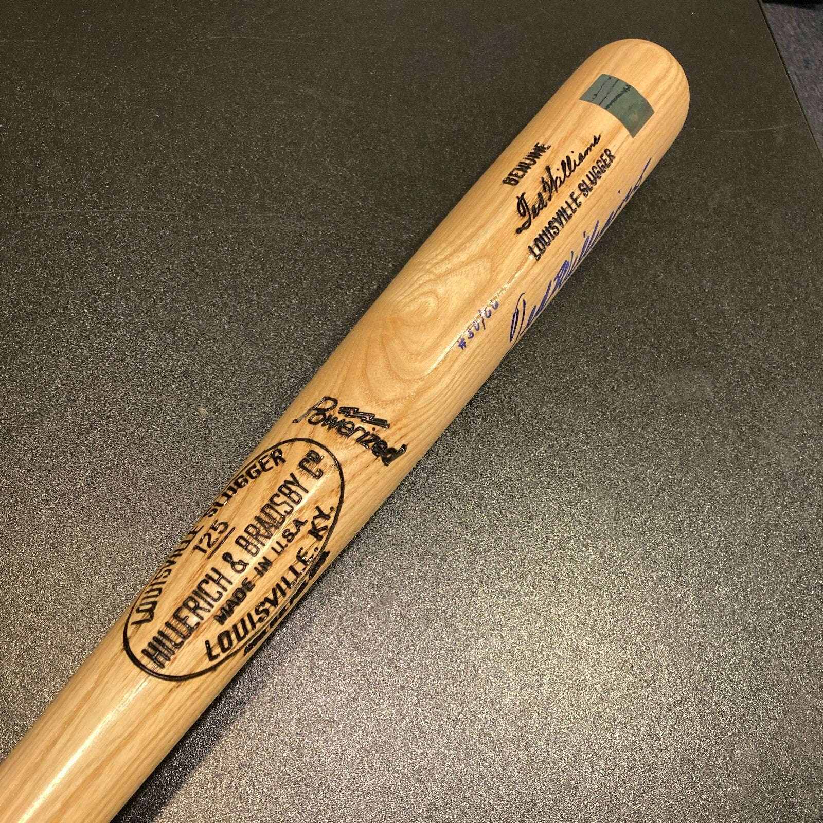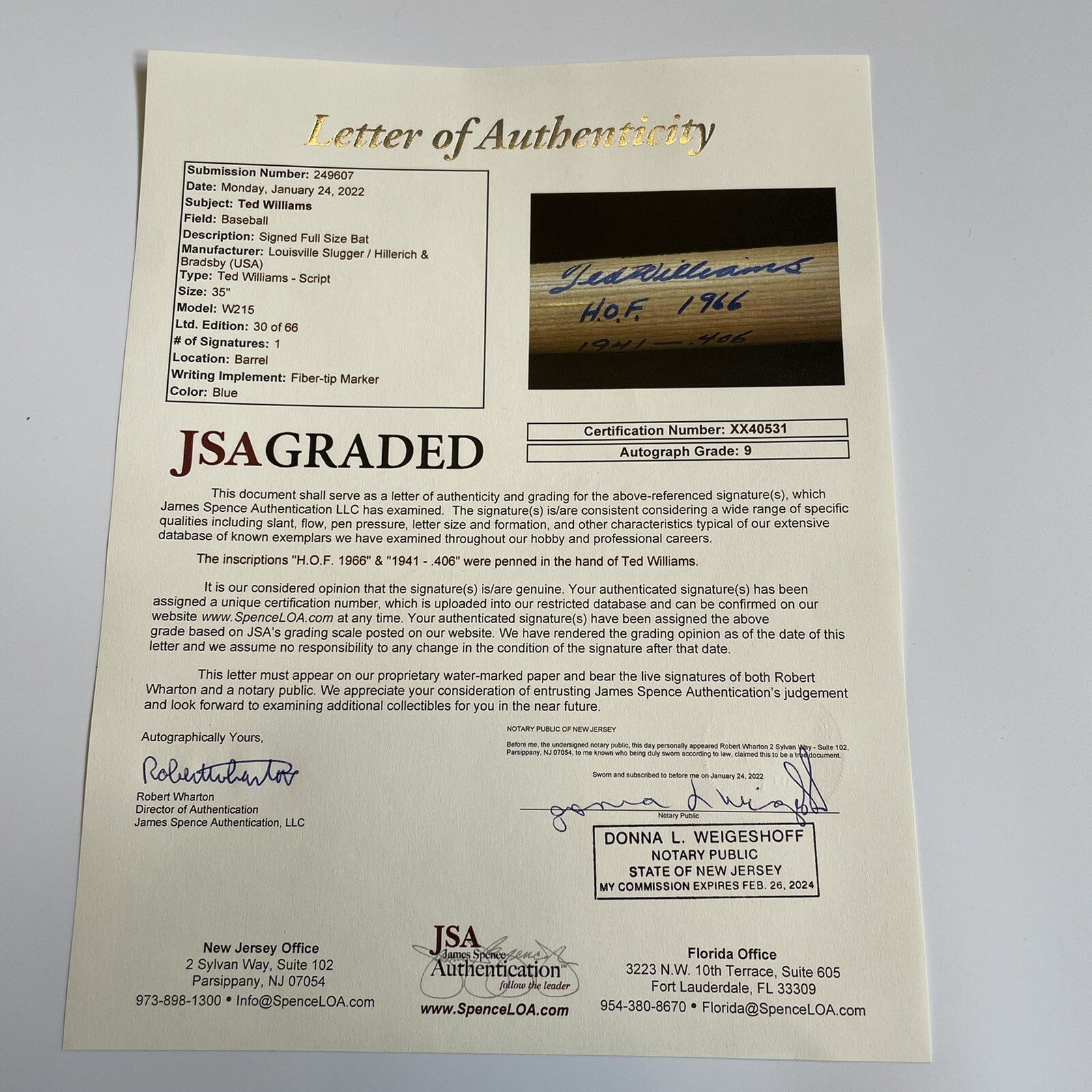 Rare Ted Williams signed bat featuring not only his signature on the barrel but also a personal handwritten inscription commemorating his historic 1941 season in which he batted .406. The signature and inscription, which reads "Ted Williams/1941 - .406," has been rendered in mint blue Sharpie directly below the barrel stamping. #30/66 has been scripted in blue Sharpie above Williams' signature. The bat, produced by Louisville slugger, is a replica of Williams' H&B signature-model "W215" bat that he used during his career. A "Green Diamond" hologram label is affixed to the barrel (Green Diamond was Williams' personal marketing company). The bat (35 inches in length) is in Mint condition. An outstanding example of this rare and highly desirable specially inscribed Ted Williams commemorative bat. Full LOA by PSA/DNA. Full LOA from JSA with MINT 9 grade.