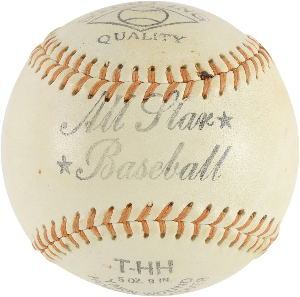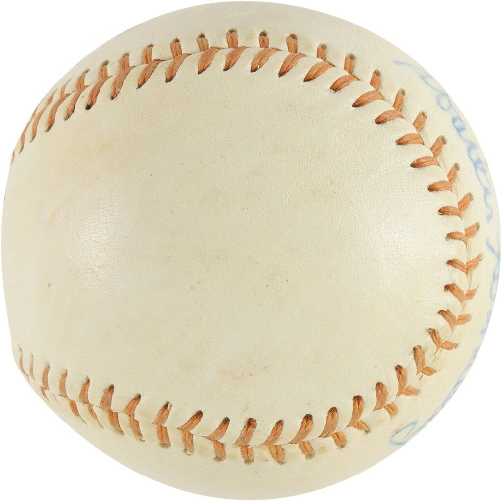 Beautiful and very rare baseball with a signature from one of Major League Baseball's most consequential owners, Walter O'Malley. Clean All-Star baseball has blue ink signature on the sweet spot with inscription, "To Bryan, Walter F. O'Malley." O'Malley was loved or hated depending on which coast you lived on, as he orchestrated the move of the Brooklyn Dodgers - one of the league's most profitable franchises - to Los Angeles, while also having a hand in the NY Giants' move to San Francisco; the first moves in MLB's westward expansion. Comes with PSA DNA LOA.