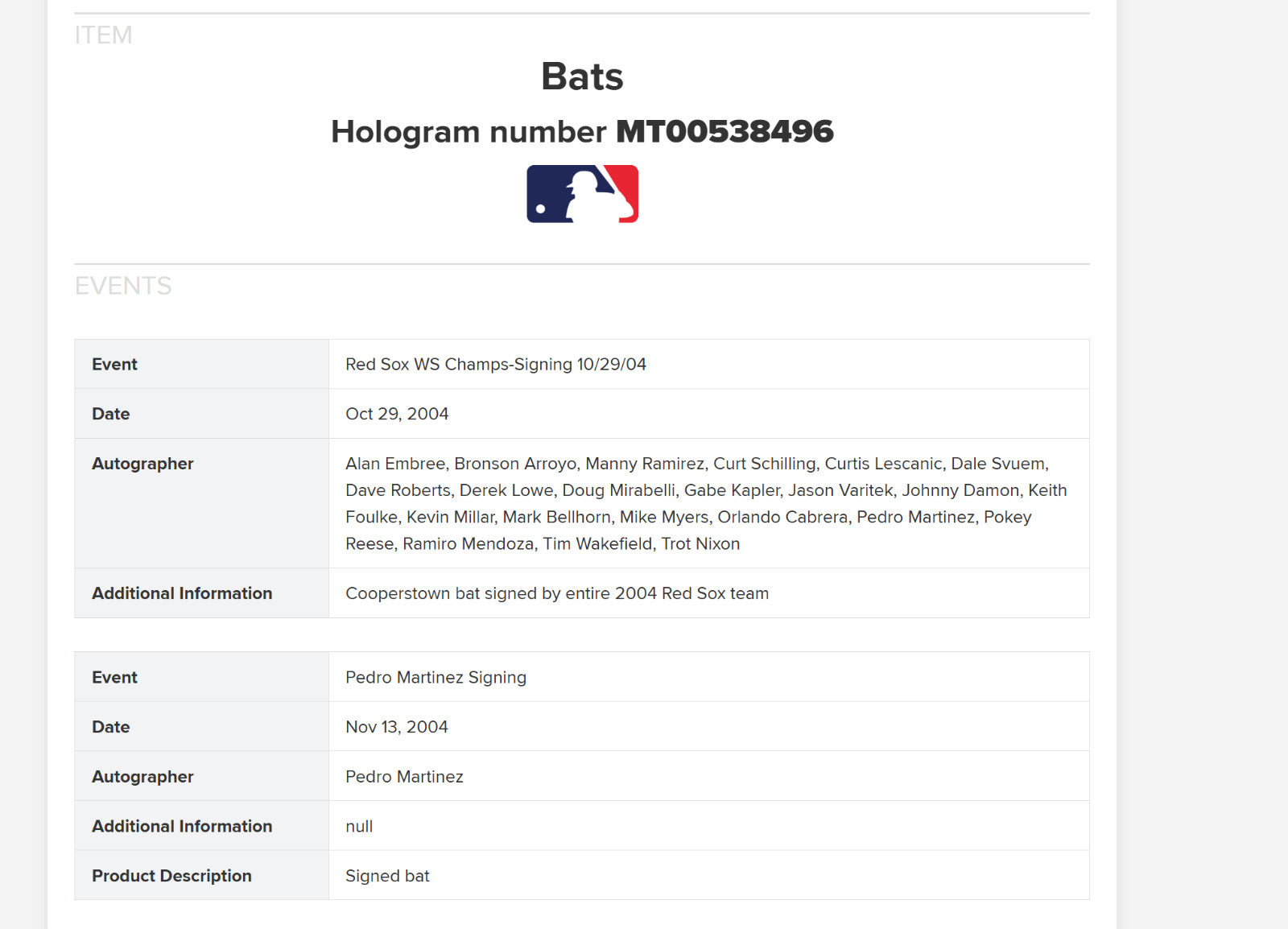 The Curse of the Bambino-breaking 2004 World Series Champion Boston Red Sox joyfully signed this commemorative Cooperstown Bat Co. 2004 "The Curse Has Been Broken" World Series Champion Boston Red Sox bat. 2004 was a magical season for the Boston Red Sox, as their misfit team of self-named "Idiots" overcame a 3-0 deficit in the American League Championship Series to defeat their hated rivals, the New York Yankees. The Red Sox advanced to the World Series, where they swept the St. Louis Cardinals in four games. This handed the Red Sox their first championship in 86 seasons, ending one of baseball's longest-ever title droughts. Key signatures on the bat include those of Hall of Famer Pedro Martinez, Alan Embree, Bronson Arroyo, Manny Ramirez, Curt Schilling, Curtis Leskanic, Dale Sveum, Dave Roberts, Derek Lowe, Doug Mirabelli, Gabe Kapler, Jason Varitek, Johnny Damon, Keith Foulke, Kevin Millar, Mark Bellhorn, Mike Myers, Orlando Cabrera, Pokey Reese, Ramiro Mendoza, Tim Wakefield, and Trot Nixon. The bat is accompanied by an MLB Authenticated hologram (MT00538496) for the signatures.