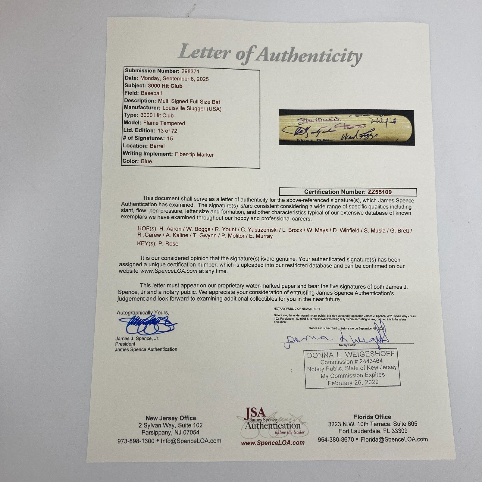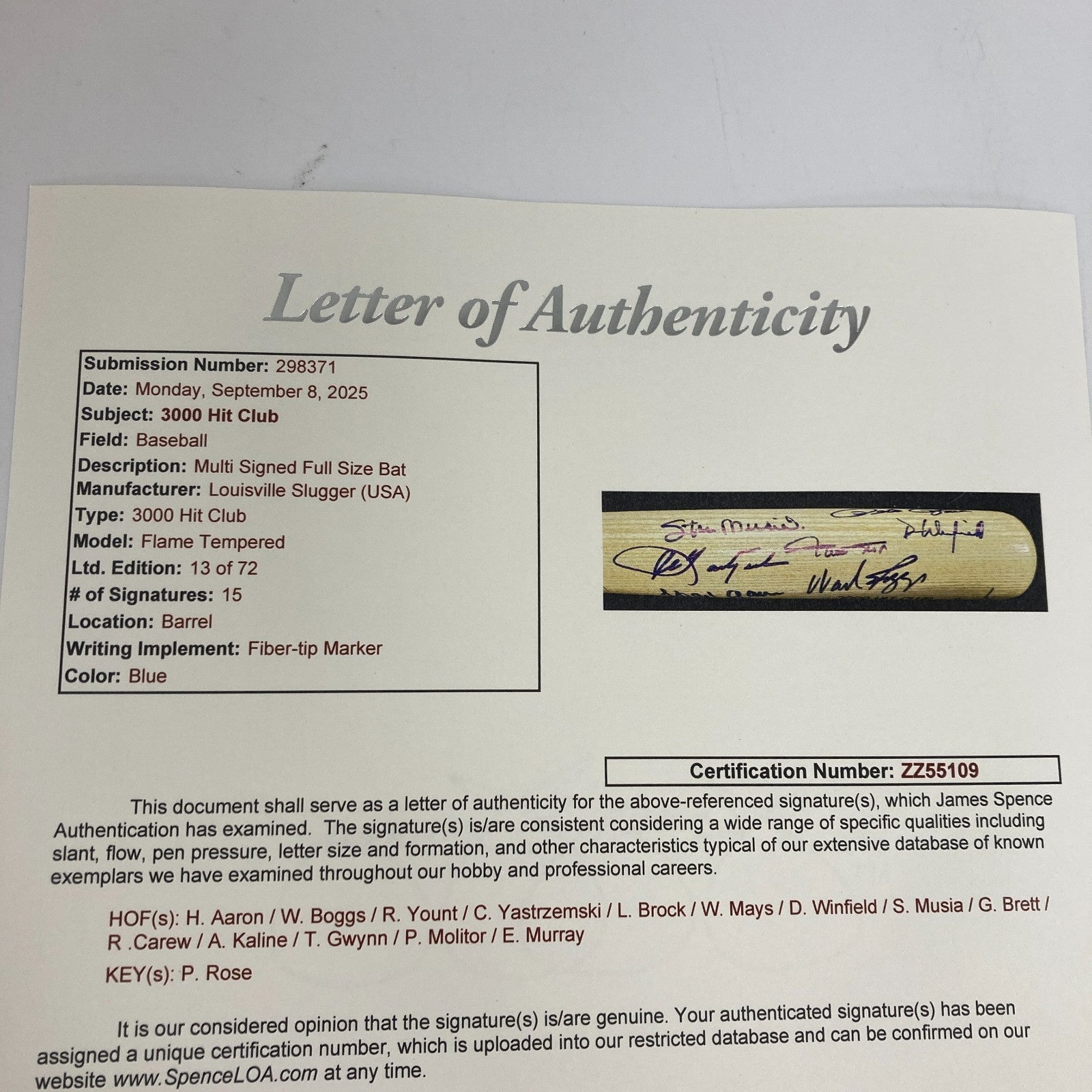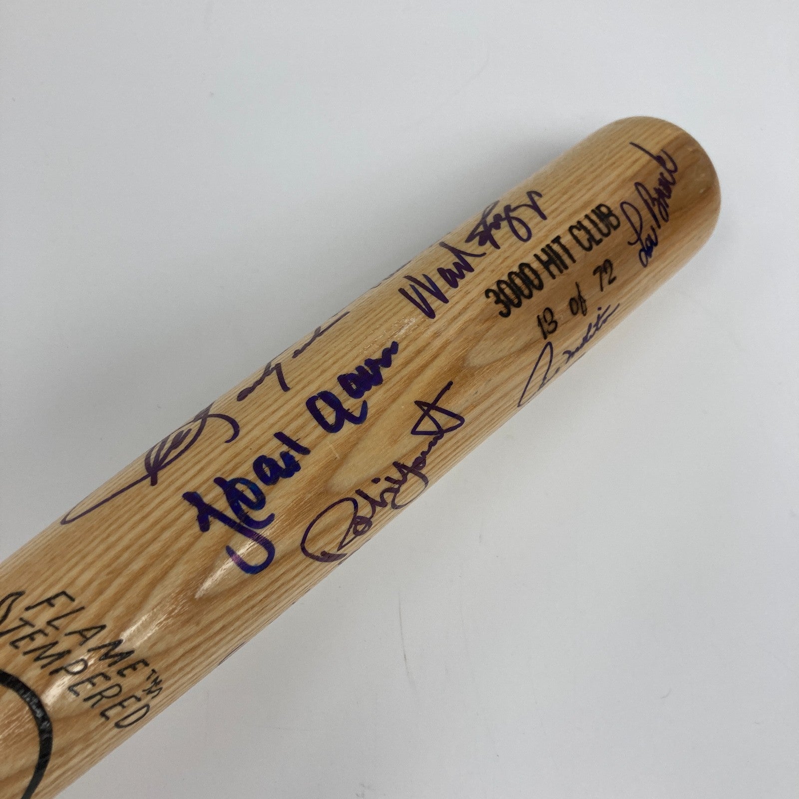 Louisville Slugger "3000 Hit Club" limited-edition commemorative bat signed in blue marker by the following fifteen members of that elite fraternity: Pete Rose, Stan Musial, Dave Winfield, Carl Yastrzemski, Willie Mays, Hank Aaron, Wade Boggs, Robin Yount, Lou Brock, Paul Molitor, Eddie Murray, Tony Gwynn, Rod Carew, George Brett, and Al Kaline. The bat (33 inches) is stamped "13 of 72" along the barrel and is in Near Mint condition