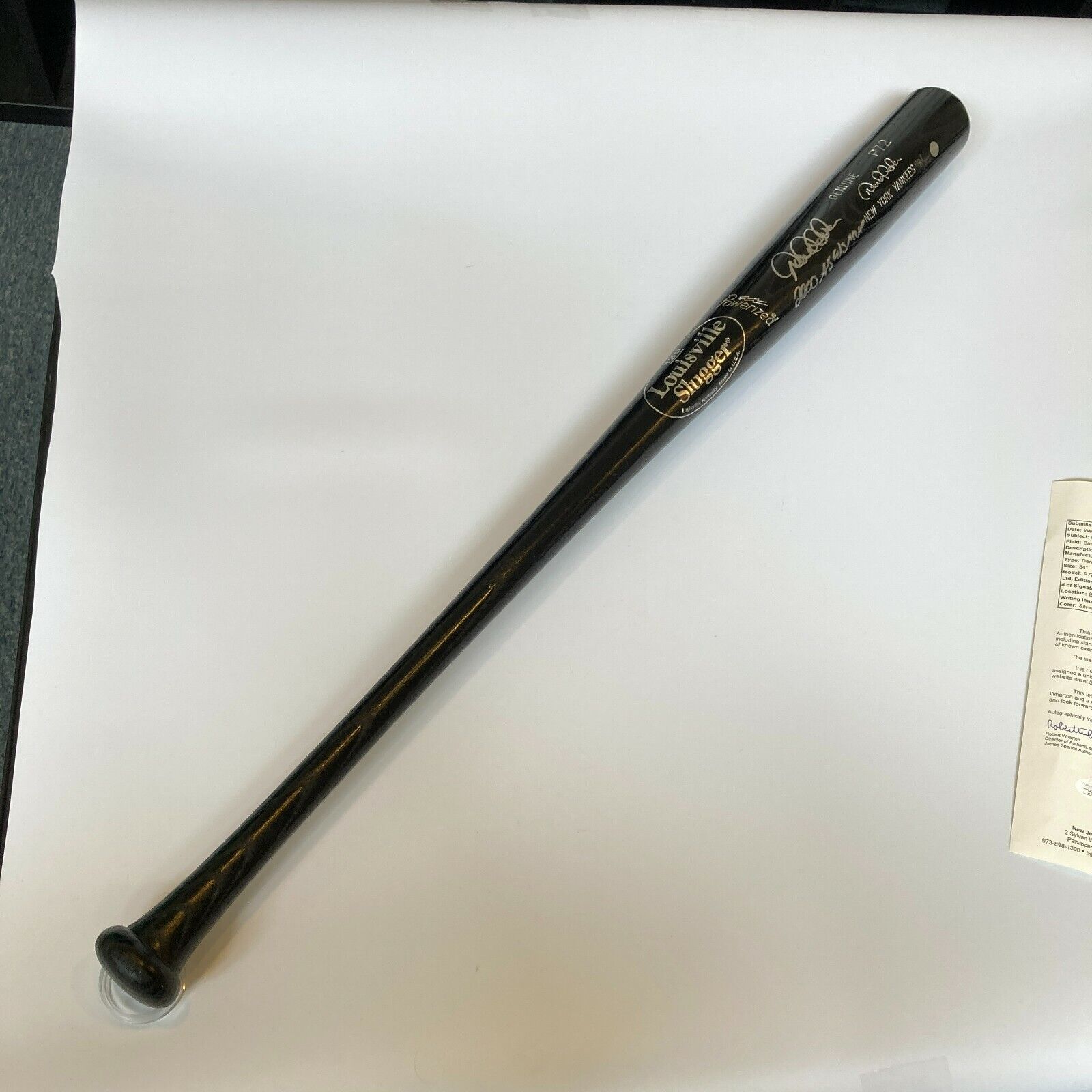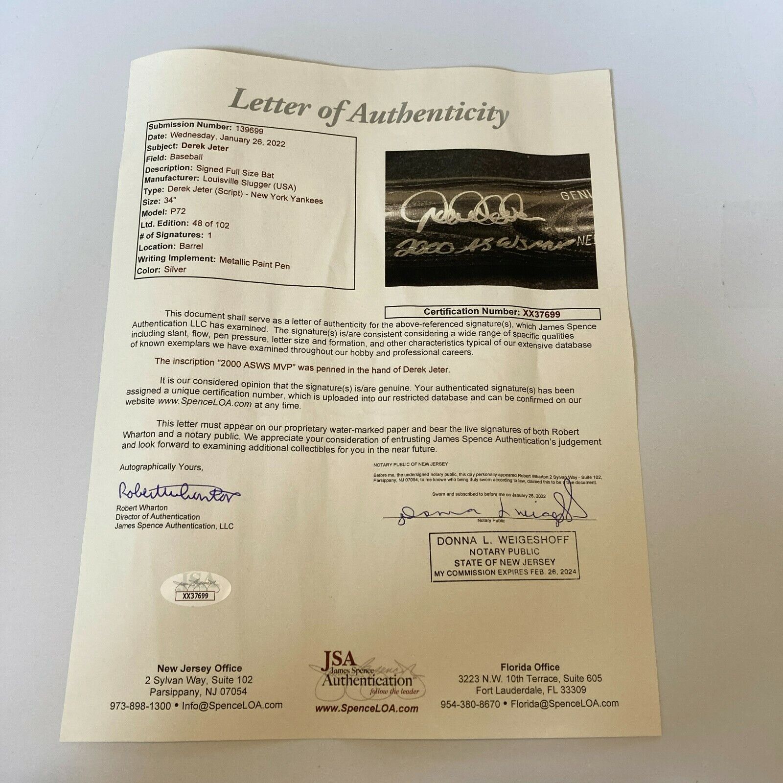 Presented is a limited edition Derek Jeter signed and inscribed Louisville Slugger Model P72 baseball bat. The Hall of Fame New York Yankees shortstop signed his name in silver metallic paint pen in the center of the barrel of the black wood bat. Jeter inscribed “2000 AS WS MVP” below his signature, also in silver metallic paint pen. The signature and the inscription are to the right of the embossed Louisville Slugger logo in silver. The bat is inscribed “48/102” in silver marker to the right of the embossed silver “Genuine P72 Derek Jeter New York Yankees” brand. Jeter batted a team-best .339 in the 2000 Major League Baseball regular season and added 15 home runs, 73 RBIs, 119 runs scored, and 22 stolen bases. In the 2000 MLB All-Star Game, he recorded three hits, including a two-run single that gave his team the lead and victory. The performance earned him the All-Star Game MVP Award, the first time a Yankee won the award. During the postseason, he batted only .211 in the Division Series but rebounded to hit .318 in the Championship Series against the Seattle Mariners, and .409 in the World Series against the New York Mets. Jeter added two home runs, a triple, and two doubles in the World Series, including a leadoff home run on the first pitch of Game 4 and a triple later in the third inning. His home run in Game 5 tied the game and extended his World Series hitting streak to 14 games. The Yankees defeated the Mets in five games for their third consecutive title and fourth in Jeter's first five full seasons. Jeter won the World Series MVP Award, becoming the only player to win the All-Star Game MVP and World Series MVP Awards in the same season. This item comes with a LOA from JSA (XX37699).