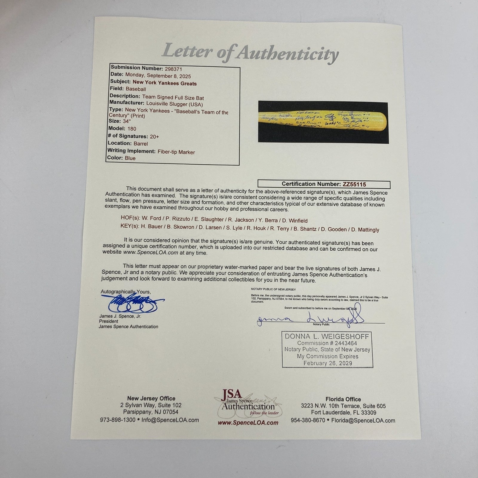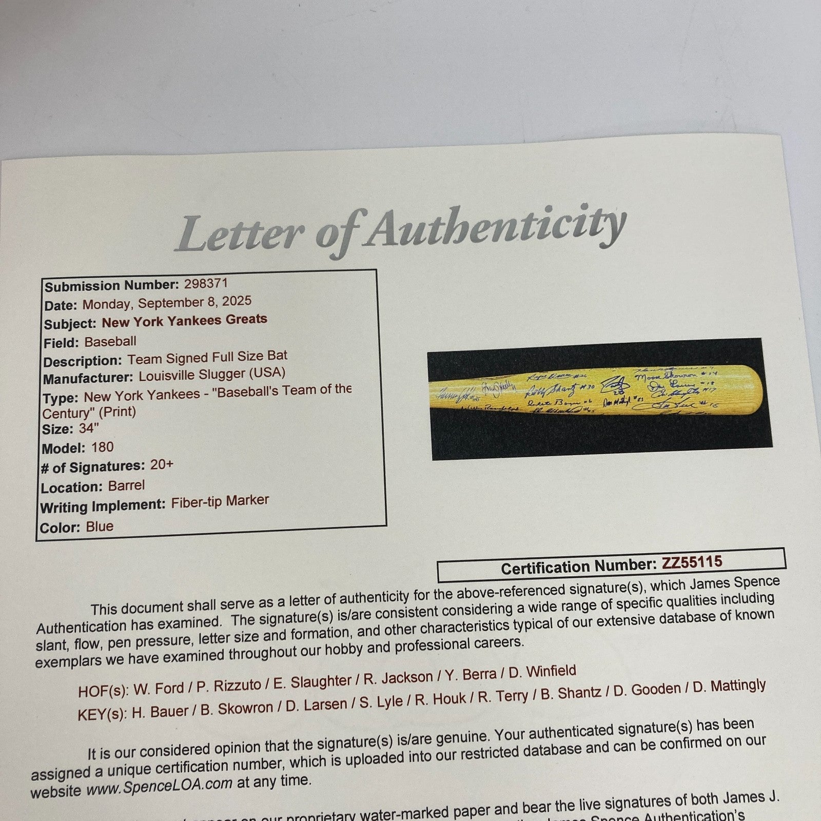 Team of the Century Bat - 32 autographs including: Yogi Berra, Don Mattingly, Whitey Ford, Dave Winfield, Dwight Gooden, Phil Rizzuto, Reggie Jackson, Willie Randolph, David Justice, Don Larsen, and Graig Nettles.