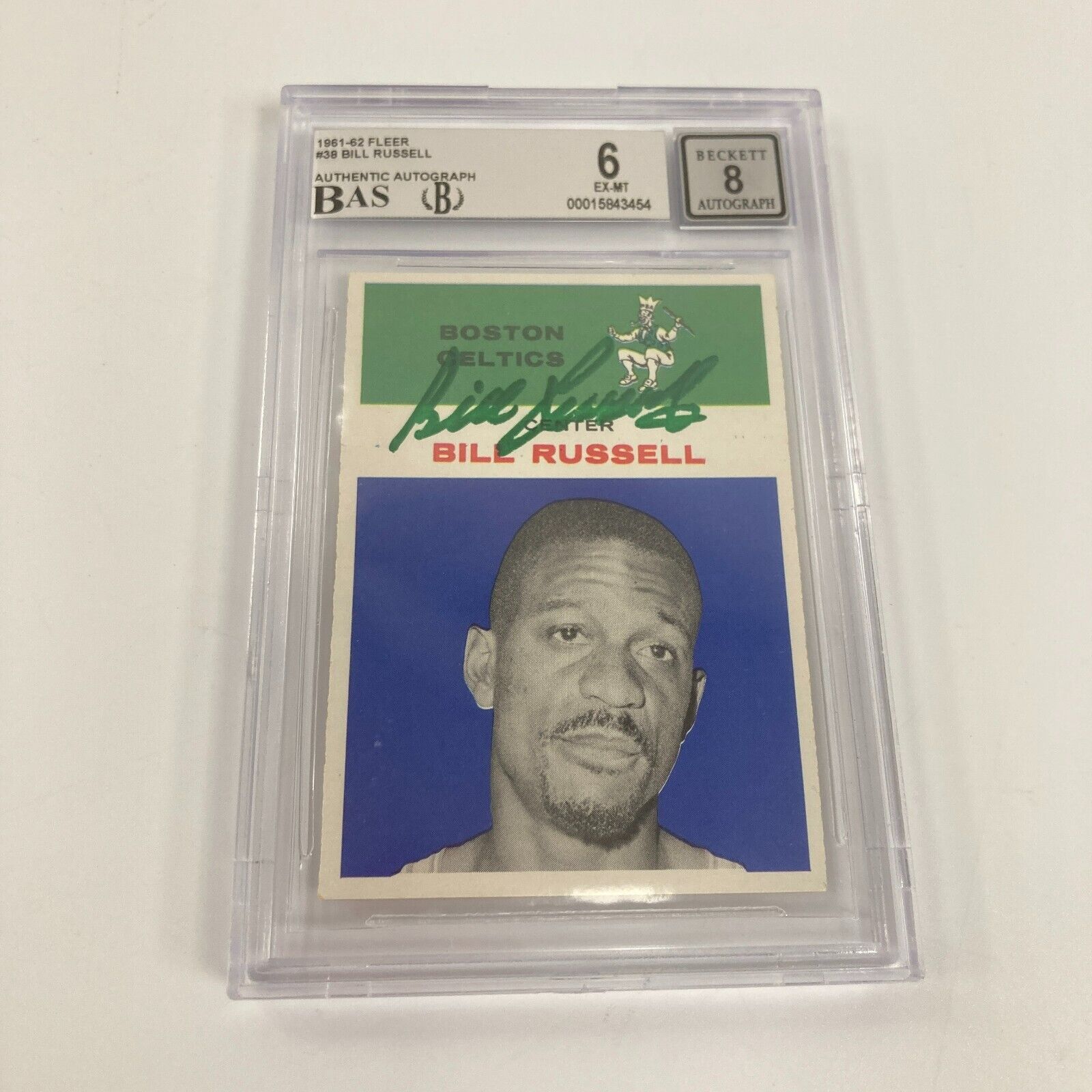 Encapsulated with Autograph Grade 8 by Beckett (00015743887). Hall of Famer. This is an early memento of a great player who appeared on very few cards. The great Bill Russell has placed his green ink signature across the card's clean surface. The success of Russell and the Boston Celtics largely defined the NBA during his 13-year career—the dearly departed defensive stalwart and civil rights activist won 11 NBA Finals titles during his playing career, a league record. With its bold colors and stately subject depictions, the 1961-62 Fleer Basketball set is one of the most heralded productions of vintage basketball collectibles. The offered example features a crisp and clear central image of the iconic center, framed within a vivid blue backdrop. Centering is nicely calibrated, especially in respect to this infamously alignment-challenged issue, and the card's reverse is boldly printed and fully legible, with only a light measure of natural age-toning. This is a standout showcase for the striking, pronounced autograph of one of the greatest players in NBA history. Sadly, Russell passed away in 2022 at the age of 88.