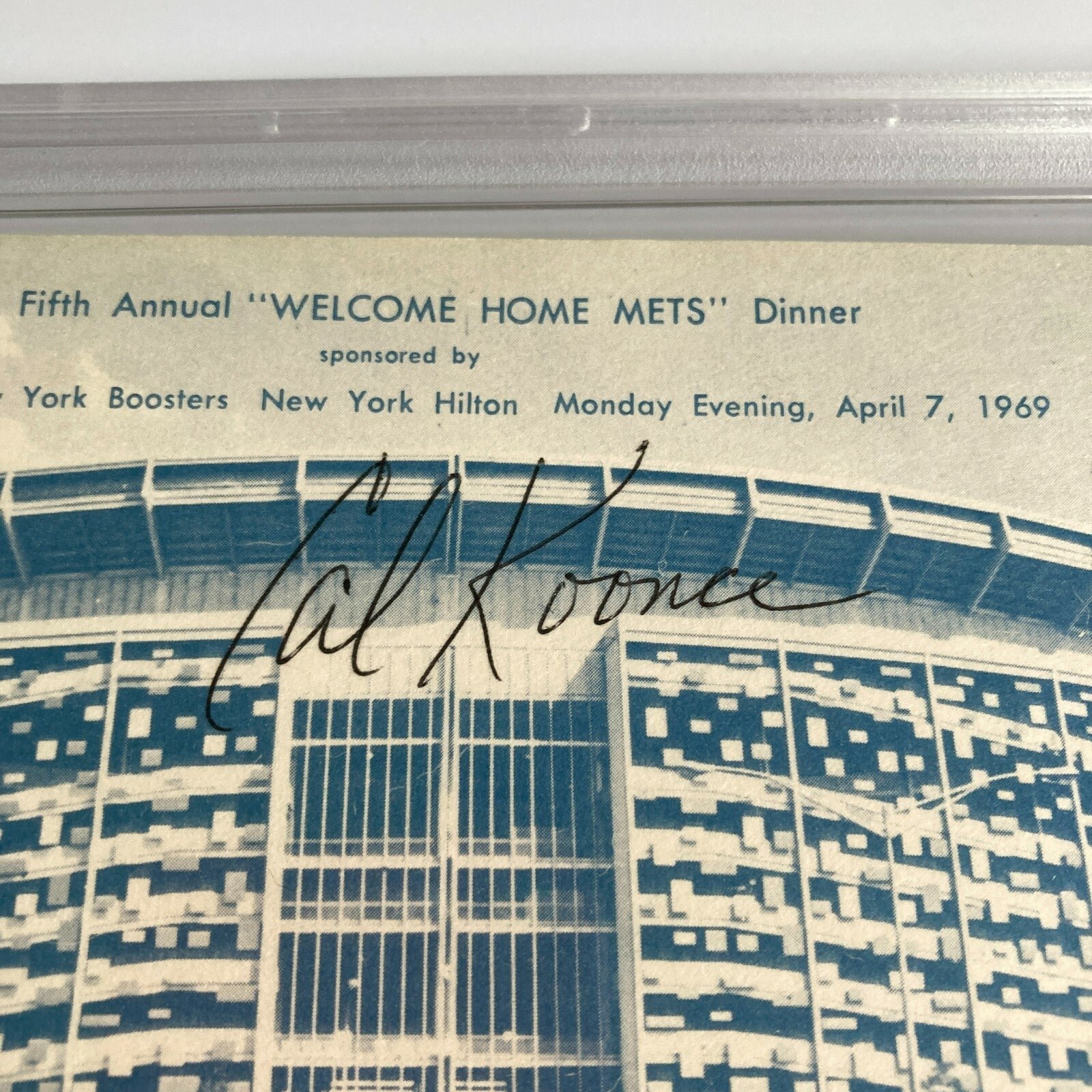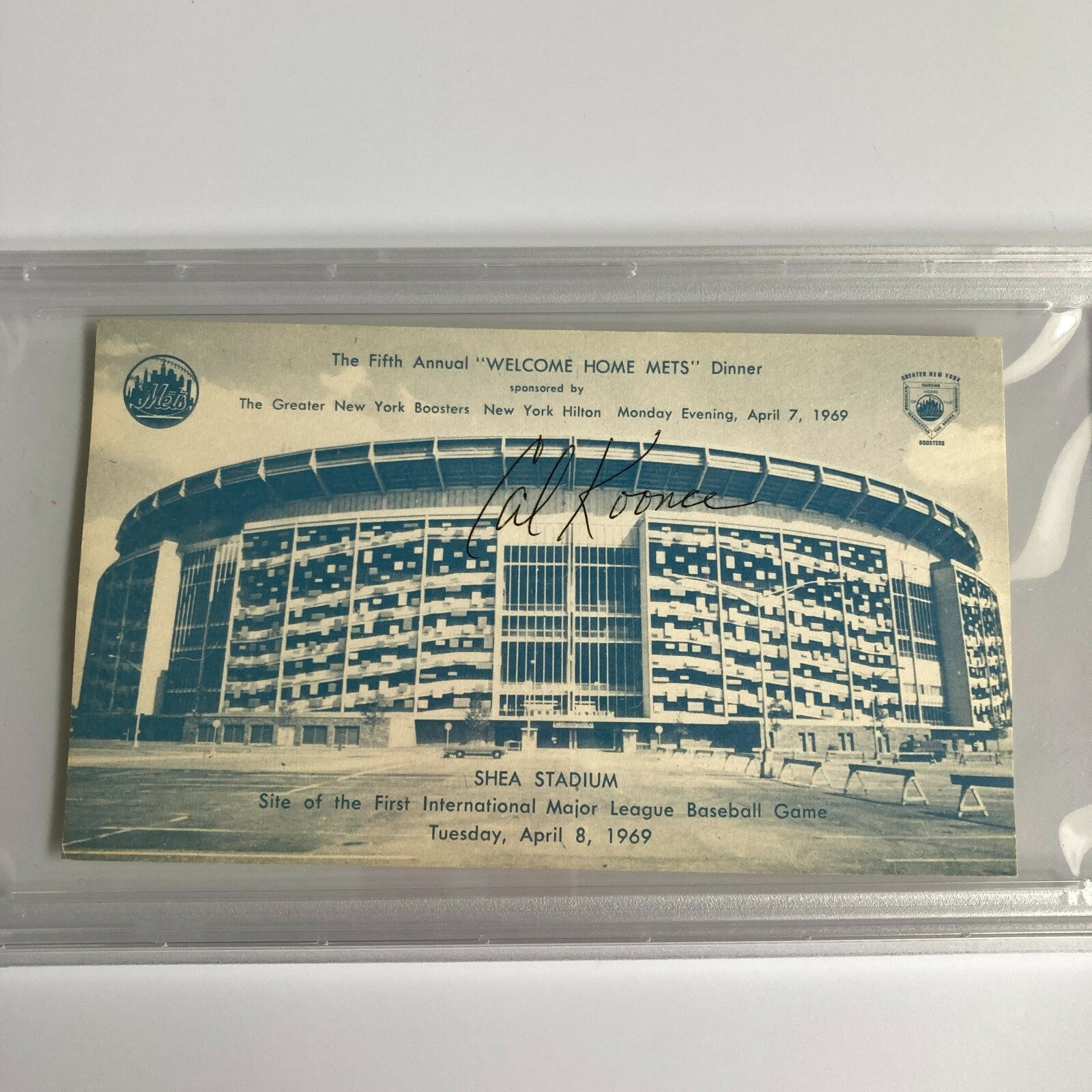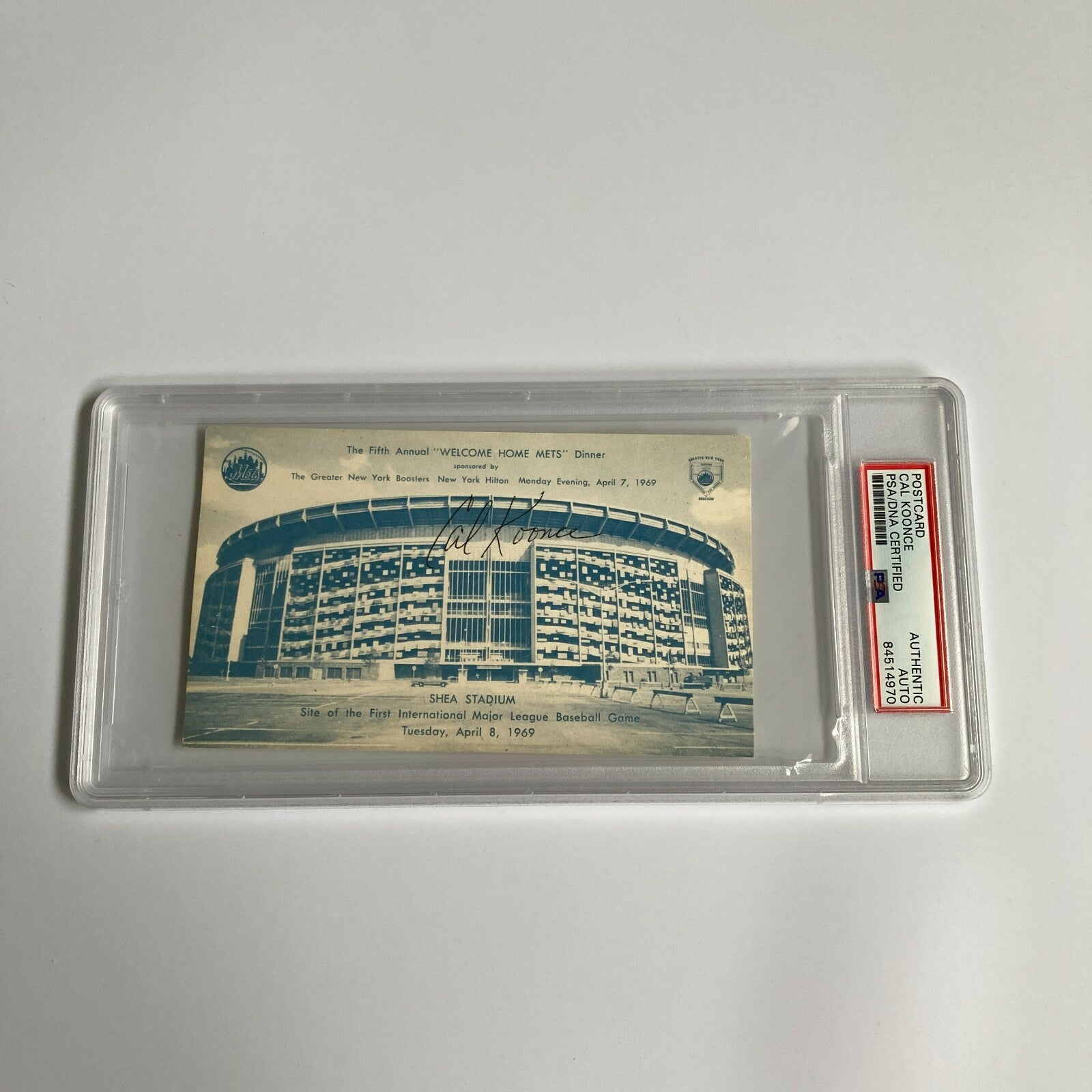 Rare April 7, 1969 New York Mets Welcome Home Dinner Shea Stadium Signed Postcard. Authenticated and encapsulated by PSA DNA.