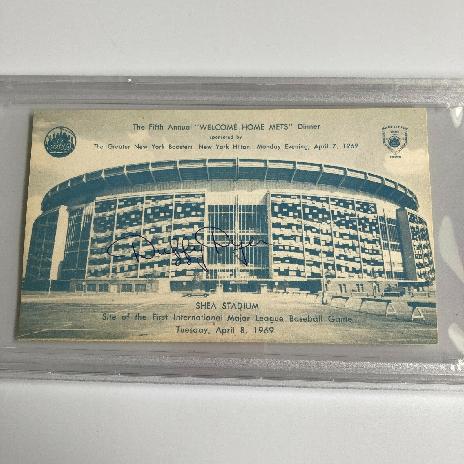 Rare April 7, 1969 New York Mets Welcome Home Dinner Shea Stadium Signed Postcard. Authenticated and encapsulated by PSA DNA.