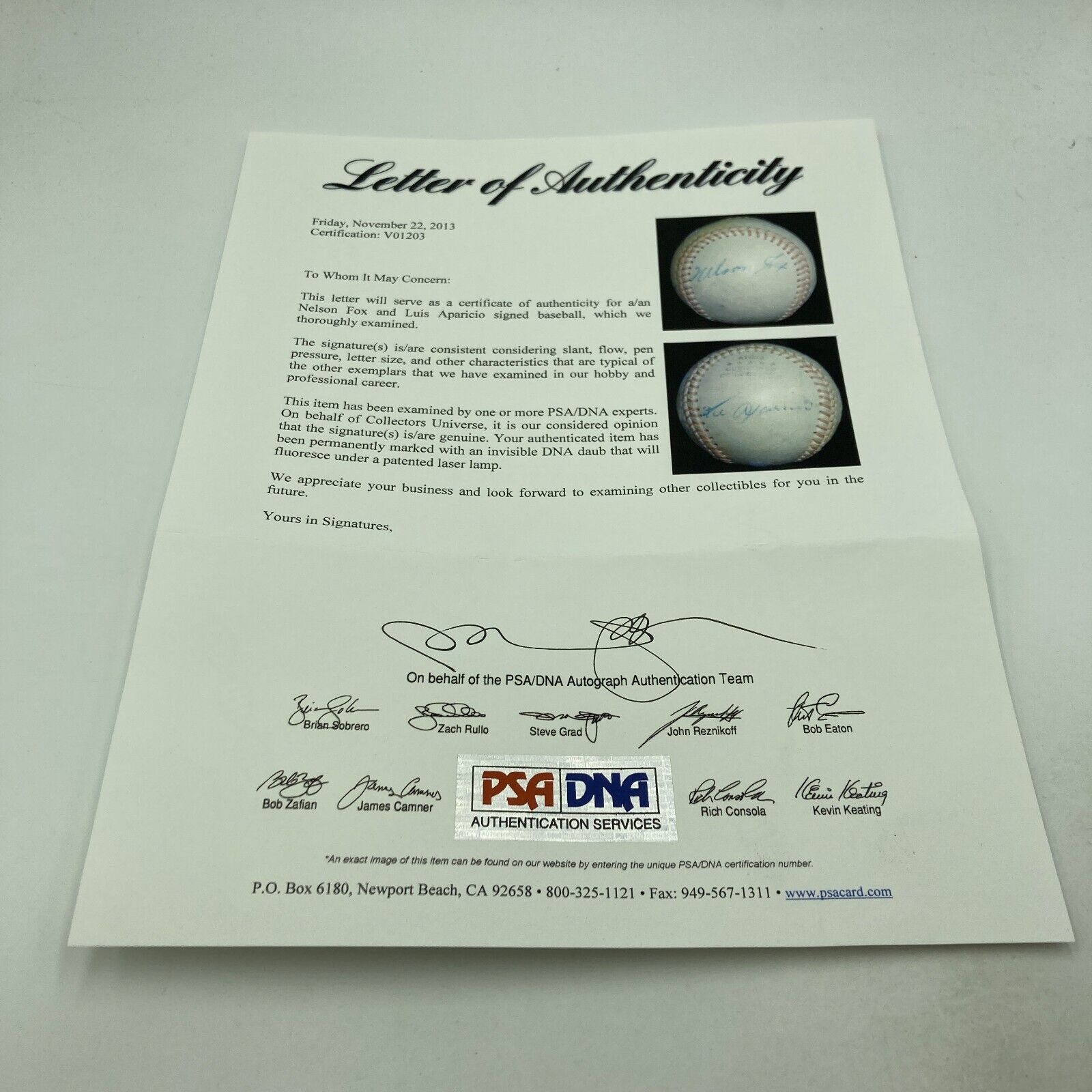 1950s Nelson Fox and Luis Aparicio autographed baseball (PSA LOA) with 1959 Topps "Keystone Combo" card.