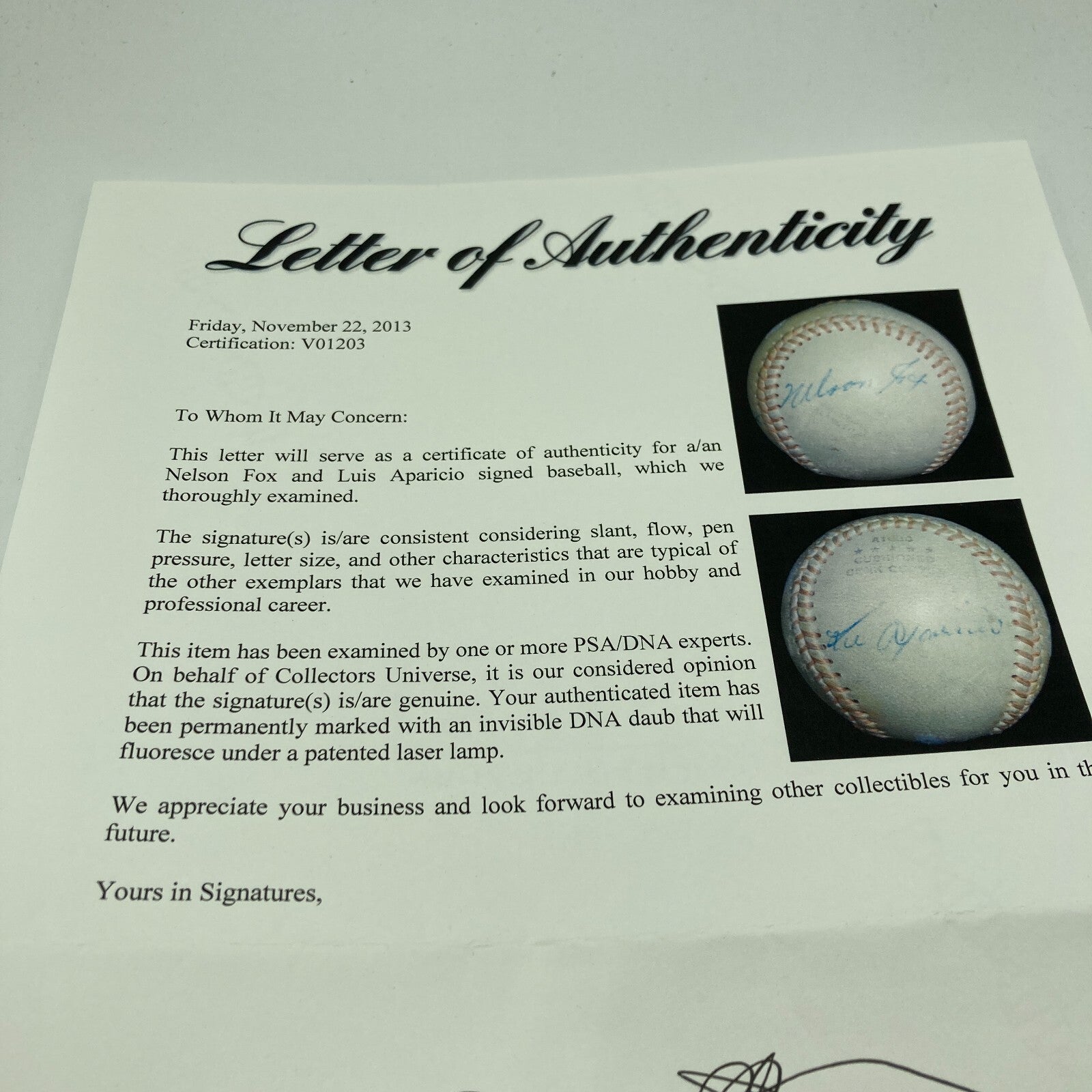 Includes baseball which has been signed on adjacent side panels by Hall of Famers Nellie Fox and Luis Aparicio.