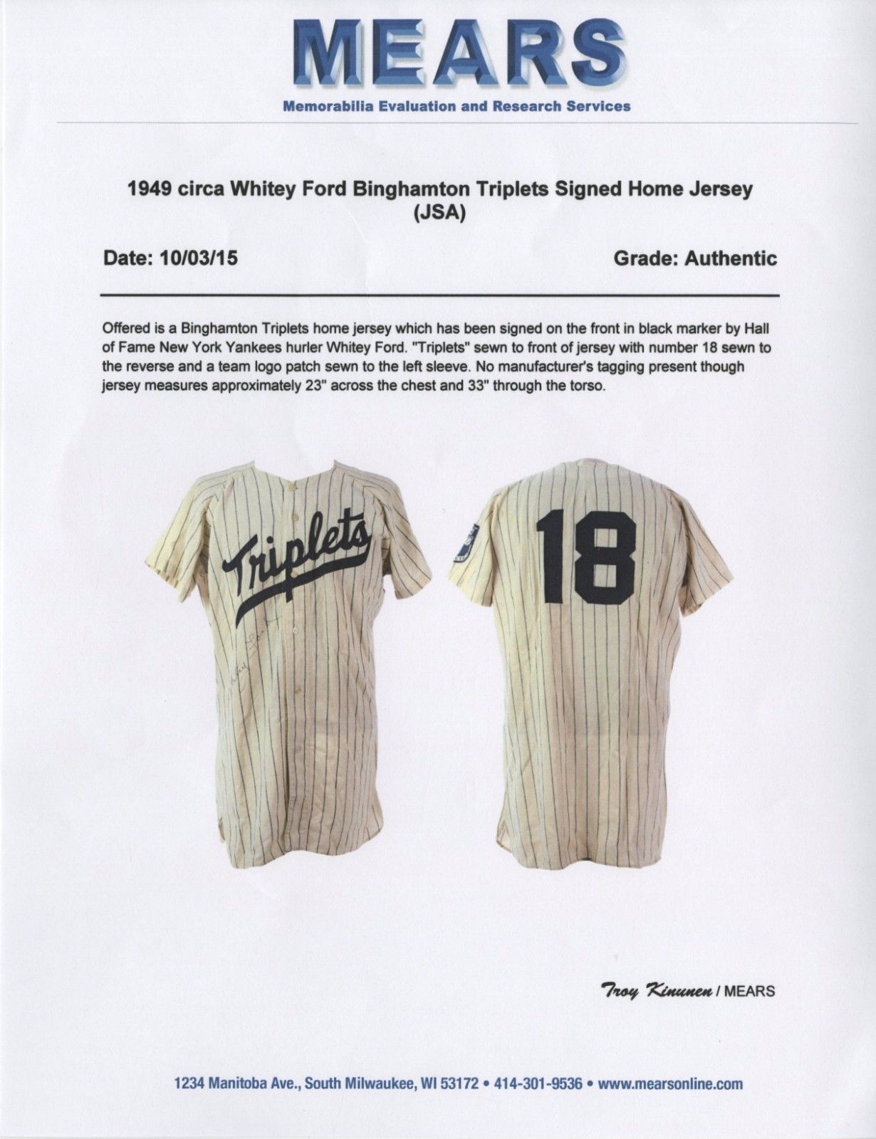 1949 Whitey Ford Signed Binghampton Yankees Minor League Game Used Jersey. This is an actual game used jersey from 1949 but it is unknown if Whitey actually wore it. It was likely worn by a different player. Comes with full letters Certificate Of Authenticity from JSA and Mears.