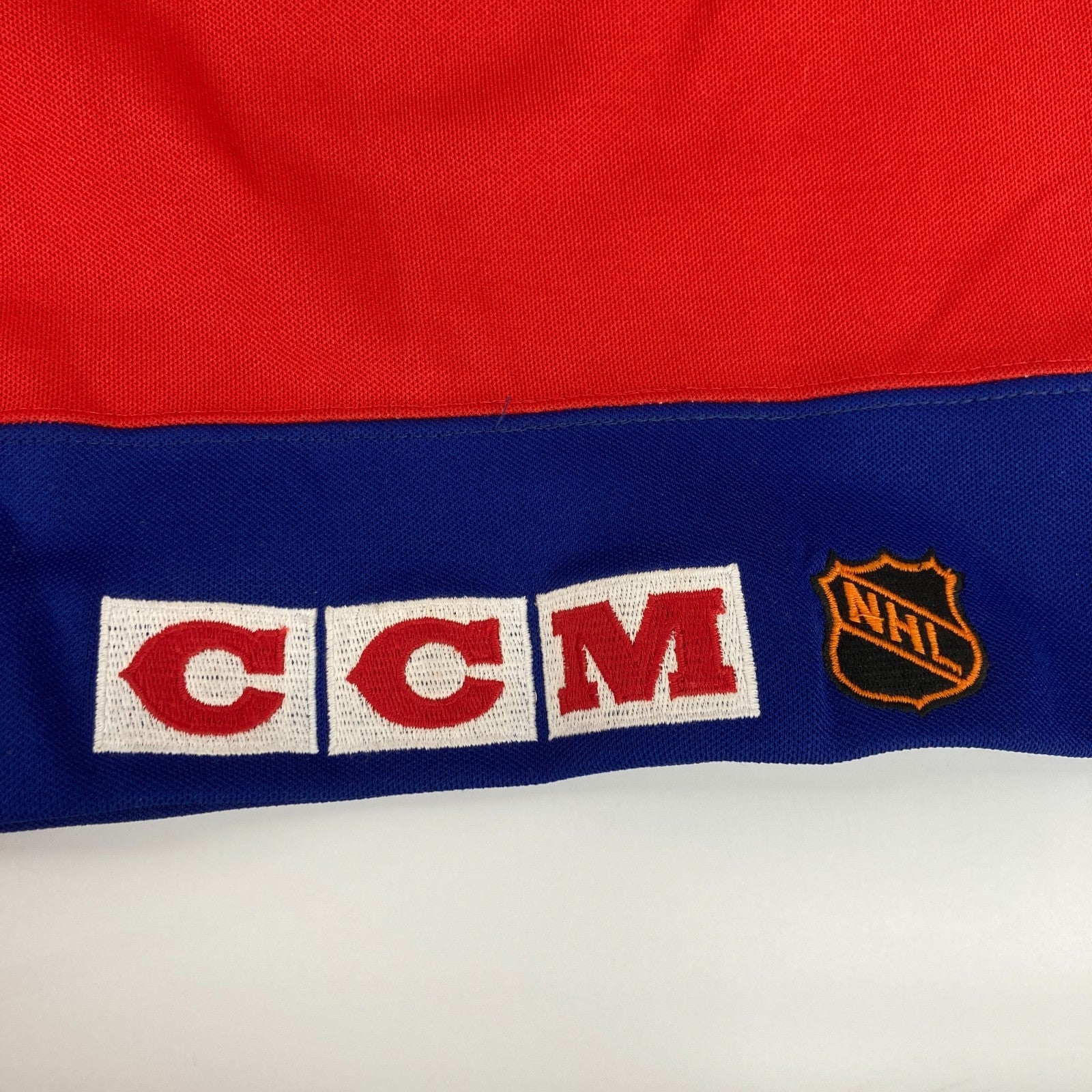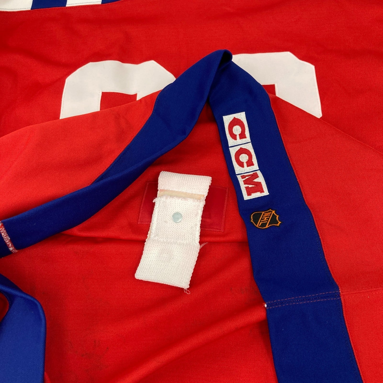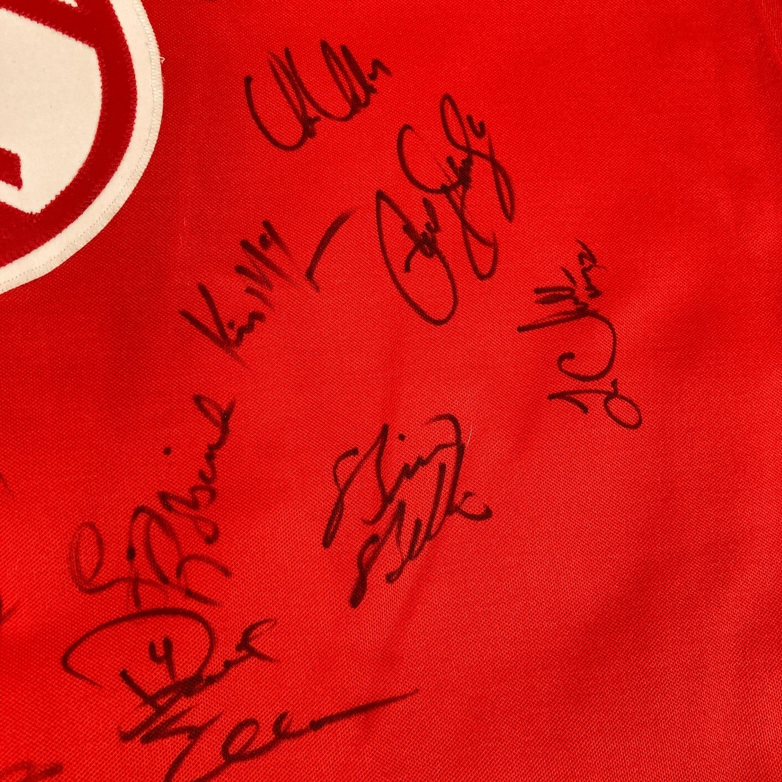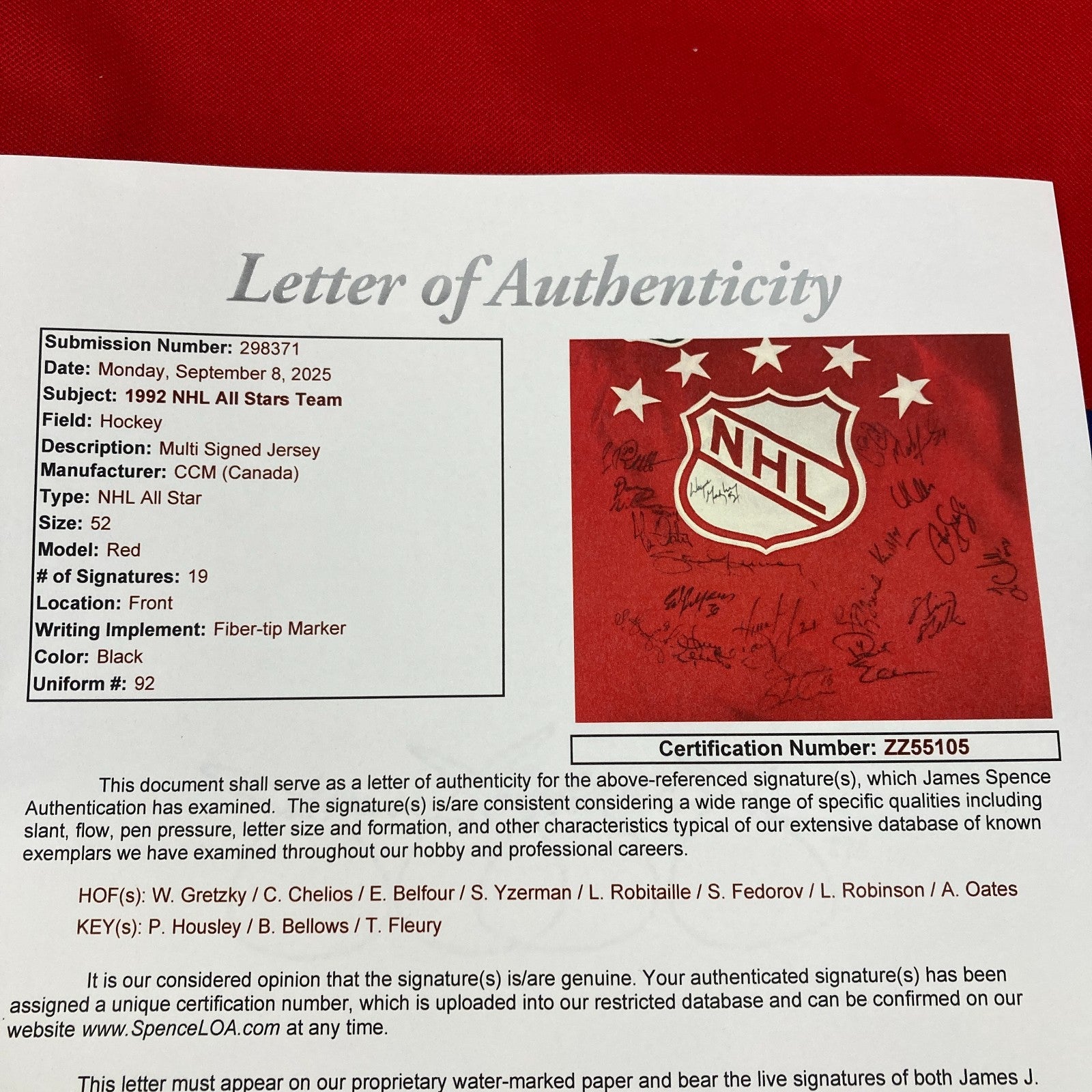 A 1992 NHL All-Star jersey signed by 19 players who participated in the game. The red number 92 jersey is made by CCM and is a size 52. The jersey also features a fight strap and an NHL 75th Anniversary patch. The jersey has been signed on the front side in black marker by: Wayne Gretzky, Steve Yzerman, Adam Oates, Doug Wilson, Luc Robitaille, Ed Belfour, Sergei Fedorov, Chris Chelios, Gary Roberts, Brian Bellows, Vincent Damphousse, Dave Ellett, Larry Robinson, Kirk McLean, Phil Housley, Mark Tinordi, Theo Fleury, and Trevor Linden.