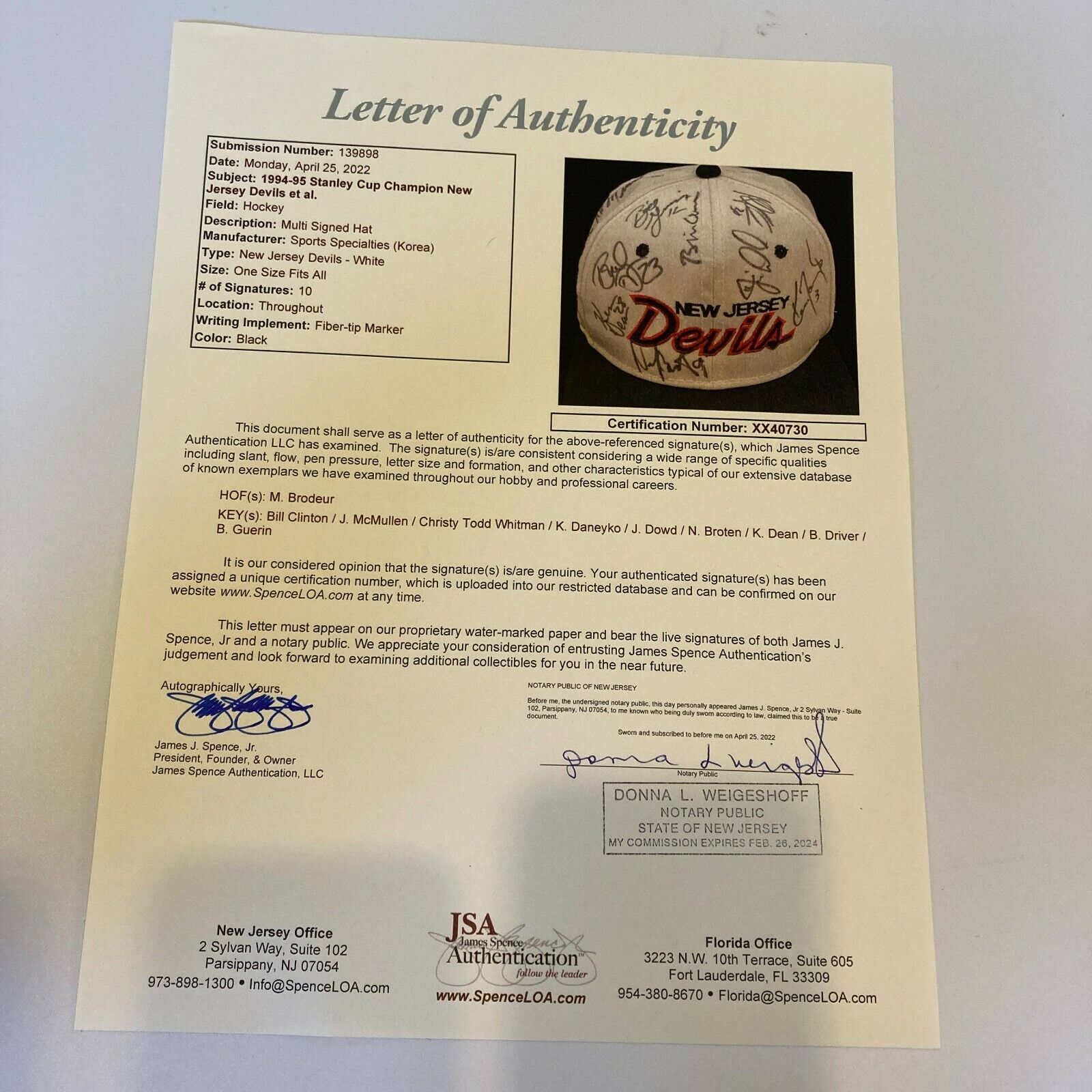 After losing in heartbreaking fashion to their bitter rival New York Rangers in sudden-death overtime of Game 7 of the 1994 Eastern Conference Finals, the New Jersey Devils came back the following season and ran the table as they secured the first Stanley Cup championship in franchise history. The 1995 New Jersey Devils, led by head coach Jacques Lemaire, posted a 22-18-8 record in the lockout-shortened season. The white New Jersey Devils cap with a black brim has President Clinton’s signature in black marker, along with signatures of Neal Broten, Bruce Driver, Bill Guerin, Martin Brodeur, Ken Daneyko, Kevin Dean and many others. Most likely signed at the White House during the Awards Ceremony.