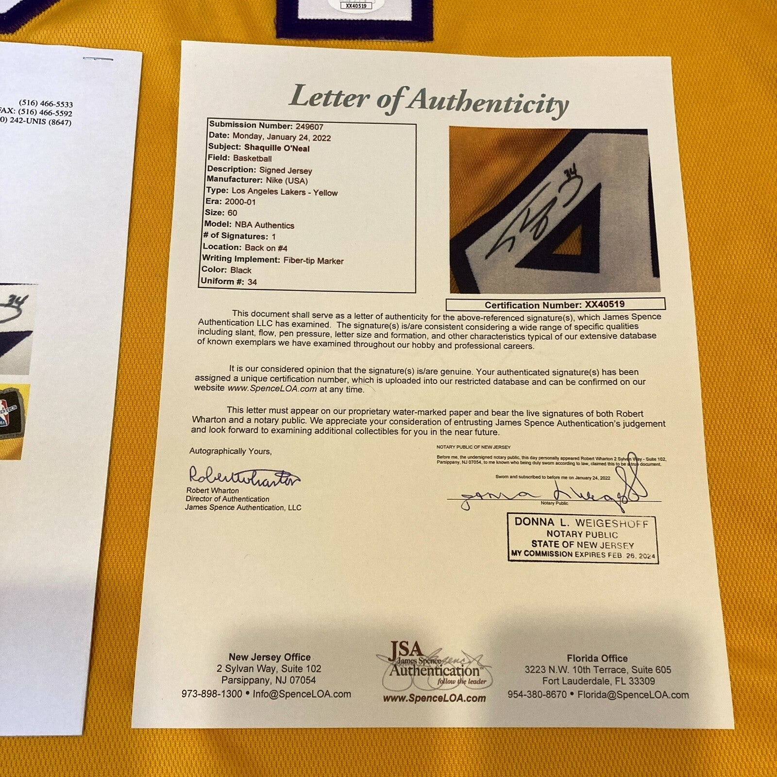 Shaquille O’Neal dominated the 2000-01 NBA Finals, averaging 33 points, 15.8 rebounds, 4.8 assists and 3.4 blocks to take home the series MVP award. On the front left tail is a Nike size “60” manufacturer’s tag with a flag tag attached that reads, “LENGTH + 4”. On the left inseam is a materials tag with washing instructions and a Nike “2000-01” year tag. On the left chest is the official “NBA” logo embroidered. Across the chest reads, “LAKERS” and across the back reads the player name “O’NEAL”. These are done in purple on white tackle twill. The player number “34” appears on both the front and on the back in white on purple tackle twill. O’Neal signed the back of the jersey inside the player number “4” in black marker. Comes with COA from JSA, Grey Flannel and D.C. Sports.