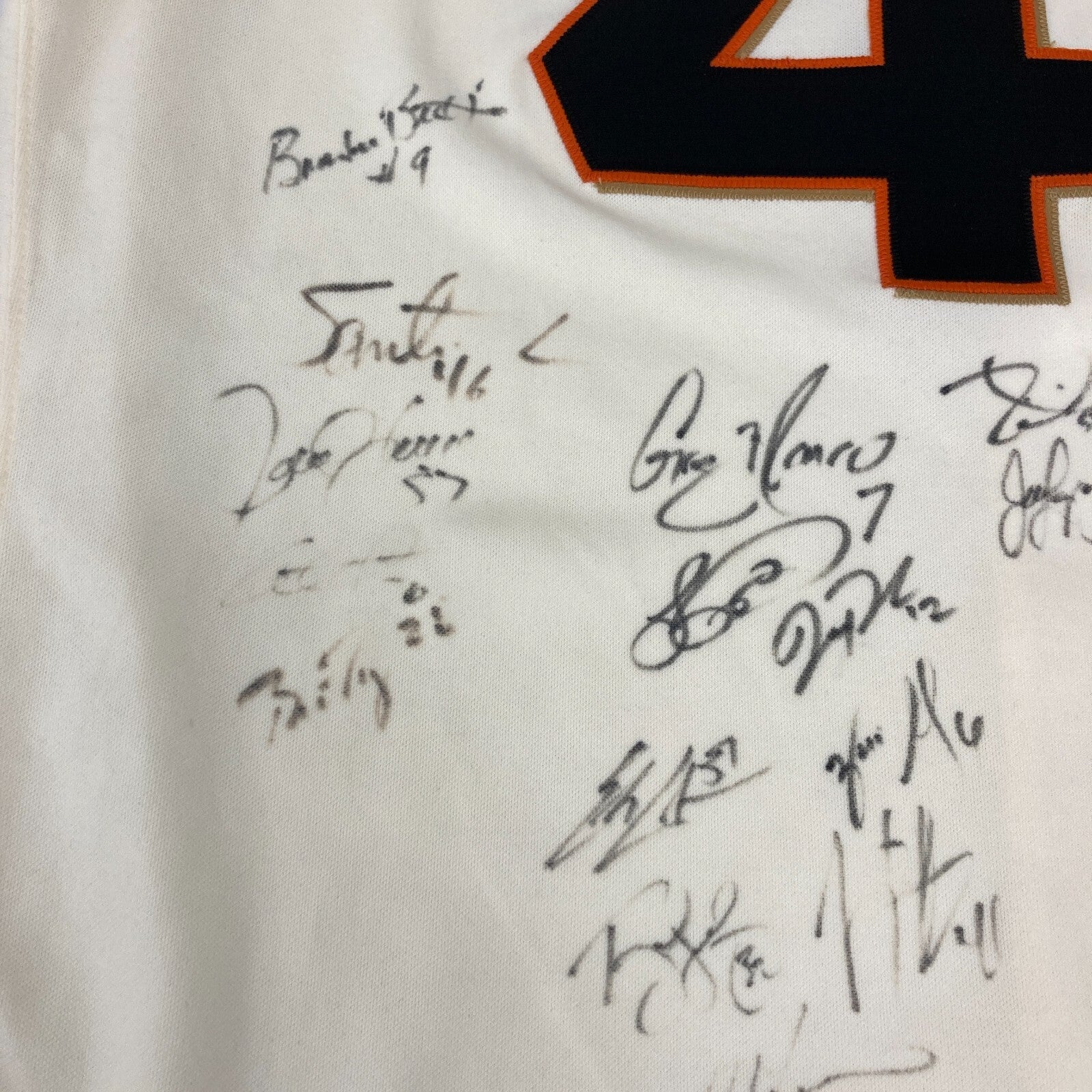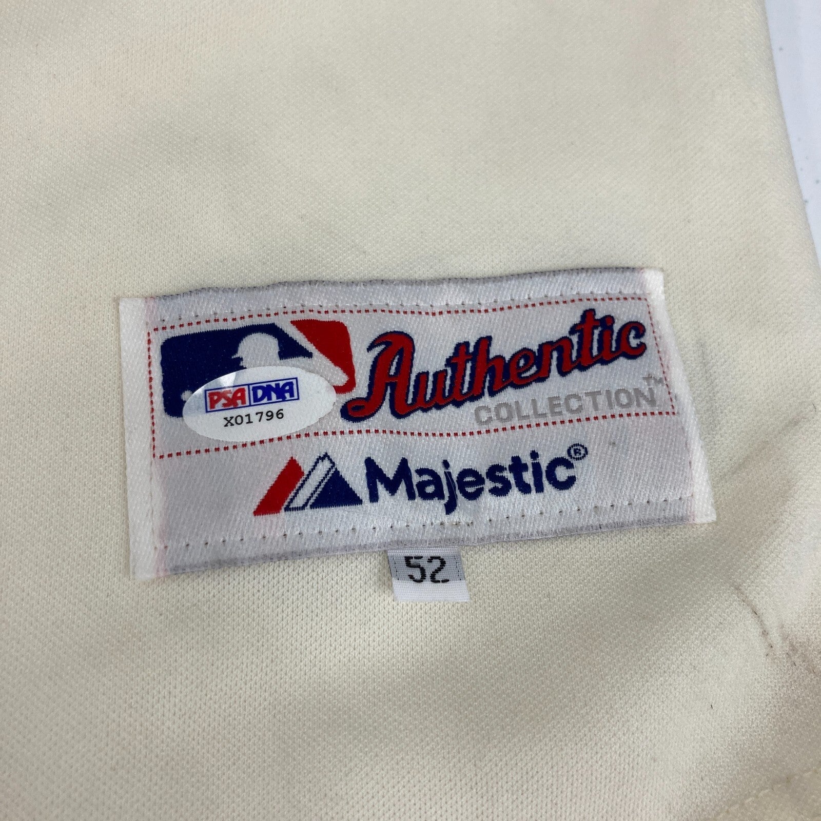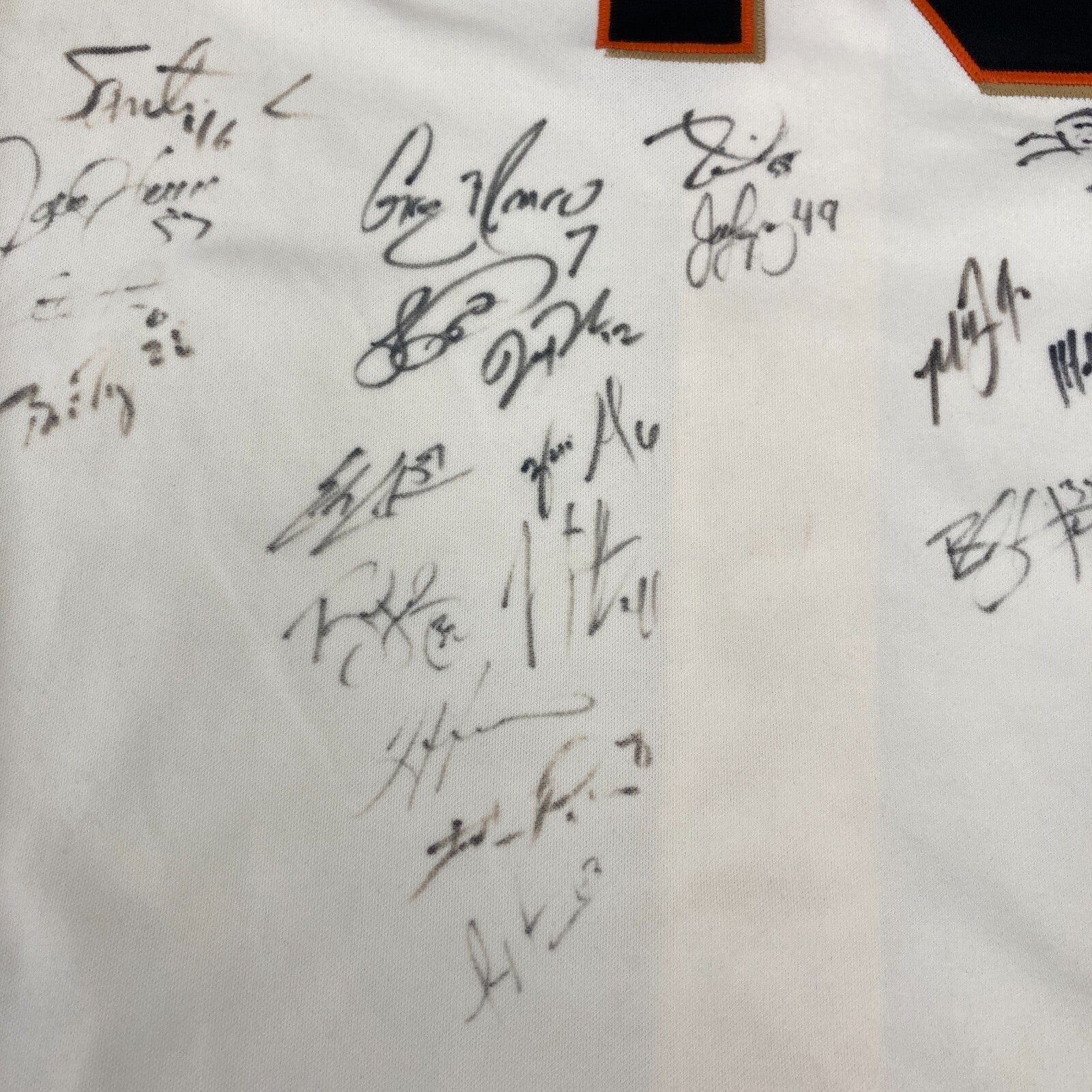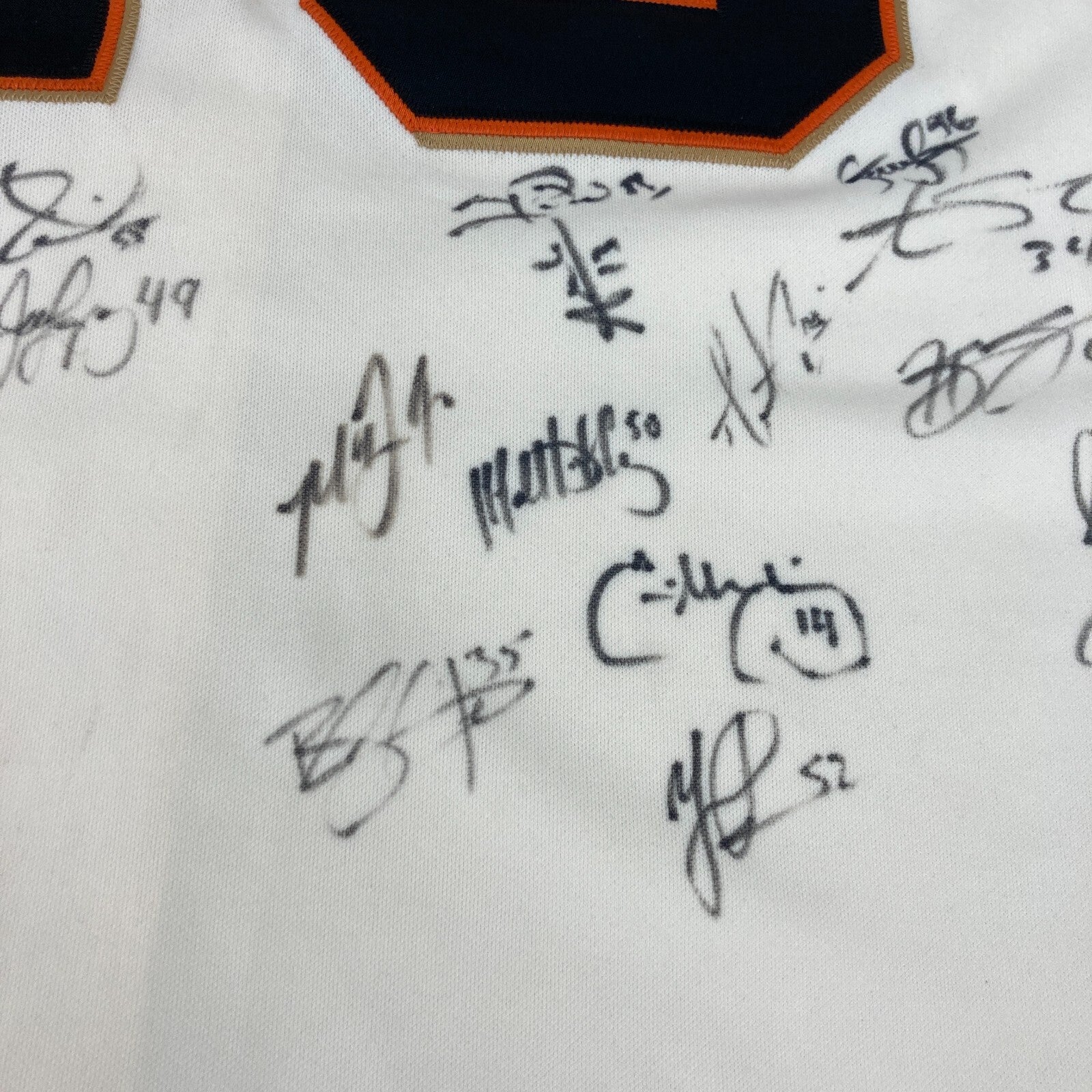 2014 San Francisco Giants team signed Pablo Sandoval jersey with WS patch (PSA/DNA) (EX-EX/MT) Majestic brand jersey with Sandoval's number "48" on the back (size 52) has a World Series patch on the sleeve. It has been signed on the back by (30) member of the Championship team including Madison Bumgarner, Buster Posey, Hunter Pence, Tim Lincecum, Matt Cain, Brandon Crawford, Tim Hudson, Brandon Belt, Joe Panik, Gary Brown, Andrew Susac, Hunter Strickland, Adam Duvall, Travis Ishikawa, Sergio Romo, Joaquin Arias, Guillermo Quiroz, Yusmeiro Petit, Matt Duffy, Javier Lopez, Gregor Blanco, Juan Perez, Erik Cordier, Ehire Adrianza, Ryan Vogelson, Jeremy Affeldt, Jean Machi, Santiago Casilla, George Kontos, and Juan Gutierrez. Jersey has some very minor condition flaws which are largely noted for accuracy (mostly being a hint of light scattered soiling). PSA/DNA Authentication label affixed (X01796). Comes with full letter PSA DNA COA.