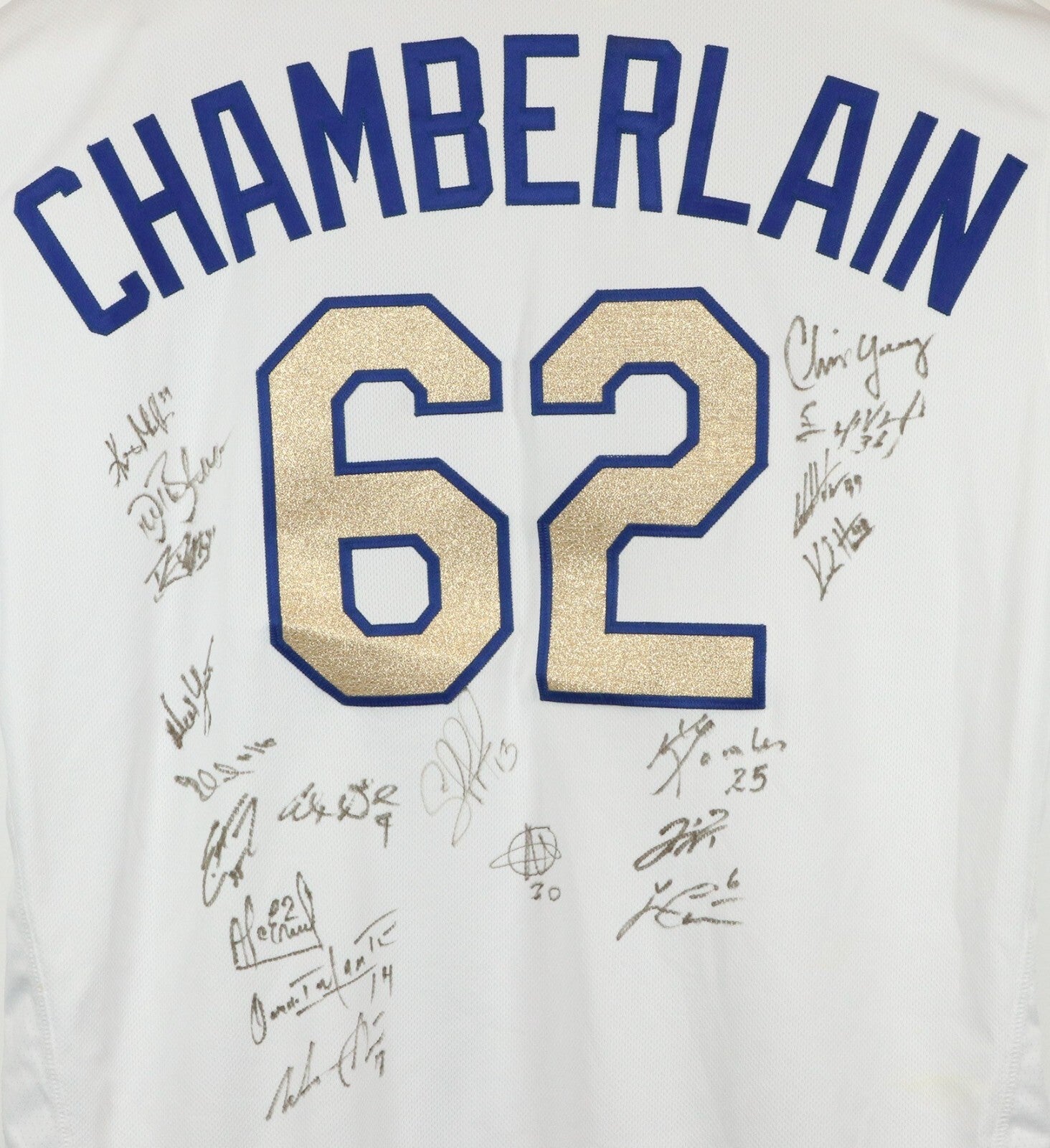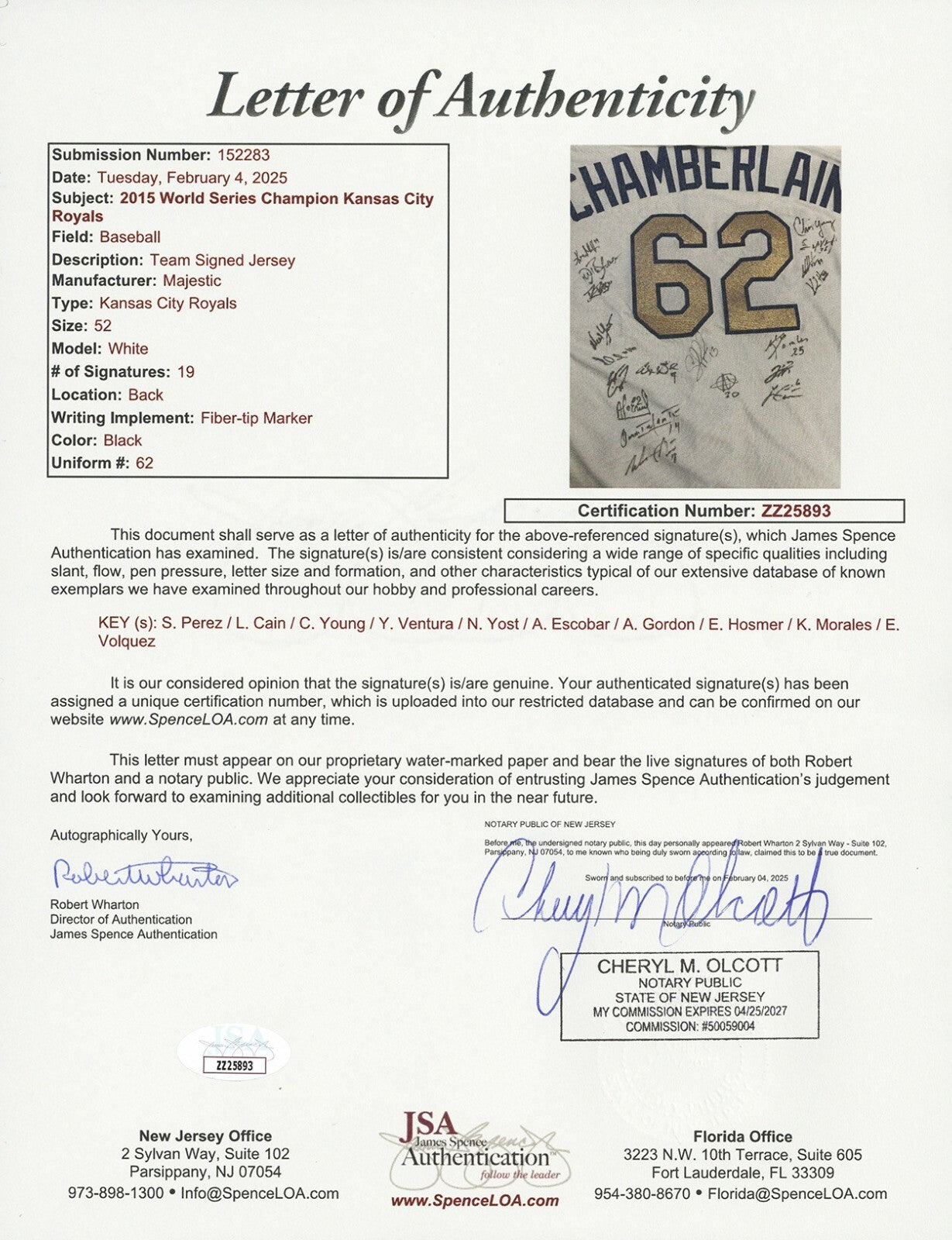 White Kansas City Royals Authentic Majestic jersey signed by 19 teammates to Joba Chamberlain in black ink surrounding the #62 numbers. Comes with full letter JSA COA James Spence Authentication.