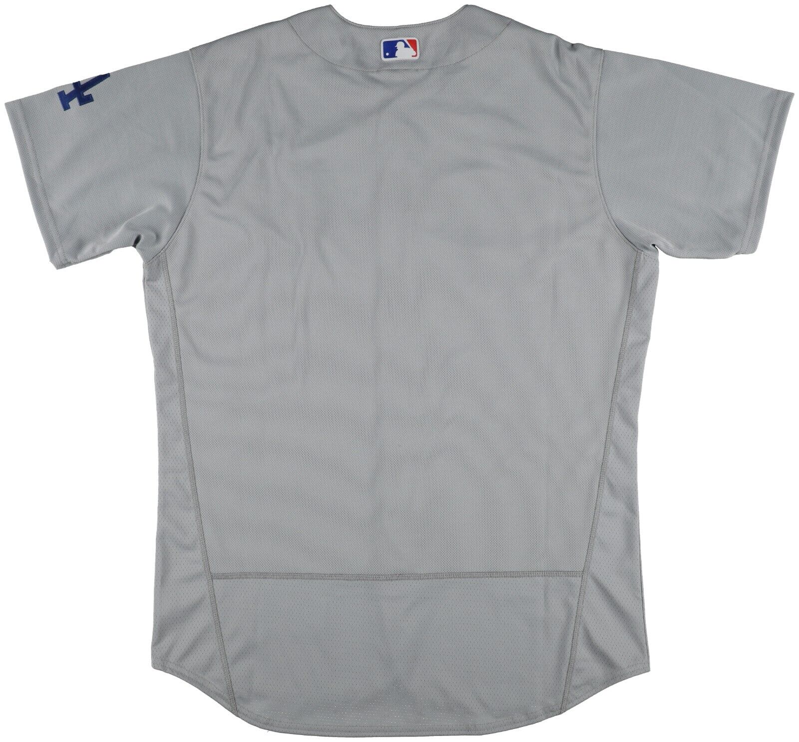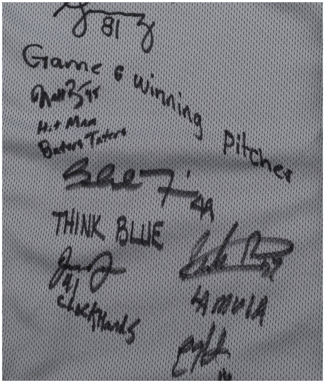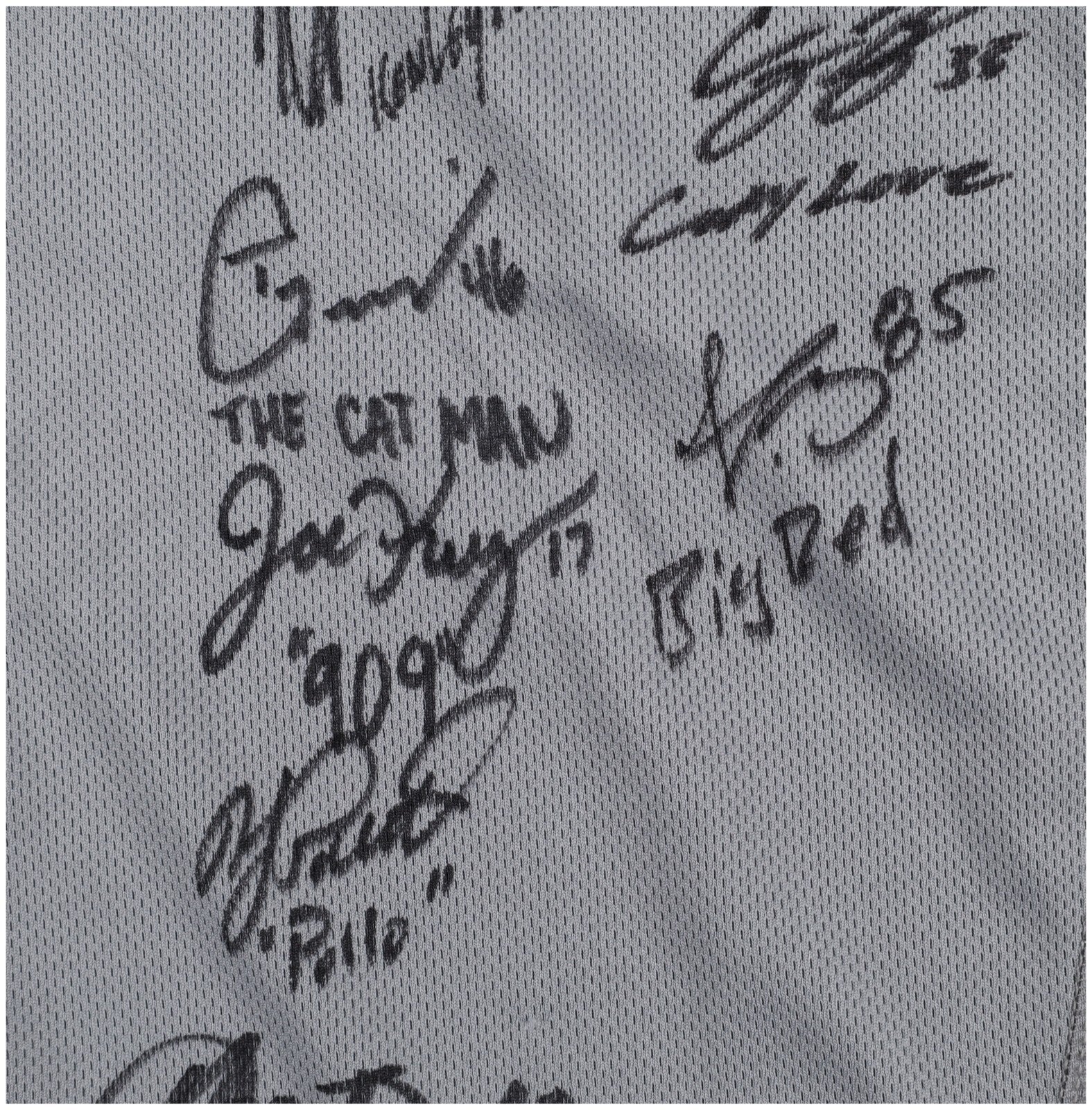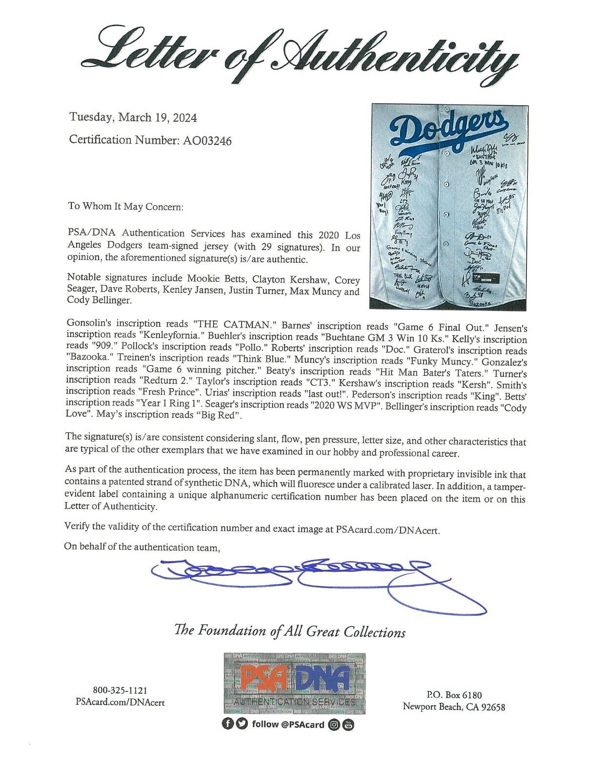 Los Angeles Dodgers authentic Nike jersey containing the signatures of 29 members from the 2020 World Series champion Dodgers team is presented. Each signature has been penned in black marker throughout the front of the jersey. Notable signatures include Mookie Betts, Clayton Kershaw, Corey Seager, manager Dave Roberts, Kenley Jansen, Justin Turner, Max Muncy, and Cody Bellinger. Several signatures include inscriptions from the players, the majority of which are their individual nicknames. The jersey comes with an LOA from PSA/DNA (AO03246) for signatures.