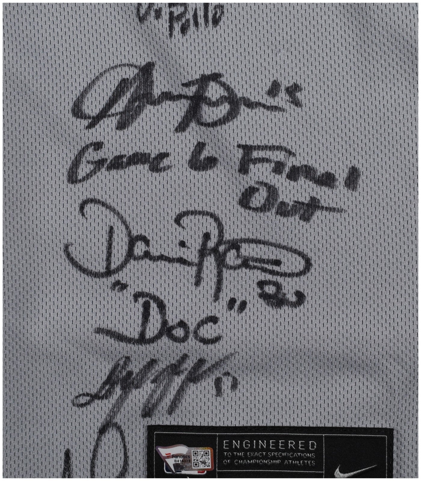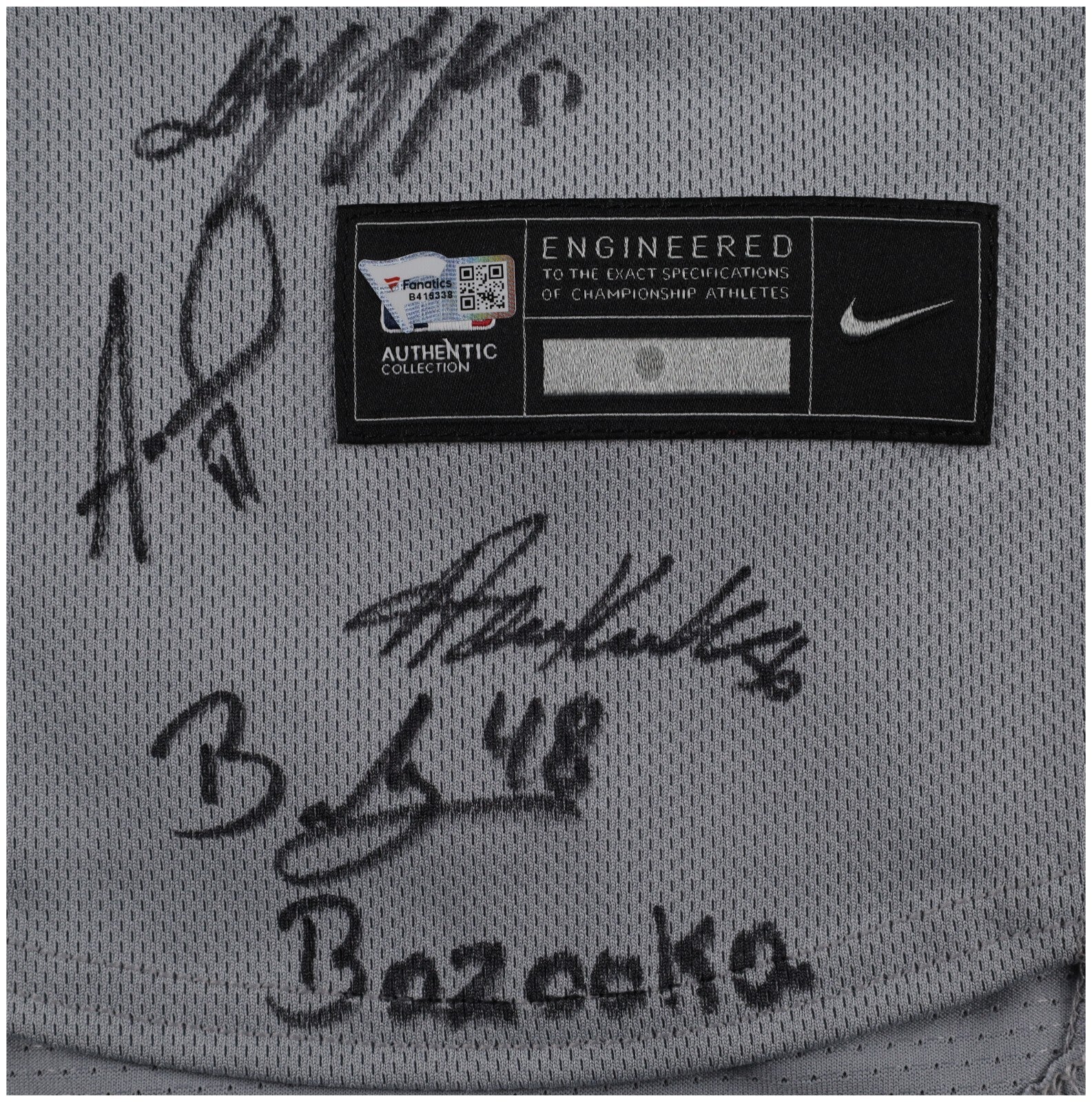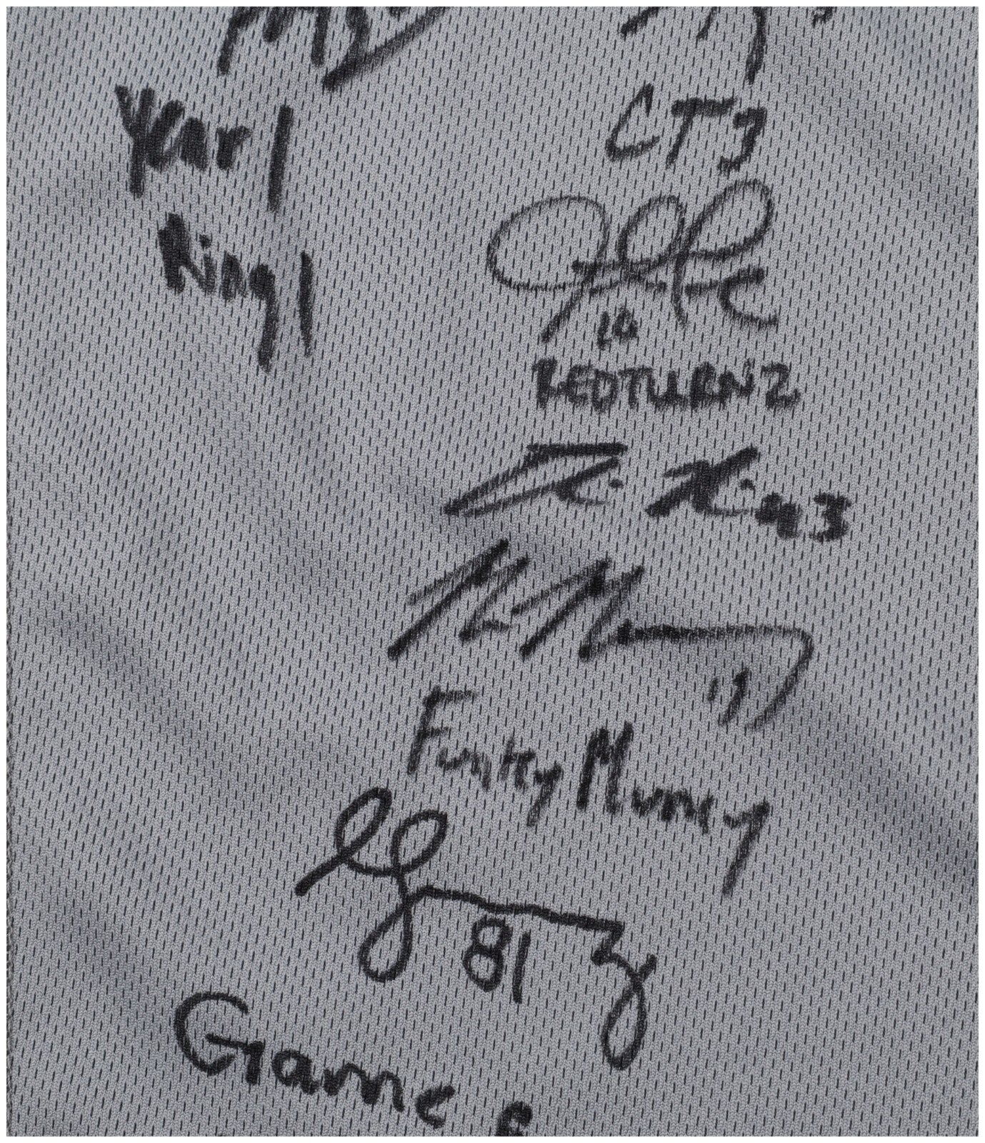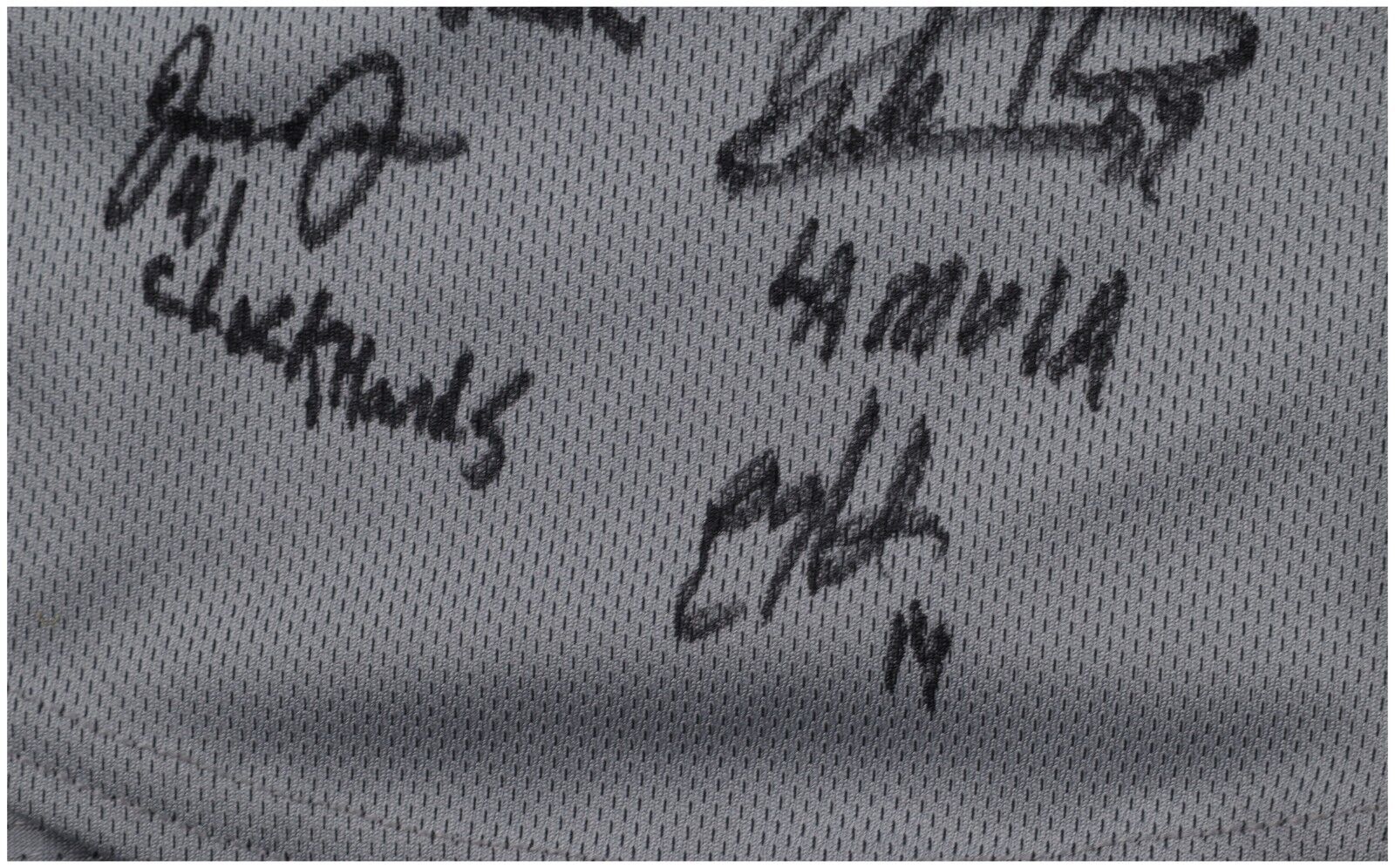 Los Angeles Dodgers authentic Nike jersey containing the signatures of 29 members from the 2020 World Series champion Dodgers team is presented. Each signature has been penned in black marker throughout the front of the jersey. Notable signatures include Mookie Betts, Clayton Kershaw, Corey Seager, manager Dave Roberts, Kenley Jansen, Justin Turner, Max Muncy, and Cody Bellinger. Several signatures include inscriptions from the players, the majority of which are their individual nicknames. The jersey comes with an LOA from PSA/DNA (AO03246) for signatures.