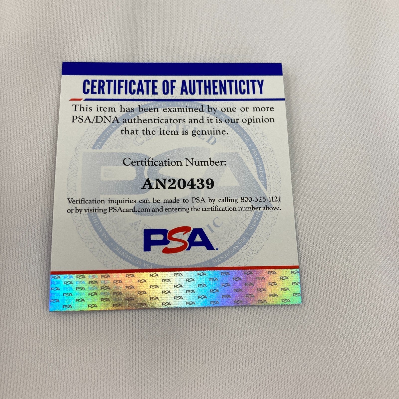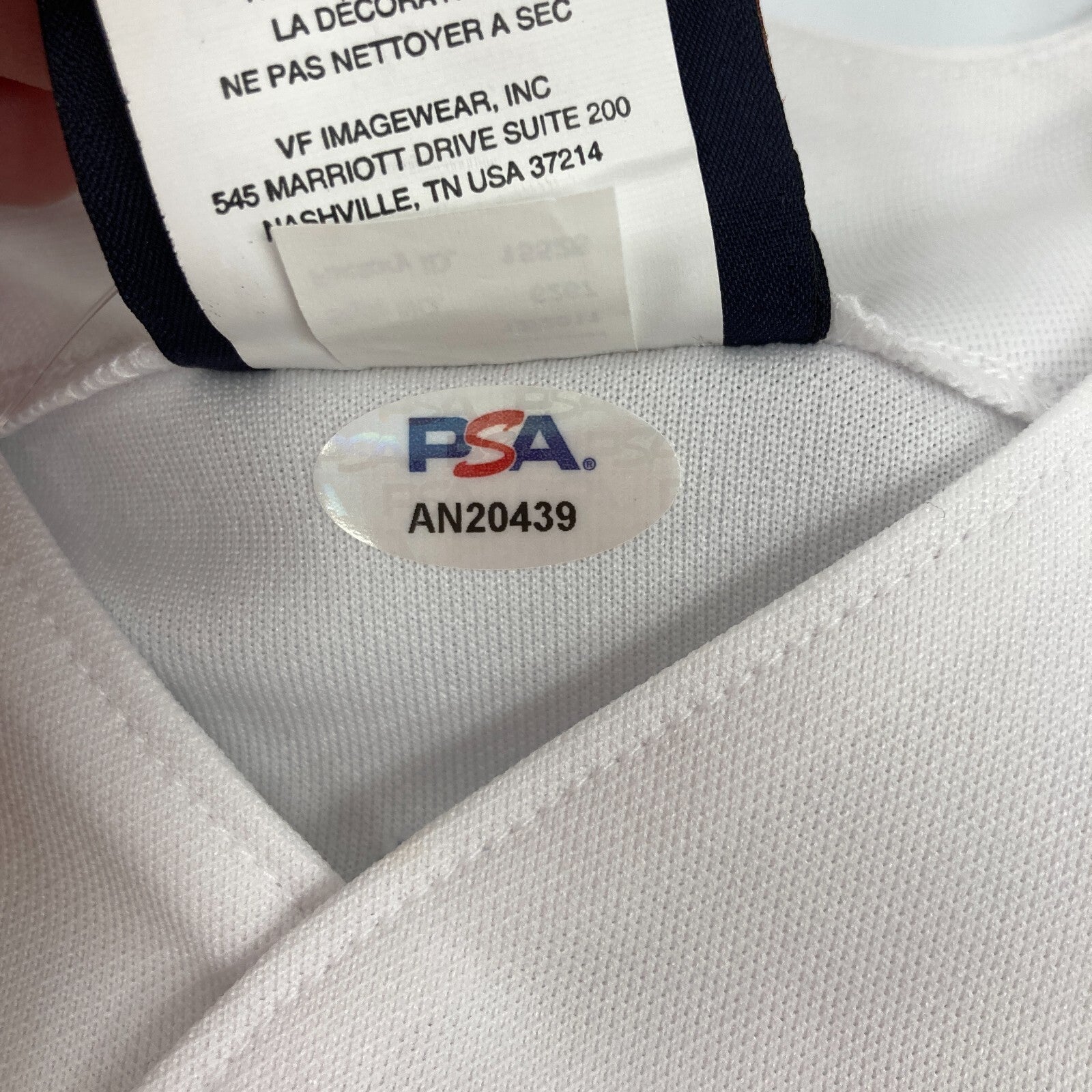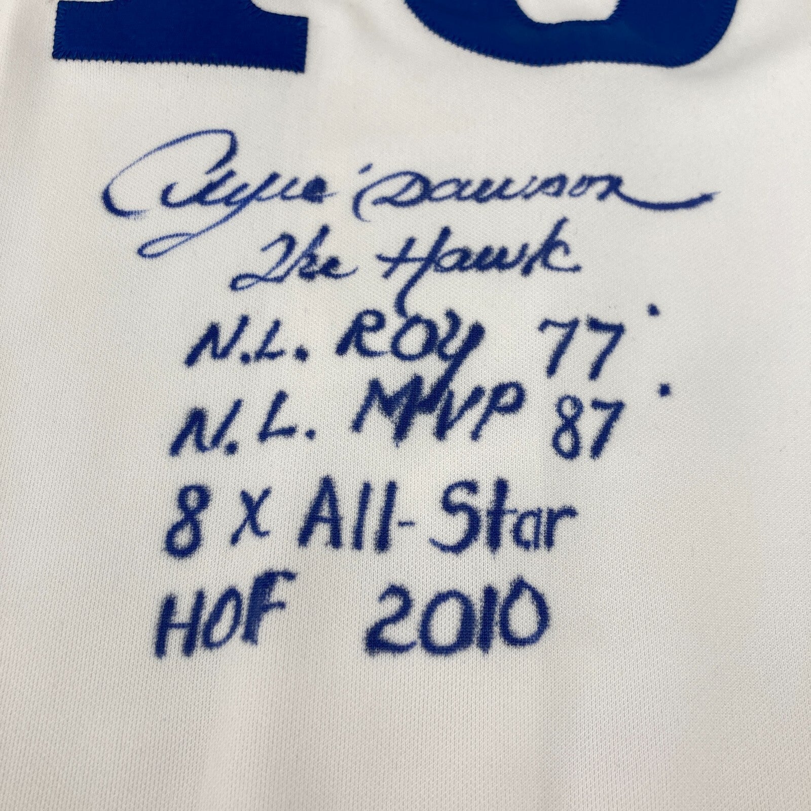 Andre Dawson autographed stat inscribed Montreal Expos jersey (Sig. NM/MT). Majestic Cooperstown Collection size M jersey has been signed by Dawson on the back in blue marker. In addition, Dawson has added "The Hawk" and (4) career-related statistic inscriptions.