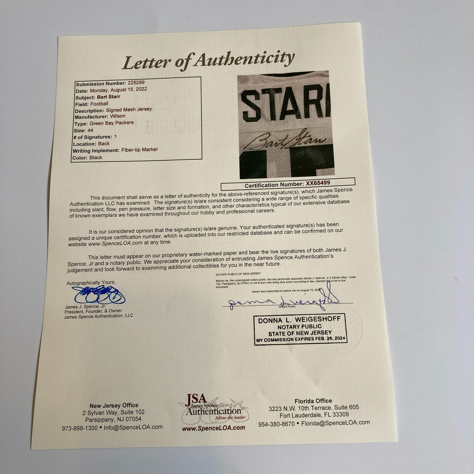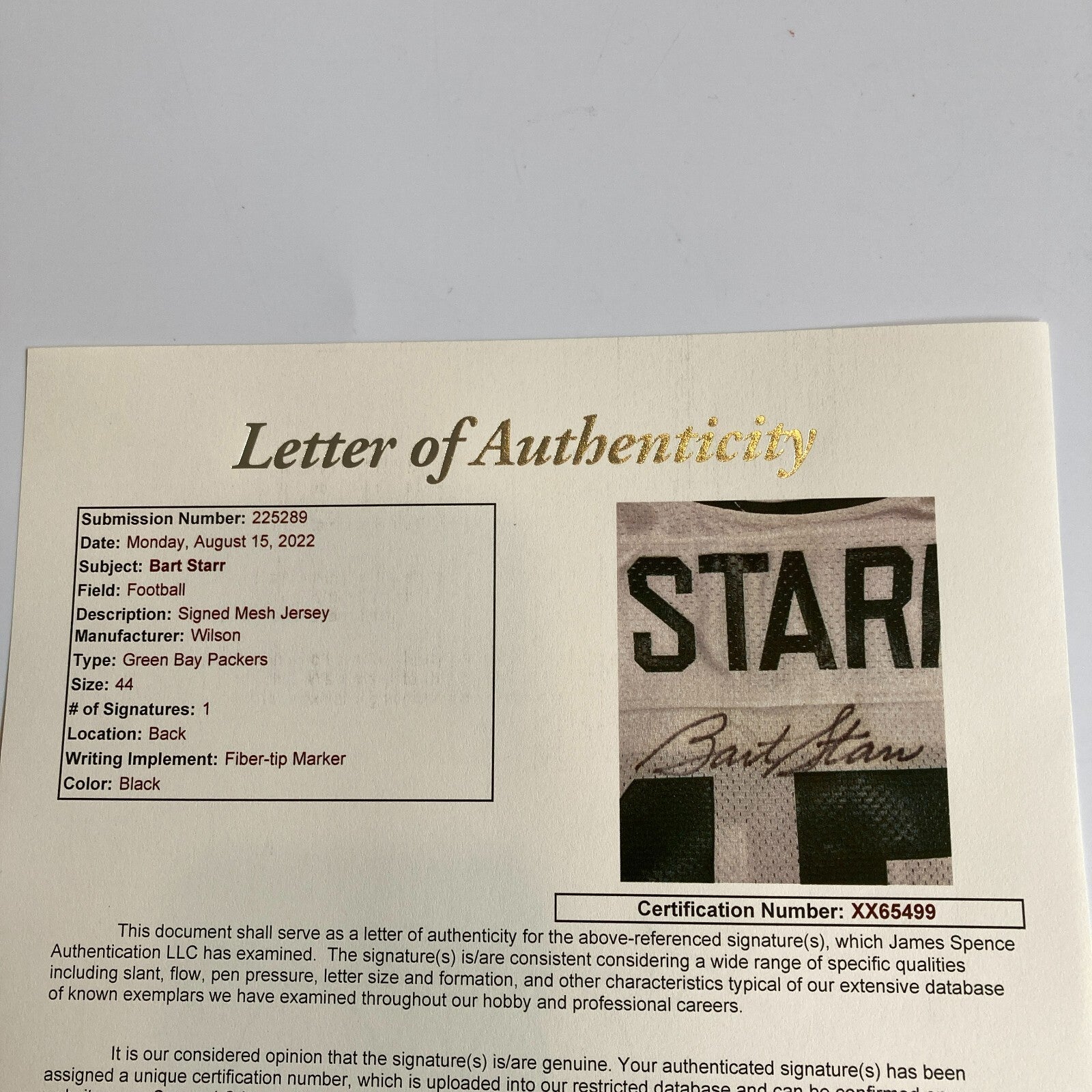 Bart Starr Signed Authentic Green Bay Packers Wilson Game Model Jersey JSA COA