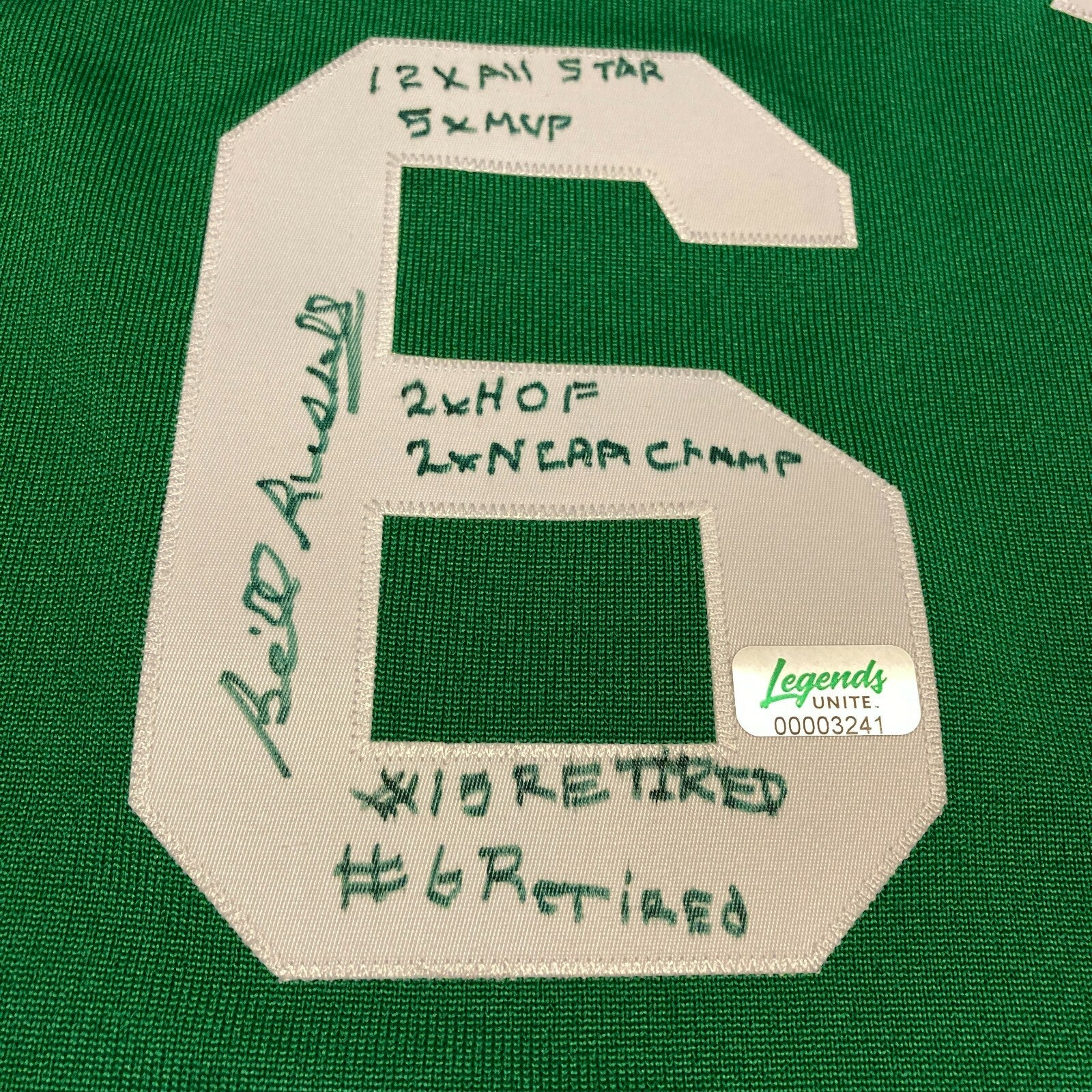Bill Russell autographed and statistically inscribed Boston Celtics authentic jersey by Mitchell & Ness.