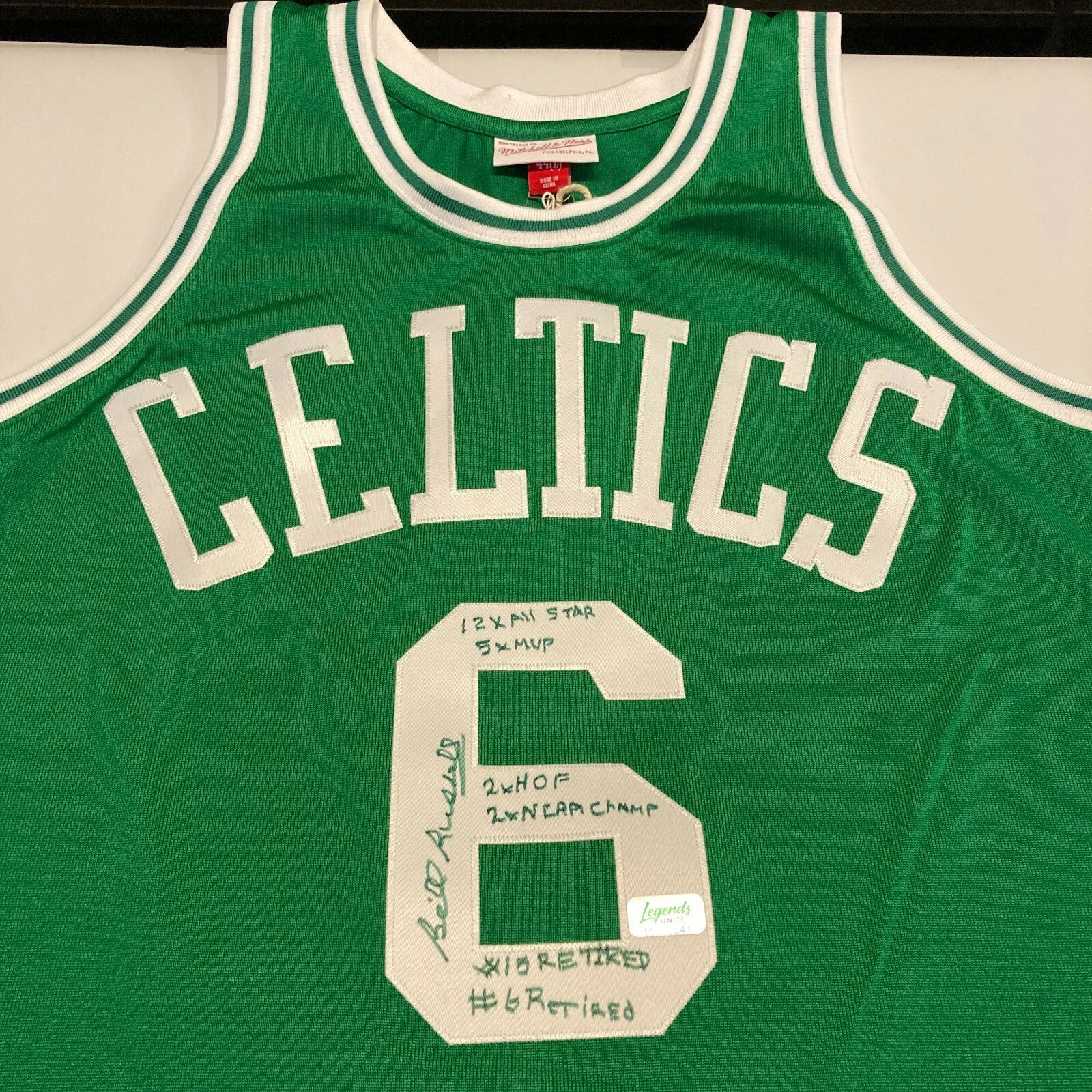 Top of the line Mitchell & Ness "Hardwood Classics" Boston Celtics 1967-68 style jersey which has been autographed by Russell across the front in green sharpie. Russell has added the highly uncommon career statistical inscriptions, "12XAll-Star, 5XMVP, 2XNCAAChamp, #15 Retired, #6 Retired". Very seldom offered Russell signed jersey with career stat inscriptions. Includes full LOA from JSA with Legends Unite hologram affixed and certificate of provenance from Bill Russell.