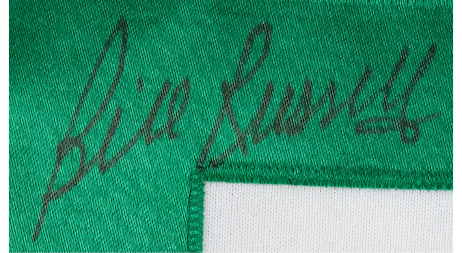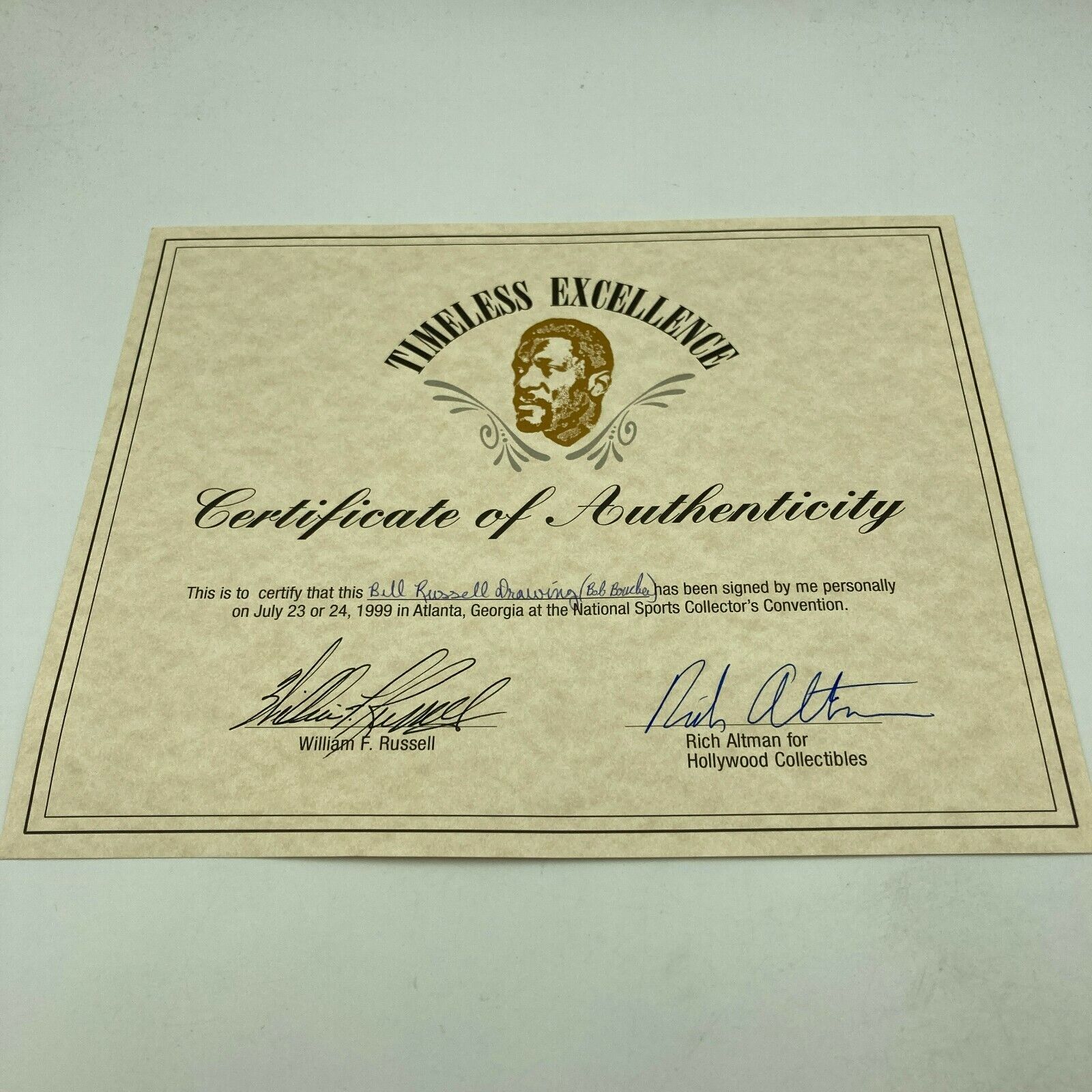 Bill Russell Signed (Twice) Boston Celtics Art Jersey. The legendary Celtics big man Bill Russell is rendered splendidly on this size 48 Mitchell & Ness jersey. Signed on the front and the back by Russell in black sharpie, it displays nicely. COA from Russell/Altman. Full LOA from Beckett Authentication Services. Full LOA from PSA/DNA.