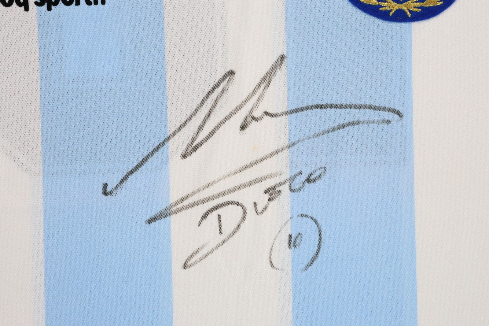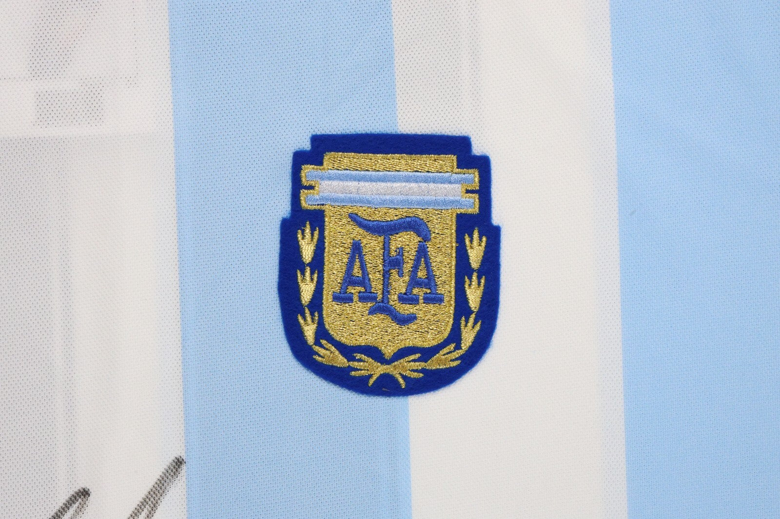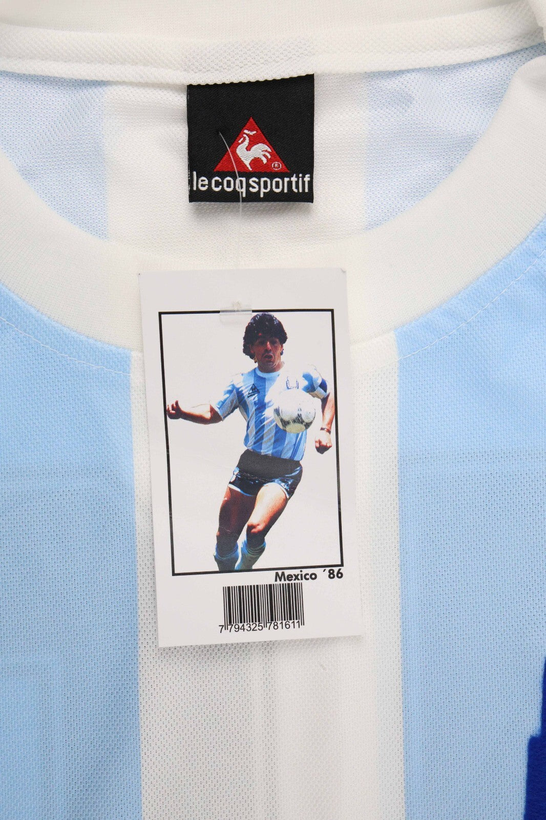 Offered is an Argentina National Team jersey signed by Maradona across the front. The throwback shirt made by Le Coq Sportif (size L) is stylized like the Argentina 1986 World Cup jerseys. Maradona emblazoned the jersey with a large autograph done in black permanent marker. Includes full LOA from PSA/DNA.