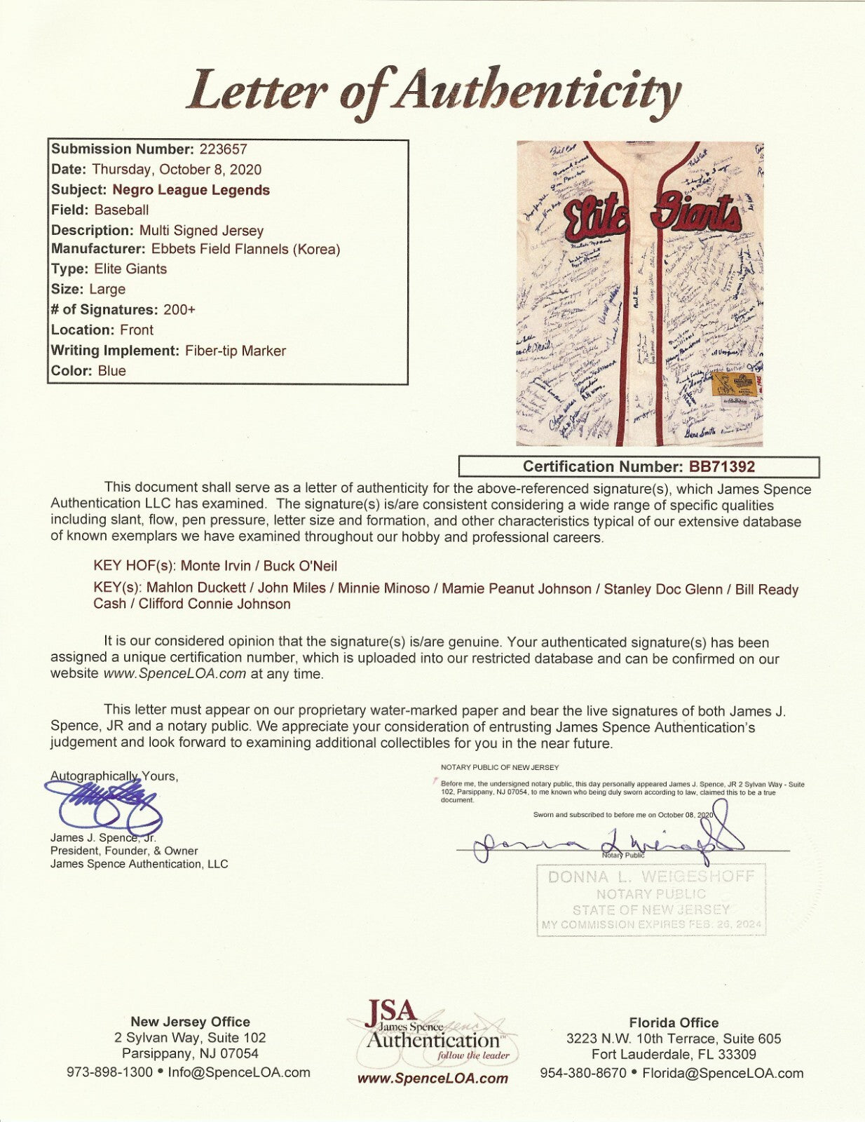 This Stall & Dean Elite Giants flannel jersey is signed by more than 200 former Negro League players. A few of the highlights include: Monte Irvin, Buck O'Neil, Minnie Minoso, Mahlon Duckett, John Miles, Peanut Johnson, Clifford Connie Johnson and many, more (see the images for a more complete list). The signatures are authenticated by JSA with a full LOA