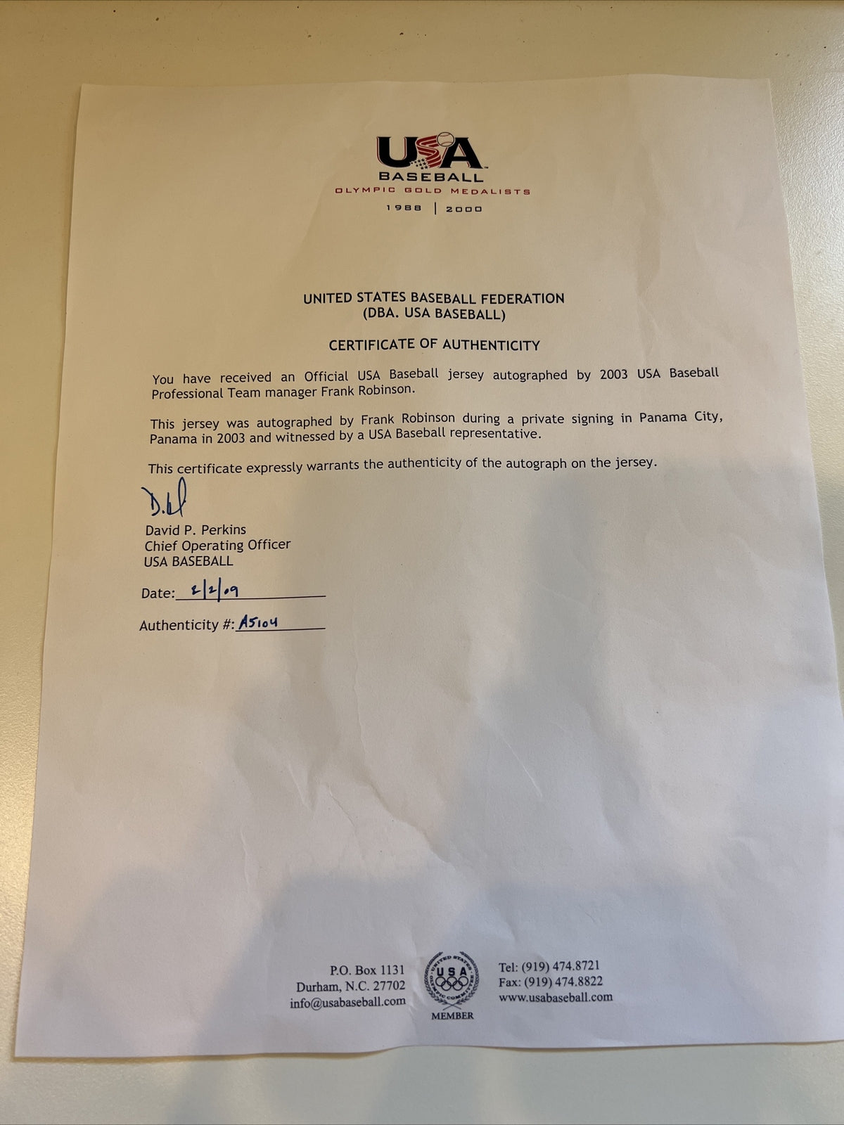 This USA Baseball home jersey is signed on the front by HOFer Frank Robinson. Robinson added his jersey number "20" under his black Sharpie signature, which is authenticated by BAS with a COA. Also has a COA from Team USA.