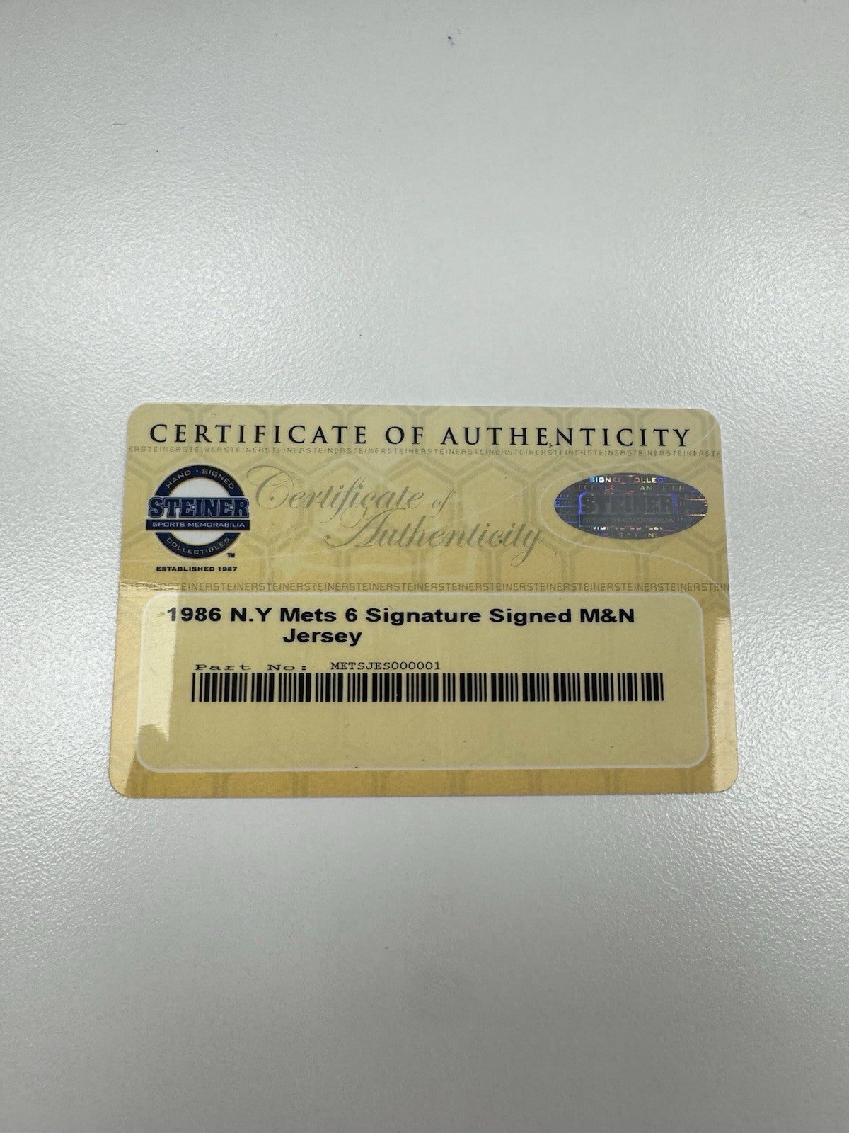 A Dwight Gooden Cooperstown Collection jersey signed by members of the 1986 team. The 6 players who have signed the jersey are Gary Carter, Mookie Wilson, Keith Hernandez, Doc Gooden, Lenny Dykstra and Jesse Orosco. Authenticated by Steiner Sports. And MLB Hologram.