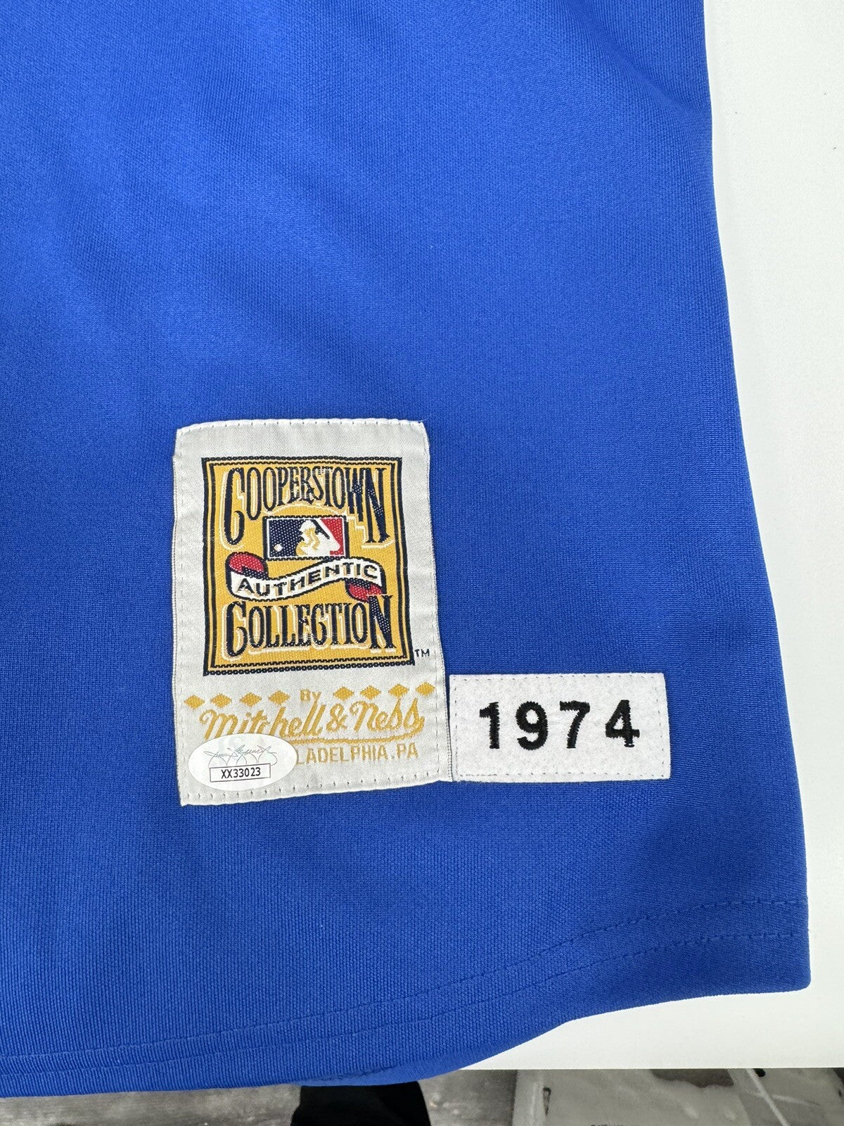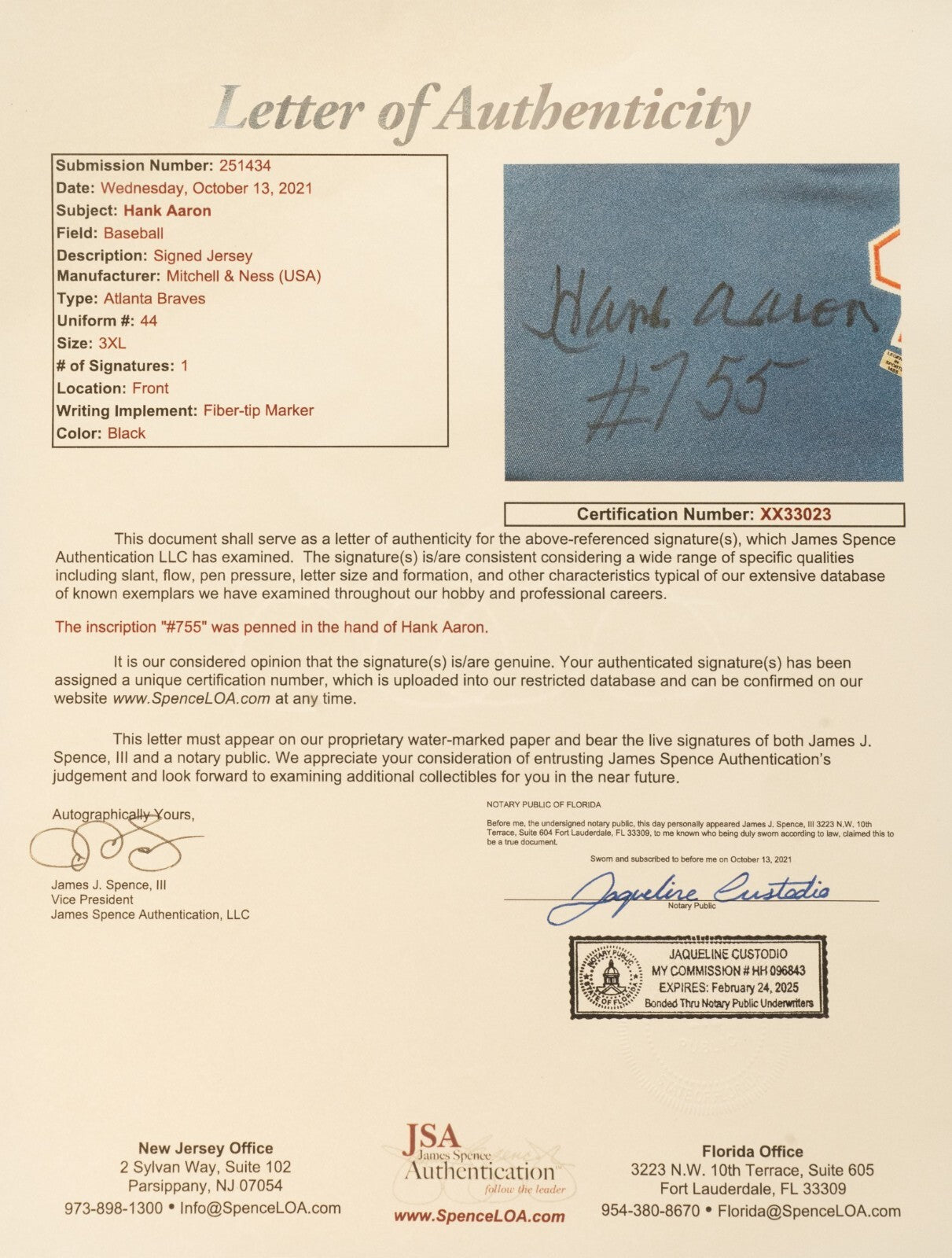 Atlanta Braves Hank Aaron Cooperstown Collection jersey signed by Aaron along the front in black marker. Aaron has added the inscription "755 HRs" next to his signature. The Mitchell & Ness jersey (size 3XL) is in Near Mint condition overall. Full LOA from James Spence/JSA.