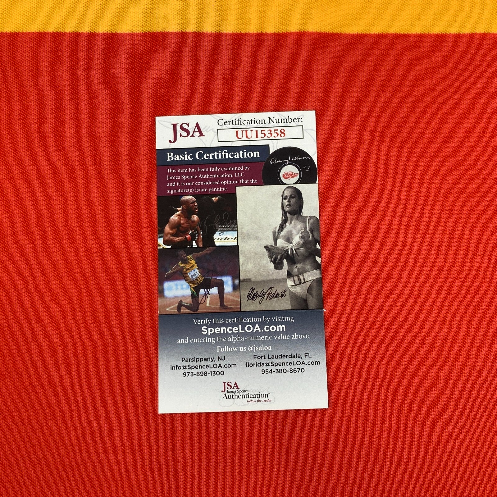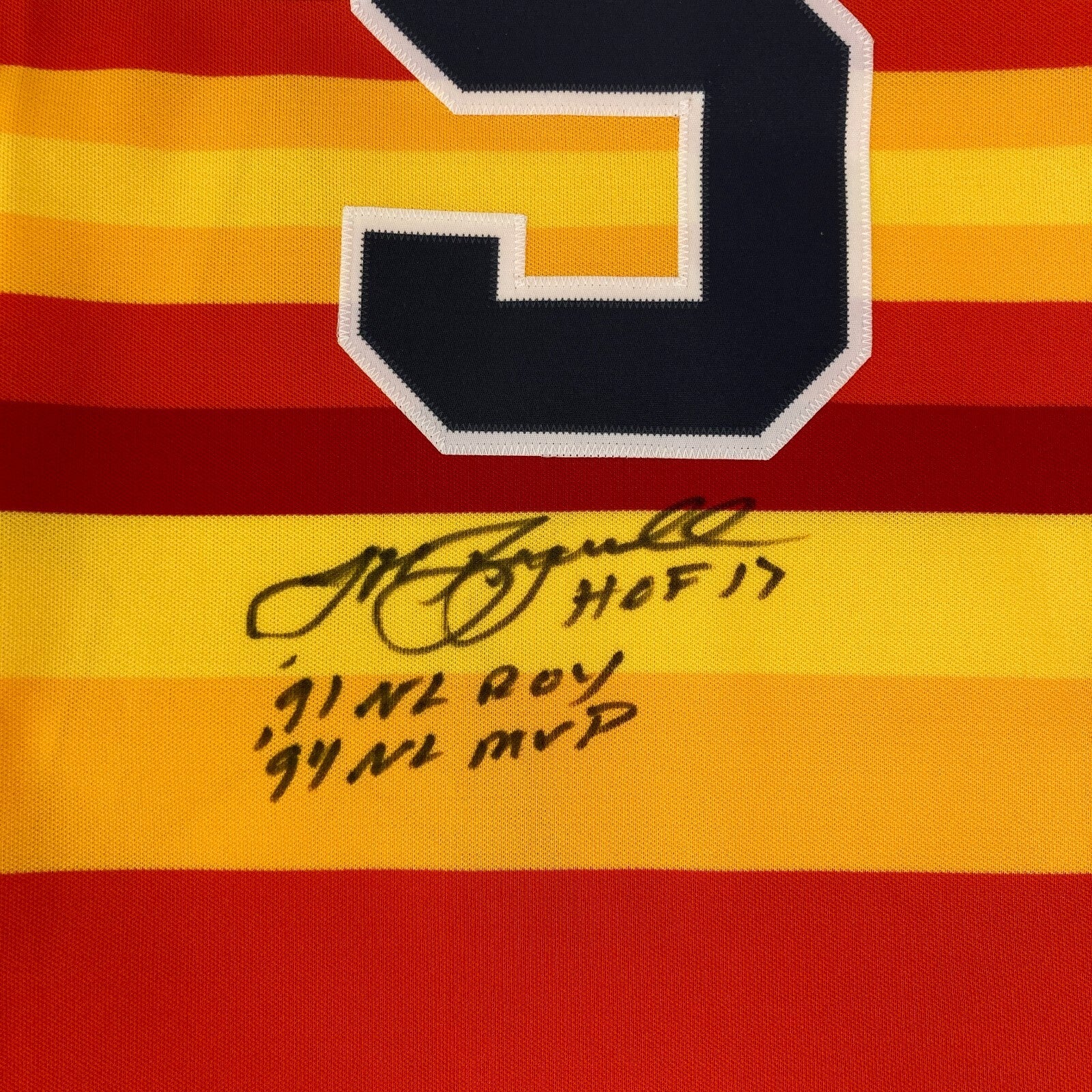 Jeff Bagwell signed and multi-inscribed Houston Astros jersey. Majestic "Cooperstown Collection" size L Astros #5 Jeff Bagwell jersey signed by Bagwell in black marker with "HOF 17" "91 NL ROY" "94 NL MVP" inscriptions.