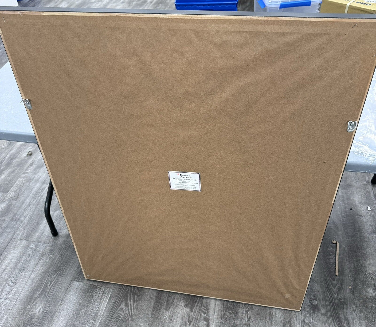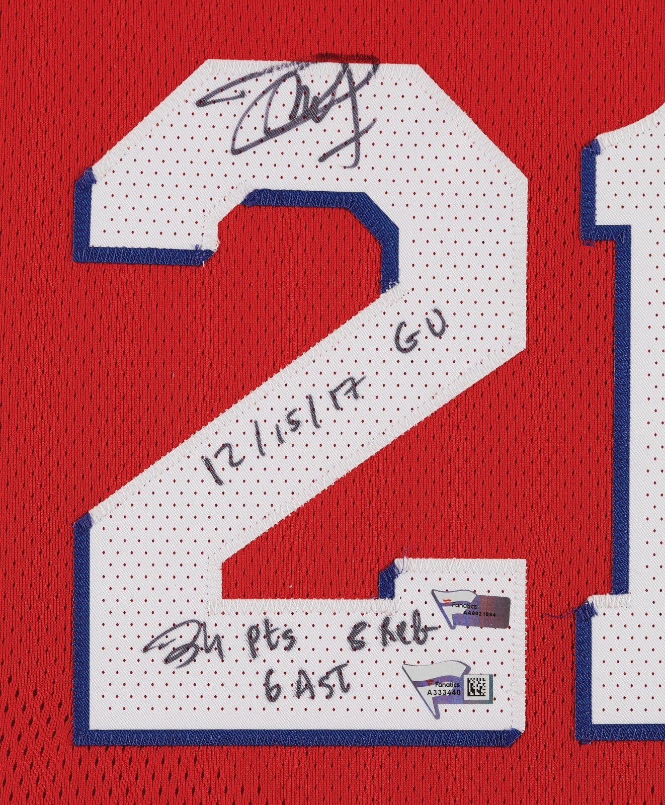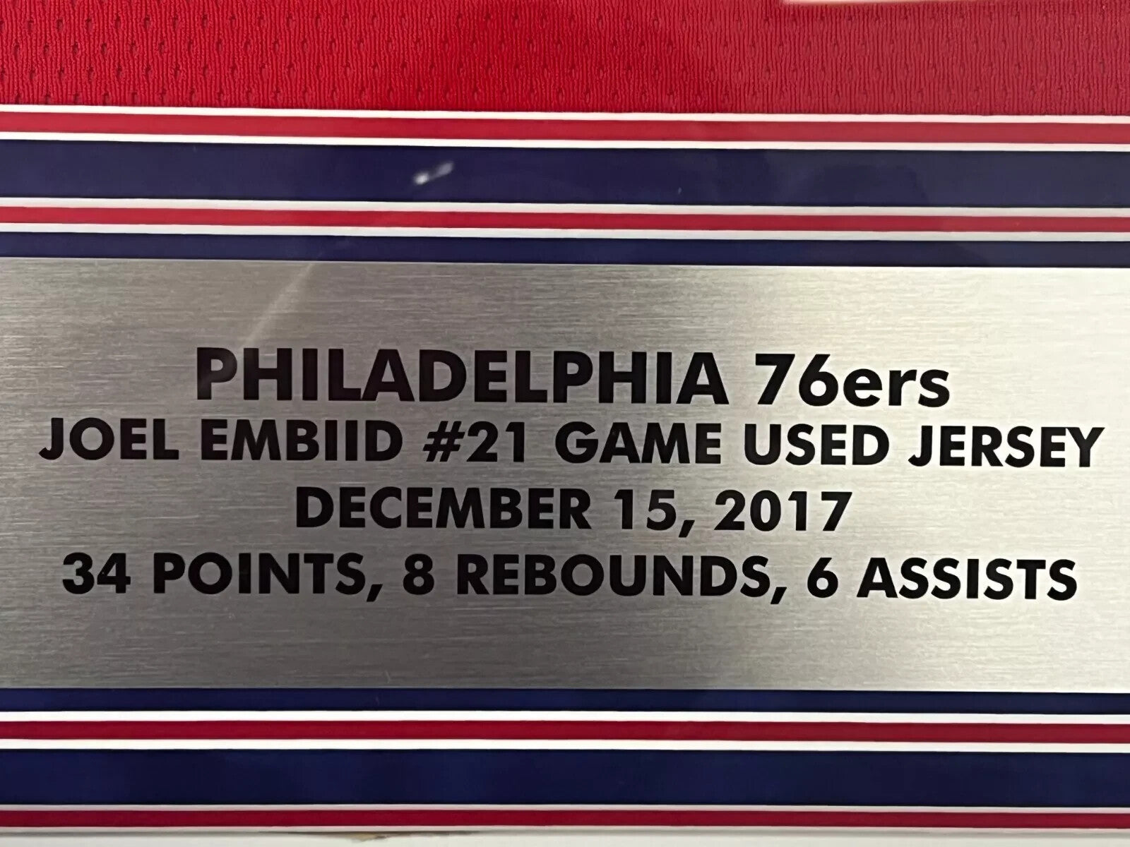 This 36x44 framed display features a game-used Philadelphia 76ers Joel Embiid. The jersey was used during a Dec. 15, 2017 game in which Embiid had 34 points, eight rebounds and six assists. Embiid signed his name on the back number "2" of his jersey number "21" in black Sharpie, adding his jersey number and "12/15/17 GU" and "34 Pts, 8 Reb, 6 Ast." The jersey arrives with two Fanatics holograms (A333440 and AA0021884) affixed to the back number "2." The Sixers would lose 119-117 in triple overtime to Oklahoma City. Pick up this great game-used jersey of the reigning MVP.
