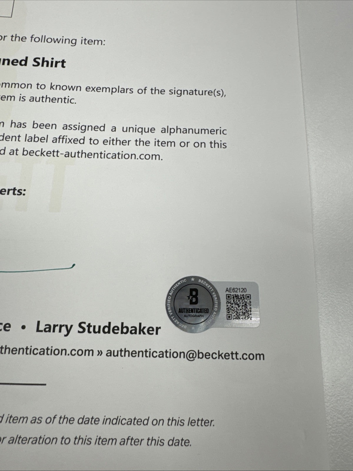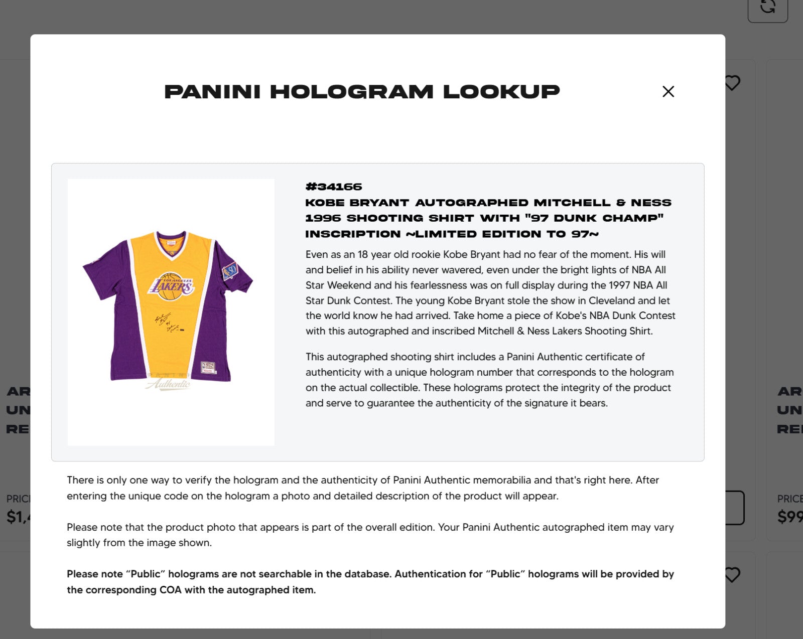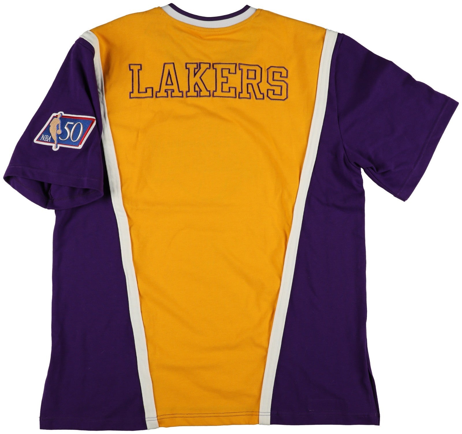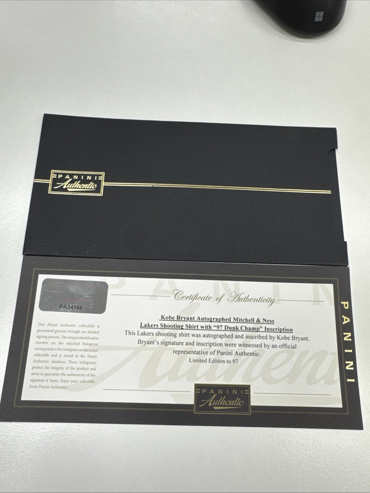 Presented is a Los Angeles Lakers Mitchell & Ness limited-edition (#41/97) shooting shirt that has been signed by NBA Hall of Famer and beloved basketball icon Kobe Bryant. Bryant has penned his flowing signature in black marker across the front of the shirt, along with the inscription "97 Dunk Champ." An NBA 50th Anniversary patch sits on the left sleeve of the shirt, while an NBA Logoman shirt sits on the right sleeve. The front left tail of the shirt features a Hardwood Classics Mitchell & Ness manufacturer's patch with an attached "48 (XL)" flag. COA from Panini, sticker from Fanatics, and full letter LOA from Beckett for signature.