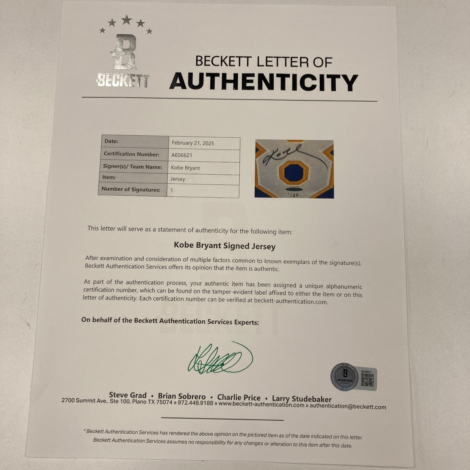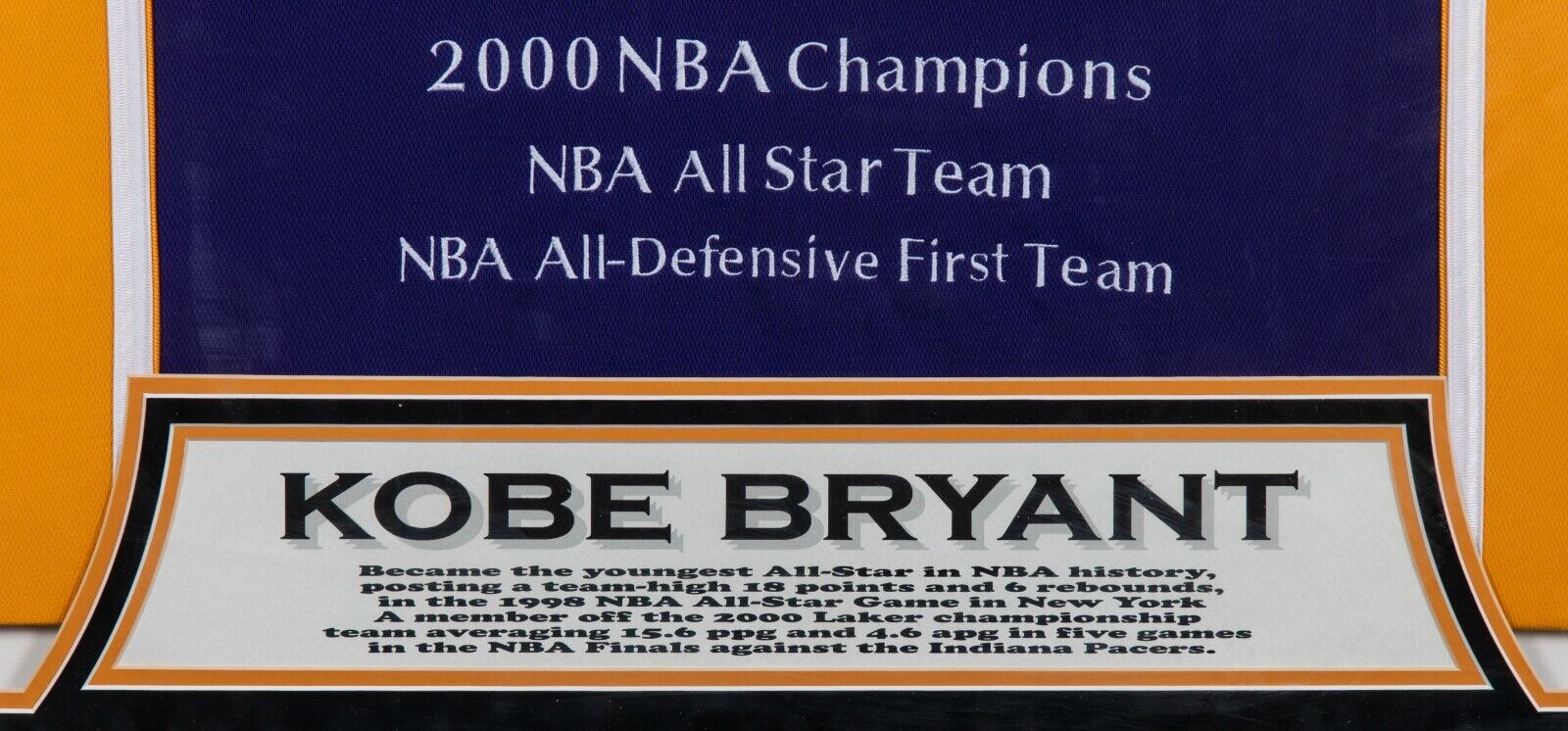 Presented is a 36-by-44-inch display featuring a Los Angeles Lakers 2000 NBA Champions All-Defensive First Team jersey that has been signed by beloved NBA figure and Hall of Famer Kobe Bryant. The jersey features a trio of Bryant's accomplishments—"2000 NBA Champions," "NBA All Star Team," "NBA All-Defensive First Team"—stitched in white lettering below the number "8" on the jersey's back, which has been signed by Bryant in black ink. The display comes in a lightly circulated black frame with a hologram from Upper Deck Authentication (BAG97509) and an LOA from Beckett for signature. The limited-edition piece is serial-numbered "1/50." Does not have UDA card.